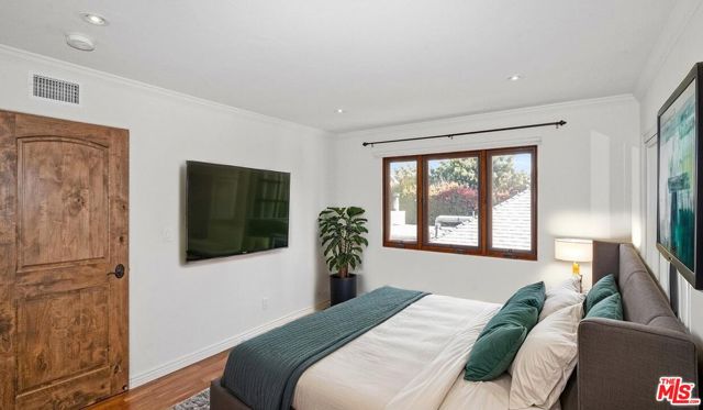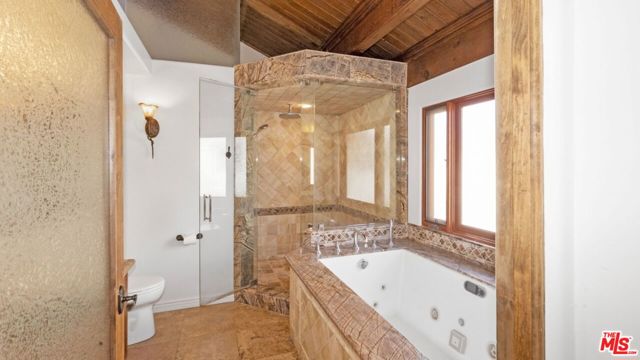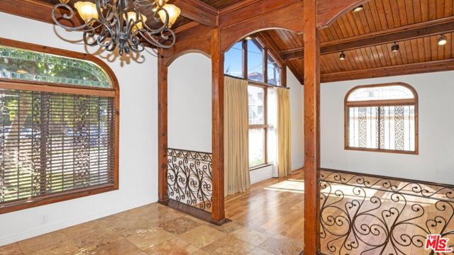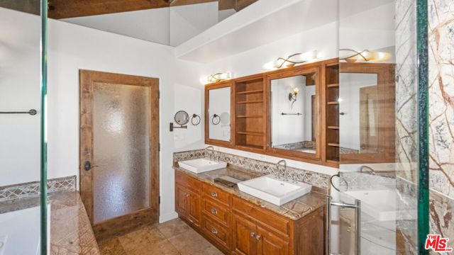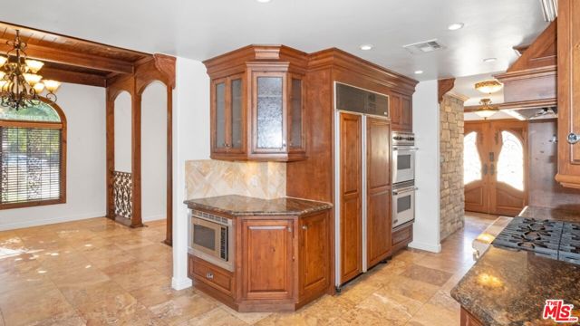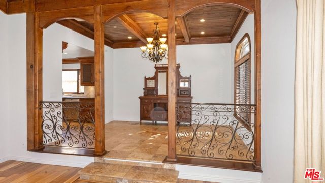 Welcome to 12841 Landale Street, a truly one-of-a-kind architectural residence nestled on a peaceful cul-de-sac in the heart of Studio City, directly adjacent to Beeman Park with its playgrounds, tennis courts, and outdoor recreation. Set on an expansive lot of over 10,000 square feet, this exceptional home offers approximately 3,000 square feet of thoughtfully designed living space combining dramatic architectural character, luxury upgrades, and rare recreational amenities, all just moments from Ventura Boulevard, the Sportsmen's Lodge Shops, renowned dining, boutique shopping, markets, and convenient freeway access. Inside, the home showcases stunning vaulted tongue-and-groove wood-beamed ceilings, rich hardwood and travertine flooring, arched beveled-glass windows, custom iron railings, and two beautiful stone fireplaces that create a warm yet grand living environment filled with natural light. The expansive main living room flows seamlessly into a full formal dining room and a gourmet chef's kitchen featuring granite countertops, custom hardwood and glass cabinetry with soft-close drawers, a hand-painted mural, and premium stainless steel appliances including a Viking cooktop and range, Sub-Zero refrigerator, Bosch dishwasher, and built-in carousel microwave. The flexible floor plan includes three bedrooms plus a converted fourth bedroom functioning as a mudroom, along with two luxurious primary suites with ensuite bathrooms, providing ideal accommodations for multigenerational living or guest privacy. Additional interior highlights include a spacious family room with soaring wood ceilings and fireplace, a dedicated home office with custom built-ins, laundry area with large-capacity LG washer and steam dryer, and a spectacular spa-inspired primary bathroom featuring dual sinks, a massive jacuzzi soaking tub, and a steam shower. One of the home's most unique features is its private indoor racquetball/pickleball sports court an extremely rare amenity for residential properties along with a third-floor entertainment deck offering magnificent panoramic Valley views, perfect for sunset gatherings or relaxing evenings. Outdoor spaces include private patios ideal for al fresco dining, built-in storage, and a pet-friendly environment. Additional conveniences include smart lighting throughout, central air conditioning, and two dedicated parking spaces. Offering an unmatched blend of architectural charm, recreational luxury, and prime Studio City location, this exceptional property delivers both privacy and accessibility in one of the Valley's most desirable neighborhoods.