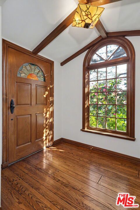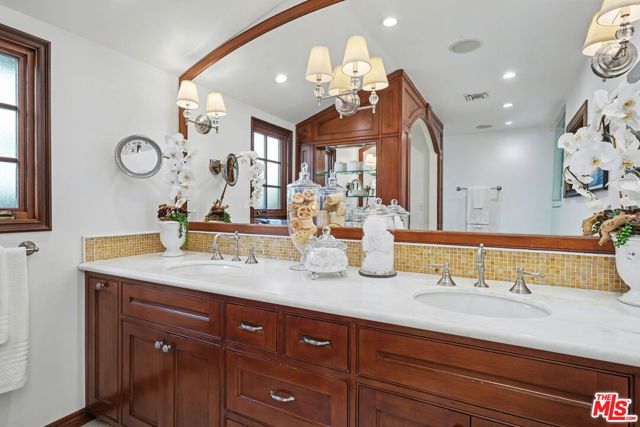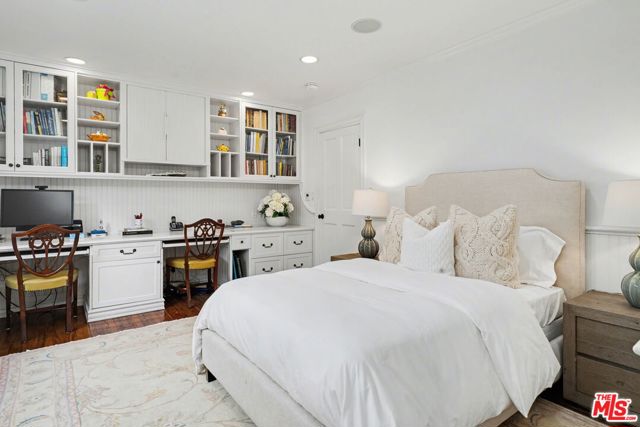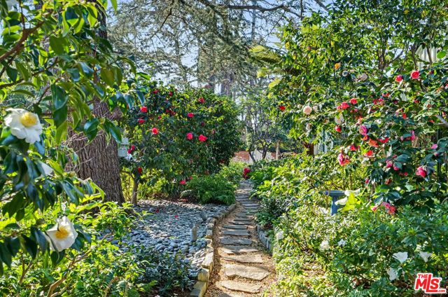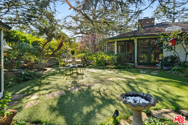 Offers to be received by Tuesday, 02/03 at 5 pm. Evoking the charm of Montecito's San Ysidro Ranch, this one-story traditional residence is set behind lush, mature landscaping in prestigious Brentwood Park. A covered front porch opens to a welcoming entry with a powder room and a spacious living room centered around a hand-carved fireplace, with large windows framing serene garden views. The formal dining room features a paneled butler's pantry that connects seamlessly to the spacious kitchen, which offers marble countertops, a butcher-block center island, double ovens, and a built-in brick barbecue overlooking the pool and grounds. The adjacent family room is an incredibly inviting place to relax, featuring high-beam ceilings, a charming fireplace, and built-in bookshelves. The resort-style pool was designed by renowned landscape architect Garrett Carlson and featured in a published work. The gardens are truly an exceptional sanctuary, with a koi pond, children's playhouse, and lush landscaping. A sunroom with soaring beam ceilings, a fireplace, and walls of glass provides seamless indoor-outdoor living. The primary suite overlooks the gardens and includes a spa-inspired bath with a steam shower. Three additional bedrooms offer flexible living, with one having direct outdoor access. Additional features include a two-car garage with direct access and a dedicated exercise space. Located on a private corner lot, which adds approximately 5,479 sqft of additional outdoor gated space. This rare single-level estate-style home offers warmth, privacy, and tranquility, moments from Brentwood's finest amenities.