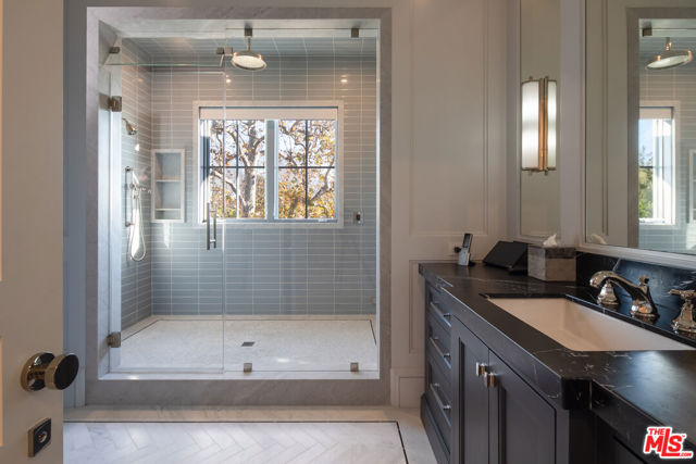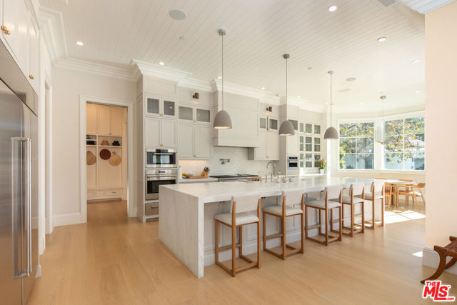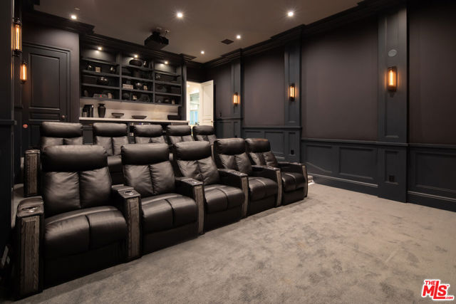 Situated on an over 18,000-square-foot lot in the heart of the Riviera, this stunning traditional estate offers over 10,000 square feet of living space, blending timeless architecture with today's open-concept indoor-outdoor lifestyle. Designed for exceptional flow and abundant natural light, the home lives beautifully for both everyday comfort and effortless entertaining and features an elevator to all three levels. On the main level, formal living and dining rooms are complemented by an open kitchen and family room; the true center of the home. Walls of pocket doors open directly to the backyard, creating seamless indoor-outdoor connection with views over the pool and grounds. The expansive chef's kitchen features generous bar seating, ample prep space, a bright breakfast area, and a windowed nook overlooking the yard, while a substantial butler's pantry supports entertaining at any scale. A mudroom and laundry room off the garage and an ensuite bedroom, currently used as an office, complete the level. Upstairs, the bedroom level is exceptionally bright, with an abundance of natural light throughout. The luxurious primary suite offers dual walk-in closets and two generously sized bathrooms. An adjoining room, currently used as an office, connects directly to the primary suite and includes its own bathroom; this space can easily be separated to function as an additional bedroom. Two more ensuite bedrooms complete the upper level, offering flexibility for a total of three or four bedrooms upstairs. The light-filled lower level is dedicated to recreation and wellness, featuring a large rec room, an impressive two-tier theater, a fully outfitted gym with steam shower and oversized sauna, a bar, and an expansive wine room with capacity for hundreds of bottles. An additional ensuite guest suite with separate entry provides ideal accommodations for visitors. Outside, the resort-style backyard is beautifully landscaped and designed for entertaining, with a sparkling pool and a pool house that opens directly to the pool and includes a full bathroom. Private, serene, and turnkey, this over 10,000 square foot Riviera estate presents a rare opportunity for refined California living in one of the most sought-after neighborhoods in all of Los Angeles.