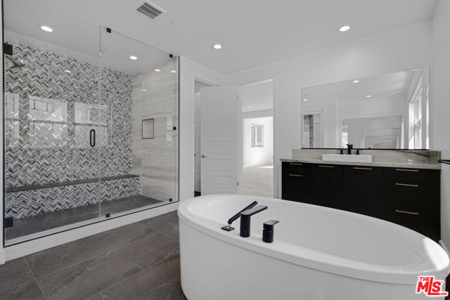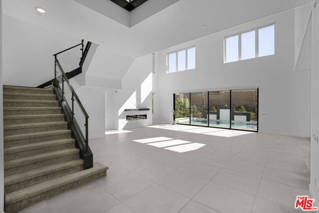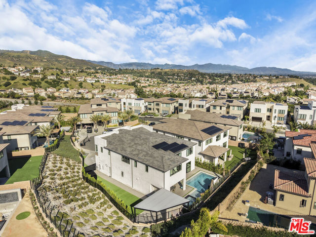 Ultra-Modern Two-Story Estate in Westcliffe, Porter Ranch. This extraordinary residence showcases the highly sought-after Santi floor plan from the prestigious Summit Collection in Porter Ranch's exclusive guard-gated Westcliffe community. Set on a private cul-de-sac and positioned on an oversized flat lot high in the hills, this spectacular estate offers luxury, privacy, and sophistication at every turn. This stunning open-concept home spans approximately 5,400 sq ft and features 5 bedrooms, 6 bathrooms, a spacious loft, flex space, and private office. What truly sets this estate apart is its unique location, expansive lot size, and incredible indoor-outdoor lifestyle. From the moment you enter, you're greeted by a majestic foyer with a dramatic glass staircase and exceptional designer finishes throughout. The home is filled with natural light, enhanced by expansive glass doors and oversized windows, showcasing the beautiful modern color palette and seamless flow. Highlights include stone tile flooring throughout the main level, an oversized great room with a striking 72-inch modern fireplace with color-changing crystals, and a showstopping chef's kitchen with a massive stone island, stone countertops, and top-of-the-line Sub-Zero and Wolf appliances. Elevating the living experience even further, the home is equipped with built-in speakers throughout for a seamless audio experience, electric window shades and owned solar panels.The luxurious primary suite is a true retreat, featuring a spacious sitting area, colossal walk-in closet, dressing area, and an exceptional spa-inspired designer bathroom. All four secondary bedrooms are ensuite, including one conveniently located on the first floor. Additional versatile spaces include an office/media room and fitness gym.Step outside to your own private resort. The spectacular backyard is designed for elevated entertaining and everyday enjoyment, complete with a luxury designer pool and jacuzzi, custom pergola creating the ultimate outdoor lounge..perfect for enjoying a movie under the stars or hosting unforgettable game nights in a resort-style setting, outdoor BBQ, large side area.. an expansive wraparound yard with ample space to relax, host, and enjoy the best of Southern California living. There is also generous parking space, adding to the home's rare functionality and appeal.Located in one of Porter Ranch's most affluent and sought-after communities, Westcliffe offers newly built luxury estates behind a guarded gate entrance. This prime location is just moments from The Vineyards at Porter Ranch, featuring Whole Foods, AMC luxury theater, Nordstrom Rack, fine dining, award-winning schools, and convenient access to the 118 freeway. Be sure to check out the virtual walkthrough video of this exceptional home.