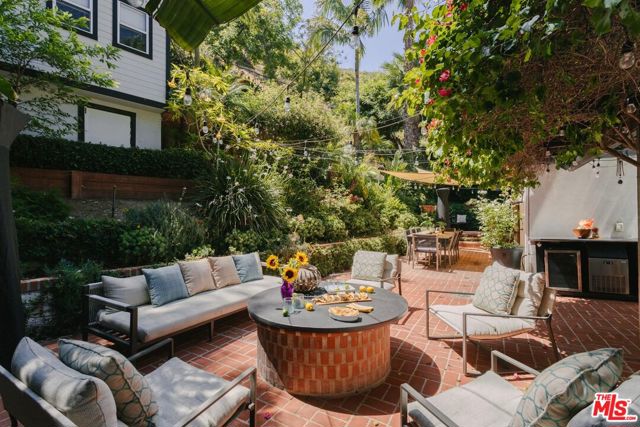 Step into this beautifully updated, fully fenced, gated, and private home nestled in Outpost Estates, famously known as "The Jewel in the Hills." This residence offers a perfect fusion of timeless elegance and contemporary urban lifestyle. Spanning 3,301 square feet, this home is designed for those who seek space, style, and entertainment. It boasts four en-suite bedrooms, ensuring privacy and comfort for all. One of these bedrooms is currently adapted as a versatile room for entertainment or leisure, seamlessly opening to the front yard. This setup creates an ideal space for outdoor enjoyment and provides a delightful area where pets can roam freely. The chef's kitchen, with state-of-the-art stainless-steel appliances and a large center island, is ideal for cooking and entertaining. The primary bedroom is a true retreat, offering two walk-in closets and a spa-like bathroom with an oversized tub, separate shower, and dual vanities for relaxation and elegance. The expansive living area, featuring a cozy wood-burning fireplace and French doors, opens to a landscaped private backyard with a brick patio. A large fire pit provides a warm gathering space, perfect for entertaining alongside convenient barbecue setups. This property layout harmoniously blends greenery and functionality for seamless indoor and outdoor living. The home includes a detached office/flex room for work and leisure needs. Dual-paned windows enhance energy efficiency and quietness, while smart home technology controls lights, thermostats, and security for an enhanced living experience. Situated in a vibrant neighborhood, you're moments from top-tier restaurants, nightlife, and movie theaters. Close to The Hollywood Bowl for concerts and events, and the hiking trails of Runyon Canyon for active pursuits. With easy access to public transportation, a highly walkable neighborhood, and proximity to freeways, Downtown LA, the Valley, Hollywood, and Beverly Hills, commuting and exploring are convenient. This exceptional home combines style, comfort, and convenience in one of the city's most sought-after locations. Embrace the opportunity to make this captivating residence your own slice of paradise.