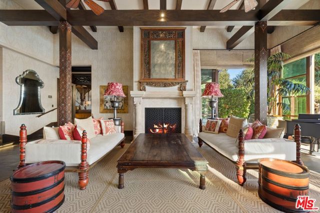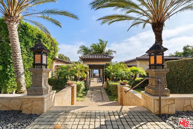 With breathtaking views, Bali-inspired design, and every contemporary comfort, this magnificent estate is a serene sanctuary for exquisite living and impressive entertaining. The private, gated property of over 1.2 acres extends from PCH to Malibu Road, perfectly landscaped and commanding expansive ocean views. A long palm-lined drive leads past a two-story, two-bedroom guesthouse, a lighted north-south tennis court and pavilion, and a fountain, waterfall, and gardens before arriving at the enormous motor court and four-car garage. A dramatic gateway and long, serene palm-lined reflecting pool lead between the wings of the U-shaped house to the gorgeous double-door entry. With interiors designed by Martyn Lawrence Bullard and stunning sight-lines to the ocean, the house is detailed with ornate wood carving, very tall beamed ceilings, wood and stone floors, and full-width exterior doors that vanish to offer seamless flow between indoors and out. The entry steps down to the formal living room, which includes a generous dining area, a pair of facing fireplaces, and a wall of glass that opens onto a roomy patio with a fireplace, stunning ocean view, and a nearby fountain and barbecue island. Adjoining the living room is a spectacular ocean-view great room that includes a family room with fireplace, dining area, and a gourmet kitchen with a huge stone-topped island with seating, deeply recessed tray ceilings, beautiful cabinetry, and a pantry. One wing of the house has two bedrooms and a laundry room. The other wing features a majestic ocean-view owner's retreat with high wood beamed ceilings, beautiful wall coverings, wood floors, and a wide glass doorway opening to a tranquil covered patio. A hallway leads to a luxurious bath, two very large closets/dressing areas, and, at the end of the hall, a resplendent Bali-inspired library/study with high coved ceilings, a wall of built-in book shelves and cabinets, a fireplace, and doors to the patio and to a private sitting area. The home's lower level features a party-perfect bar room highlighted with ornate metalwork that encloses a large wine storage area. The bar extends into a spacious tiered home projection theater. A long hallway leads to a second powder room, a changing room, and another bar, which opens to the lower patio, spa, sitting areas, and lawns, as well as the infinity ozone pool, patio, cabana, and private steps to Malibu Road and access to the beach/ocean. With Crestron electronics and full-house water filtration, this remarkable estate is a livable legacy.