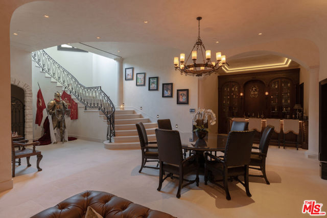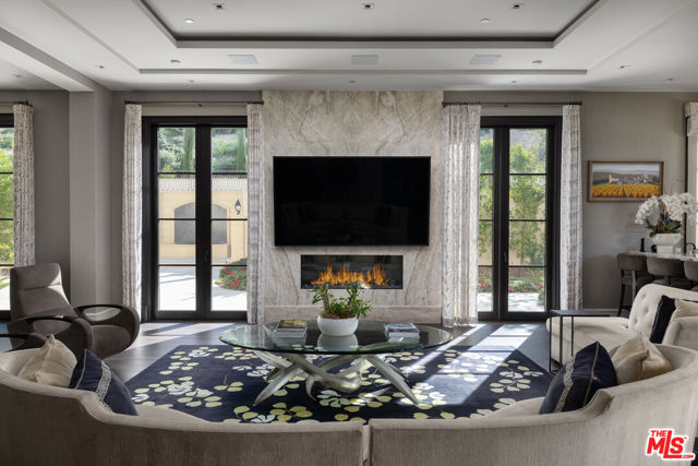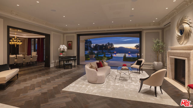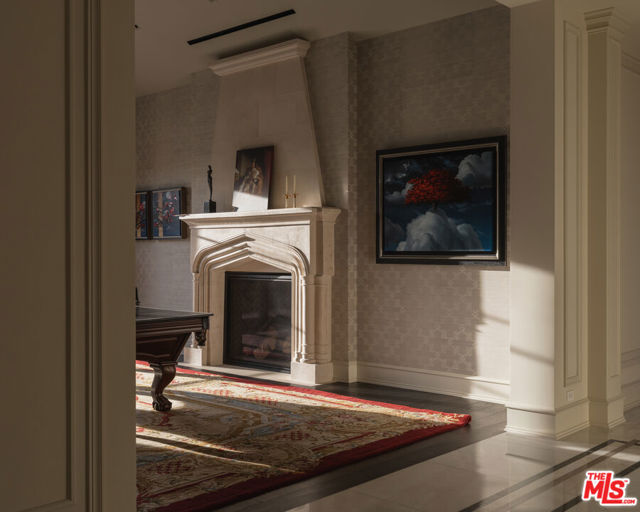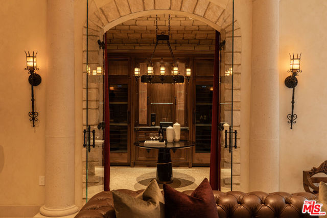 Behind the double gates of The Estates at The Oaks, this majestic residence offers rare privacy and sweeping, unobstructed views across the rolling hills of Malibu. Set at the end of a long, quiet driveway, and spanning over two acres, the property evokes a European country estate, thoughtfully built over more than a decade with exceptional care and intention. Traditional craftsmanship is showcased through hand-selected stone, custom wall treatments, intricate moldings, and layered tile work, with bespoke wallpaper, paneling, and millwork sourced from JP Weaver Company. The architecture feels timeless yet current, anchored by a grand arrival court with a scaled stone fountain and an entry aligned perfectly with the horizon. Inside, soaring domed ceilings, wide hallways, and sweeping bronze staircases frame endless vistas and create a striking sense of arrival. The main level unfolds through a seamless blend of formal and informal spaces. A monumental entry leads to an elegant lounge with a Spanish limestone fireplace opening to the gardens, while a Louis XIV inspired dining room with custom French wall coverings overlooks the grounds. The chef's kitchen flows into the family room, bar, and fireside gathering areas, finished with refined European details and a full suite of Miele and Wolf appliances. Dual library offices with concealed bath and Minotti cabinetry, a vaulted game room opening to outdoor entertaining areas, three guest suites with outdoor access, and a glass-wrapped gym with steam room and massage suite complete the level. Wraparound terraces extend the living spaces outdoors, ideal for both entertaining and quiet retreat. Upstairs, five bedroom suites surround a grand landing, including an exceptional primary suite with vaulted ceilings, a private living room, domed office, dual spa-caliber bathrooms, expansive closets, and a sweeping terrace with outdoor fireplace overlooking Malibu State Park. A secondary primary offers similar scale with its own foyer, stone fireplace, soaking tub, and private terrace. The lower level features a 5,225 sq. ft. air-conditioned garage, a French-inspired cinema with fiber-optic ceiling and Dolby Atmos sound, an entertaining lounge with bar, wine cellar and tasting room, and a private beauty salon. The grounds unfold as a series of curated experiences, including tennis, pickleball, and bocce courts, a solar-heated ozone pool, dramatic fire pits, and a fully equipped outdoor pavilion with dual BBQs, pizza oven, bar, and integrated bathrooms. A vegetable garden adds a quieter rhythm to the property. Above it all, an elevator-accessed rooftop deck offers uninterrupted 360-degree views across the entire community. The estate is engineered for longevity and sustainability with advanced HVAC, whole-home water purification, solar power, fire-resistant construction, a full backup generator, and a triple-phase electrical system guided by Vastu and feng shui principles for balance and clarity.