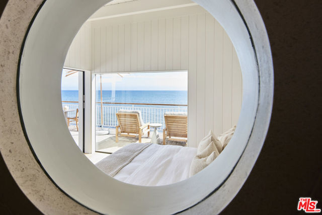 Located on the private Escondido Beach Road, this move-in-ready Mid-Century beachfront residence sits on 50 feet of coveted Escondido Beach. Recently and meticulously reimagined by design team Warren Garrett, the newly completed home blends timeless materials with modern amenities throughout. The turnkey property offers 4 bedrooms and 4.5 baths, two levels of oceanfront decks, and a striking French grey plaster pool just steps from the sand. Positioned near the end of a private street, the home enjoys privacy and separation from Pacific Coast Highway while remaining moments from Geoffrey's Restaurant and a scenic beach walk to Paradise Cove Beach Cafe. The clean exterior opens to panoramic ocean views, white oak floors, exposed beam ceilings, and an open-concept gourmet kitchen featuring an Italian limestone island, La Cornue range, stone shelving, and new high-end appliances. Three en-suite bedrooms are located on the main level, with a fourth bedroom, full bath, and secondary bar and kitchen on the lower level, ideal for beach and poolside entertaining. Available fully furnished and move-in ready with all new Jenni Kayne Home furnishings. ***Seller financing available***