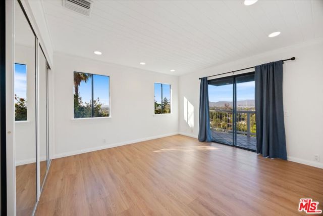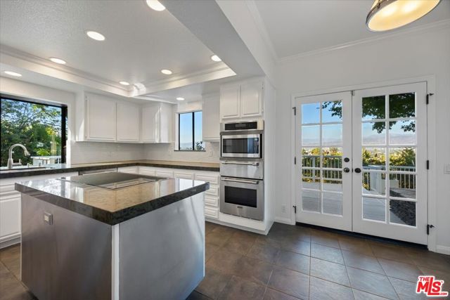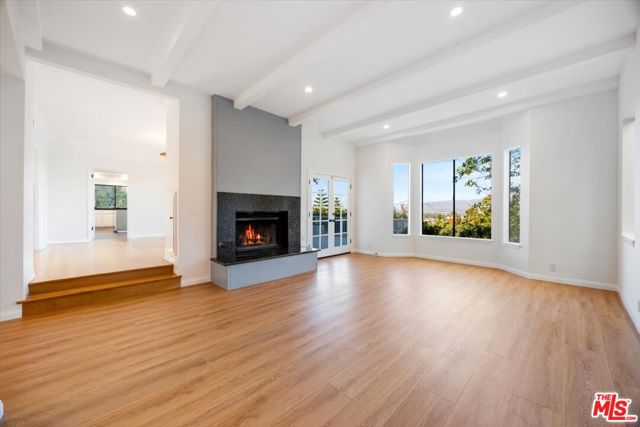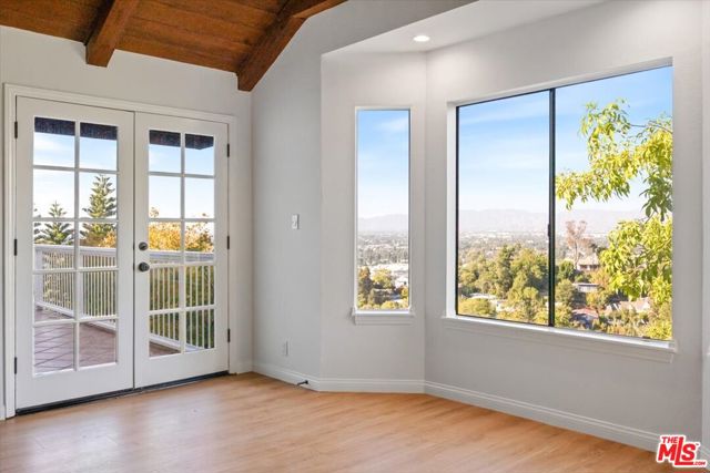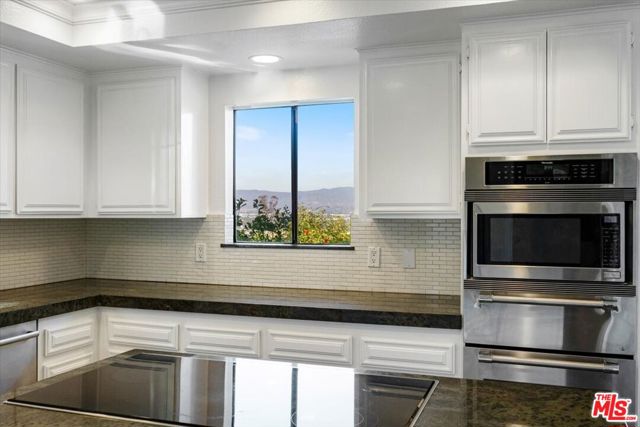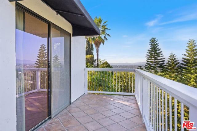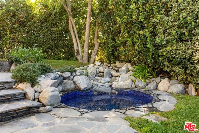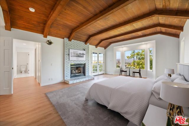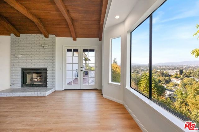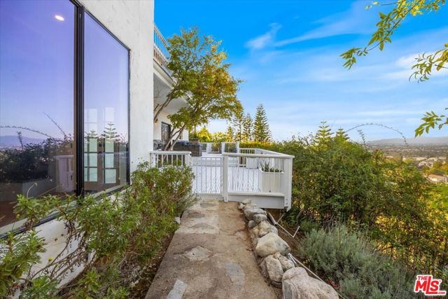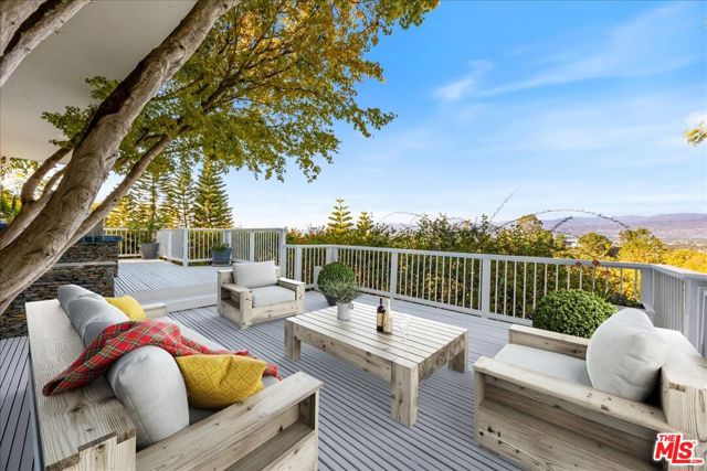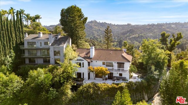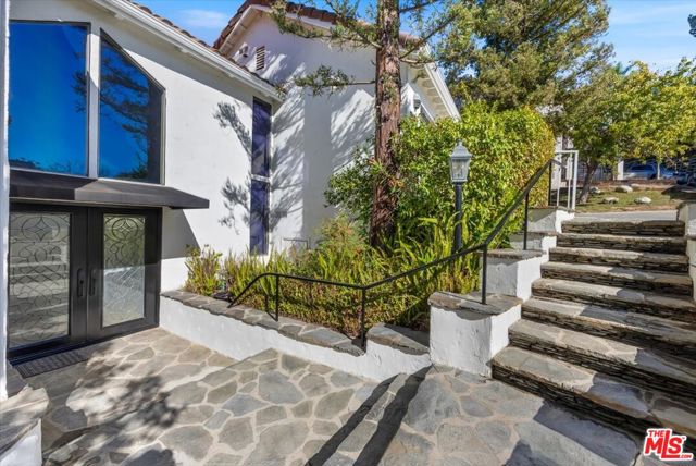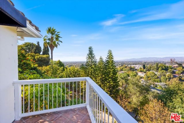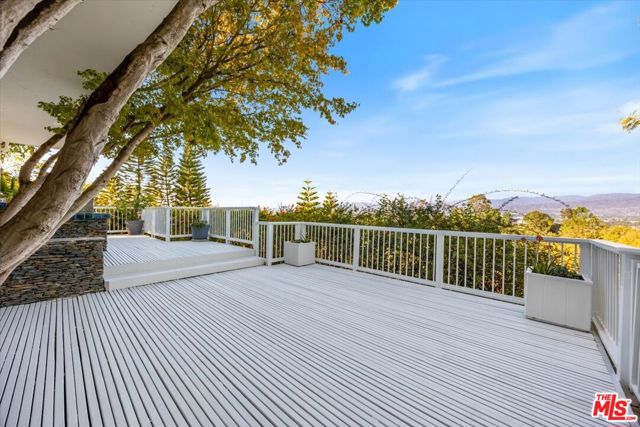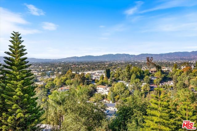 This exquisite 4-bedroom, 3.5-bathroom home, located in a 6 home gated community, high up in the serene hills of Studio City south of Ventura Boulevard. Enjoy breathtaking panoramic views of the Valley all the way to the Santa Susana mountains. The updated kitchen boasts high-end appliances, including a Bosch dishwasher, Thermador induction cooktop, oven, and microwave, a KitchenAid refrigerator and trash compactor. The formal dining room is filled with natural light and offers a gorgeous view of the outside deck, which overlooks the hillside and features a built-in BBQ and refrigerator perfect for gatherings with friends and family. The spacious living room features a charming brick fireplace. Designed for entertaining, the family room includes a river rock fireplace, wet bar, wine cooler, and French doors that open to an in-ground waterfall spa, easily controlled with Aquatic control technology, and surrounded by a lush grassy area. The enormous primary suite features a brick fireplace, dual walk-in closets, an en suite bathroom with double vanity sinks, a separate water closet, a walk-in shower, a large soaking tub, and a balcony with stunning valley and mountain views. Additional amenities include a 3-car garage with extra parking for three more vehicles on the driveway, an alarm system, Nest thermostat, and a ChargePoint Home Flex Level 2 EV Charger. Perfect for those seeking privacy and tranquility, the property is surrounded by large hedges and spa/fountain features, creating a peaceful escape from city life. Enjoy close proximity to trendy restaurants and chic boutiques, all within the desirable Carpenter School District.