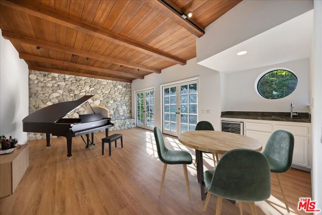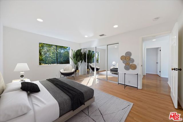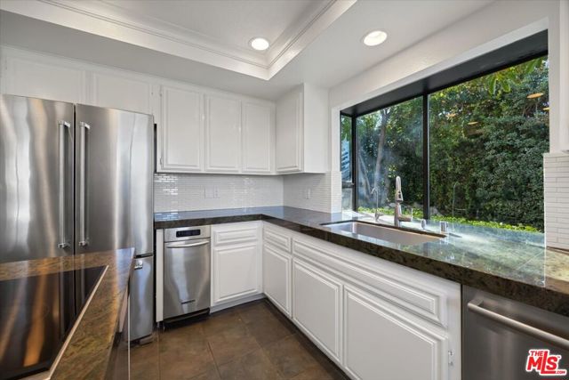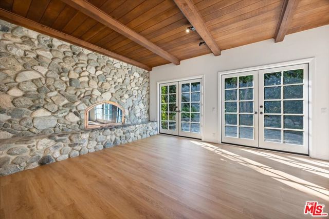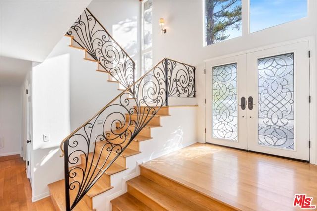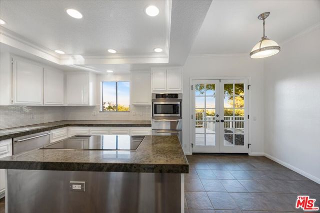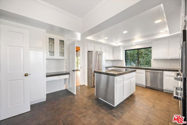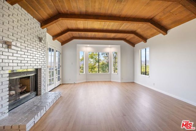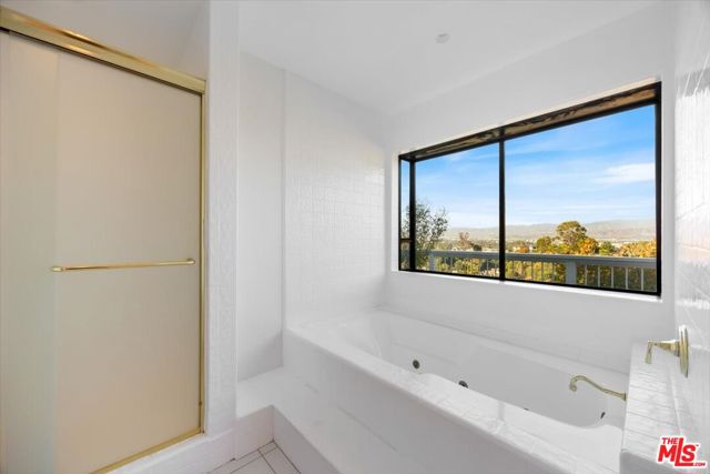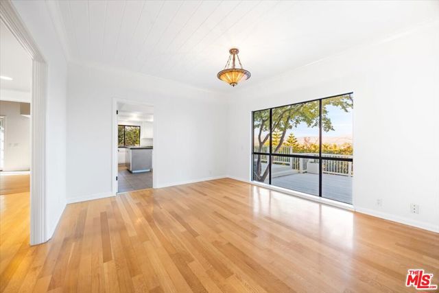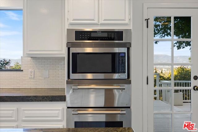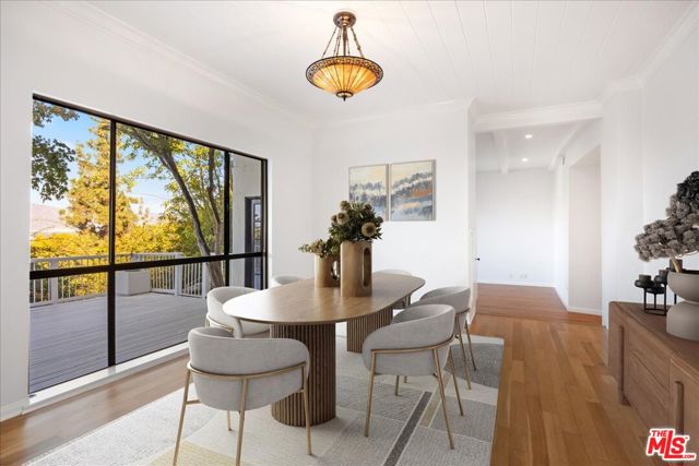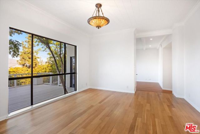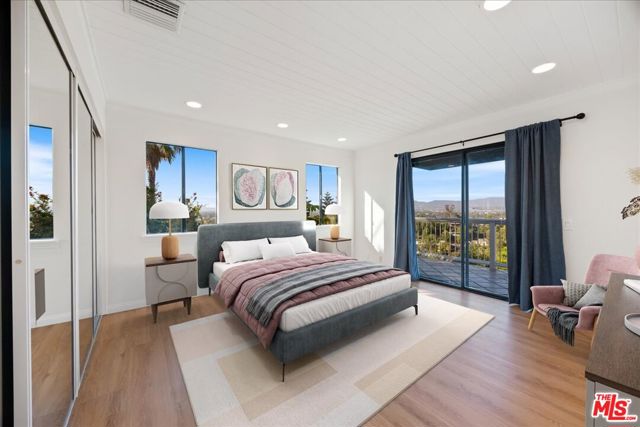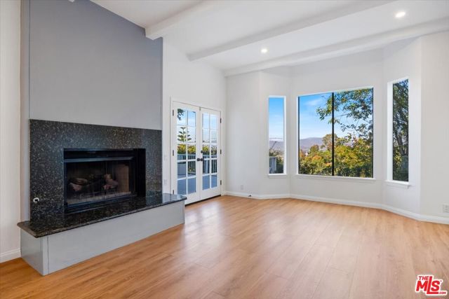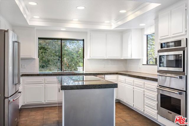 This exquisite 4-bedroom, 3.5-bathroom home, located in a 6 home gated community, high up in the serene hills of Studio City south of Ventura Boulevard. Enjoy breathtaking panoramic views of the Valley all the way to the Santa Susana mountains. The updated kitchen boasts high-end appliances, including a Bosch dishwasher, Thermador induction cooktop, oven, and microwave, a KitchenAid refrigerator and trash compactor. The formal dining room is filled with natural light and offers a gorgeous view of the outside deck, which overlooks the hillside and features a built-in BBQ and refrigerator perfect for gatherings with friends and family. The spacious living room features a charming brick fireplace. Designed for entertaining, the family room includes a river rock fireplace, wet bar, wine cooler, and French doors that open to an in-ground waterfall spa, easily controlled with Aquatic control technology, and surrounded by a lush grassy area. The enormous primary suite features a brick fireplace, dual walk-in closets, an en suite bathroom with double vanity sinks, a separate water closet, a walk-in shower, a large soaking tub, and a balcony with stunning valley and mountain views. Additional amenities include a 3-car garage with extra parking for three more vehicles on the driveway, an alarm system, Nest thermostat, and a ChargePoint Home Flex Level 2 EV Charger. Perfect for those seeking privacy and tranquility, the property is surrounded by large hedges and spa/fountain features, creating a peaceful escape from city life. Enjoy close proximity to trendy restaurants and chic boutiques, all within the desirable Carpenter School District.