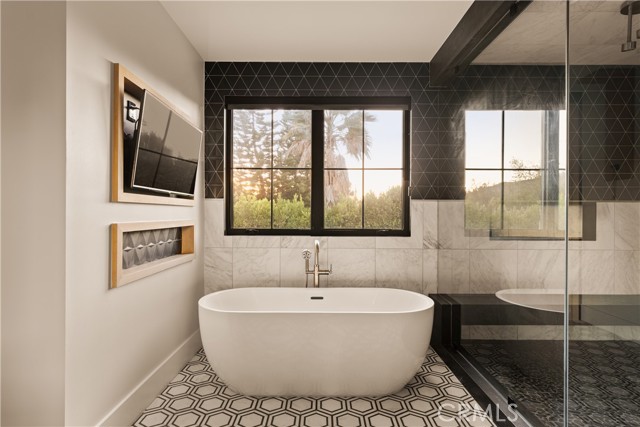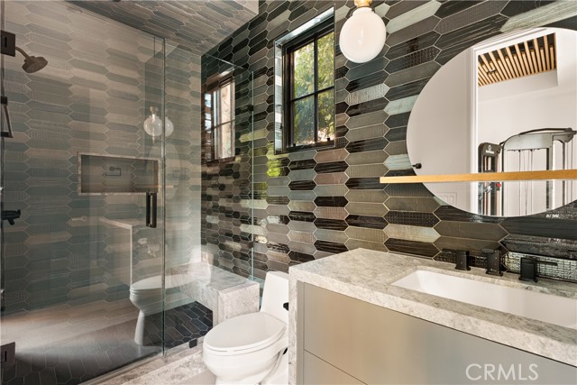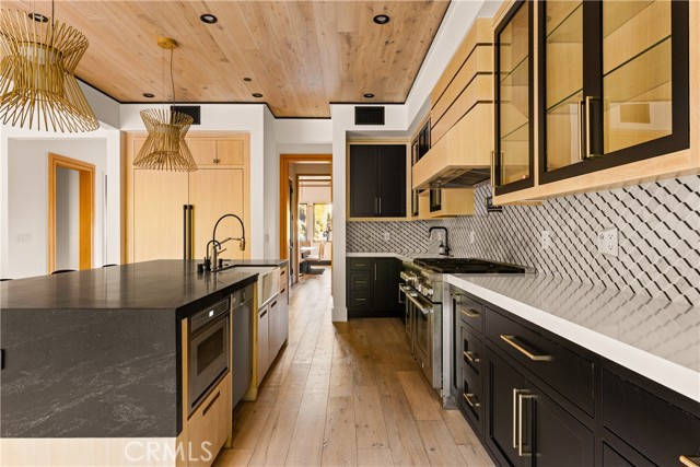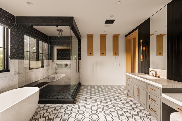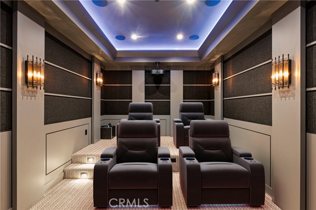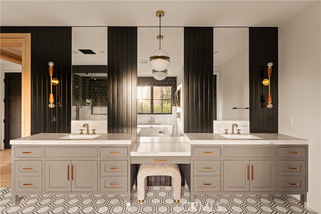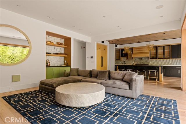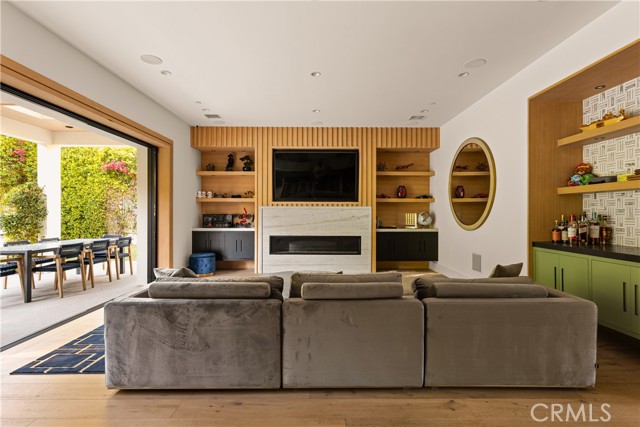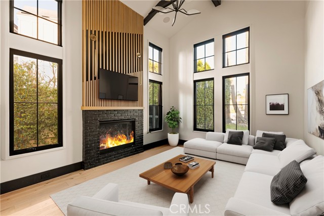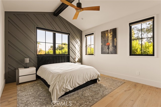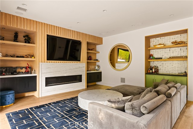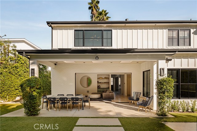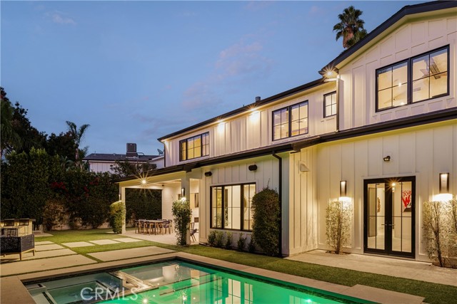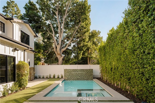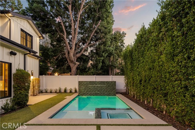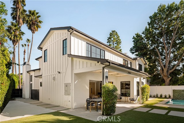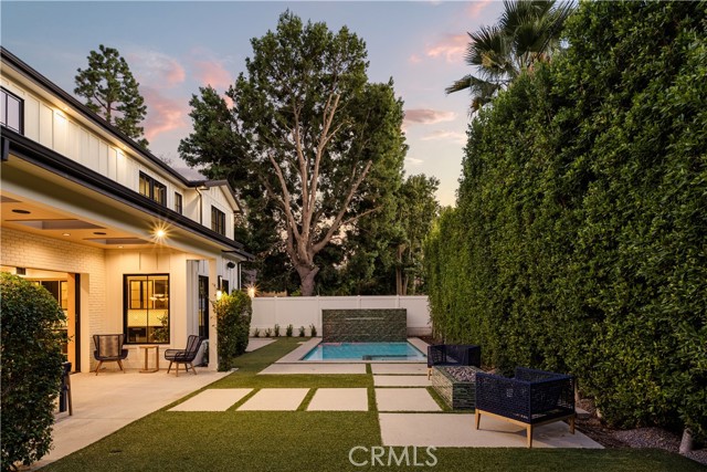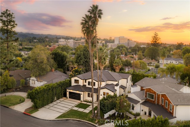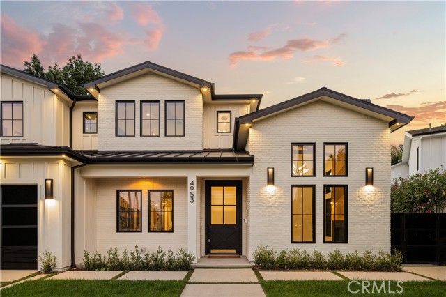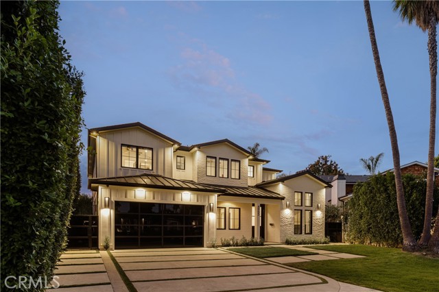 Tucked away on a peaceful cul-de-sac, this stunning Contemporary Farmhouse offers 5 bedrooms, 5.5 bathrooms, and over 4,500 square feet of luxurious living space, showcasing timeless design and exceptional craftsmanship throughout. The grand entry opens to a bright, open layout featuring a formal dining room adorned with custom wood detailing and a bar/butler’s area with a walk-in pantry. Across the hall, the formal living room impresses with vaulted ceilings, abundant natural light, and a striking fireplace framed in white oak paneling that extends to the ceiling. Beyond the elegant staircase, the open-concept family room and chef’s kitchen blend seamlessly with the backyard through expansive pocket doors, creating the perfect indoor-outdoor flow for year-round entertaining. The family room features built-in cabinetry, white oak accents, a stone fireplace, and a 75-inch TV for relaxed living. The adjoining gourmet kitchen is a showpiece with Thermador appliances, custom cabinetry, intricate tile work, a breakfast nook, and a large eat-in island. The lower level also includes a theater and an en-suite guest bedroom currently used as a gym. Upstairs, the primary suite serves as a serene retreat with vaulted ceilings, a marble fireplace, dual walk-in closets, and a spa-like bathroom featuring marble tile, dual vanities, a soaking tub, and an oversized rain shower with a built-in bench. Three additional en-suite bedrooms and a laundry room complete the upper level. The private backyard is an entertainer’s paradise, boasting lush landscaping, a pool and spa, BBQ area, fire pit, and grassy play space. Ideally located within the Hesby Oaks School District and minutes from the 101/405 freeways and vibrant Ventura Blvd, this home captures the essence of modern California living.