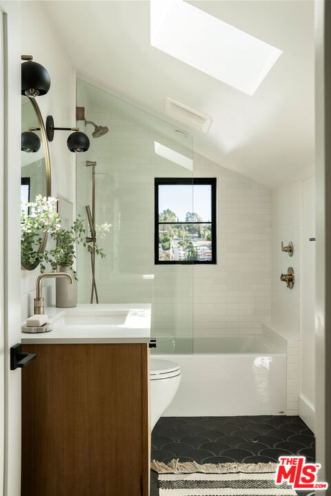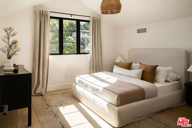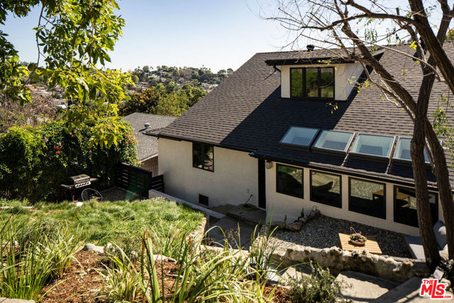 Nestled on a quiet cul-de-sac, this architecturally reimagined home blends elevated design with thoughtful upgrades throughout. A fully gated entrance and long private driveway offer privacy and ample parking, while a flat grassy lawn with mature fruit trees leads to a charming covered front porch. Redesigned with the help of 1000xBetter and Counsel Design, the first floor features an open-concept living and dining area flowing into a chef's kitchen with custom cabinetry, high-end appliances, and a row of windows and skylights that frame the cascading backyard greenery. Also on the main level is a sunlit primary suite with a spa-like bath featured in DWELL magazine, plus an additional bedroom ideal for guests or a home office and a full bath. Upstairs offers three additional bedrooms, a full bath, oak hardwood floors, and generous storage. The lush backyard provides neighborhood views and multiple spaces to lounge and entertain, all just moments from the shops and restaurants of Highland Park, Eagle Rock, and Pasadena.