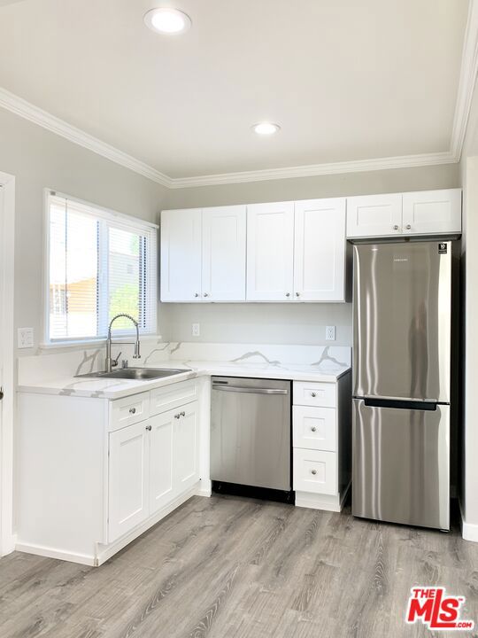 Fantastic fully remodeled one bedroom apartment for lease in very well maintained quiet building. Modern bungalow style ground floor unit is one story is easy to access and close to everything Glendale has to offer. Home features open floor plan, new hardwood syle plank floors, recessed lighting, spacious living room, and dining area. Home has custom paint, new blinds and Washer and Dryer in unit. Kitchen has new white cabinetry, quartz countertops and all brand new stainless steel appliances including a refrigerator. Bedroom is spacious with ceiling fan and mirrored closets. Best feature is small back pati/yard for relaxing, gardening and BBQ'ing off of kitchen. One assigned parking space. Available now! Pets ok.