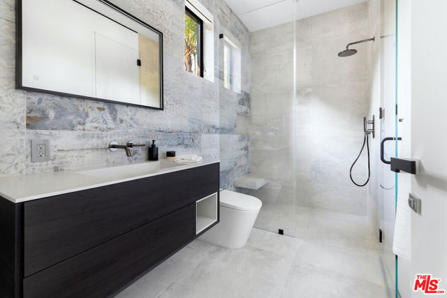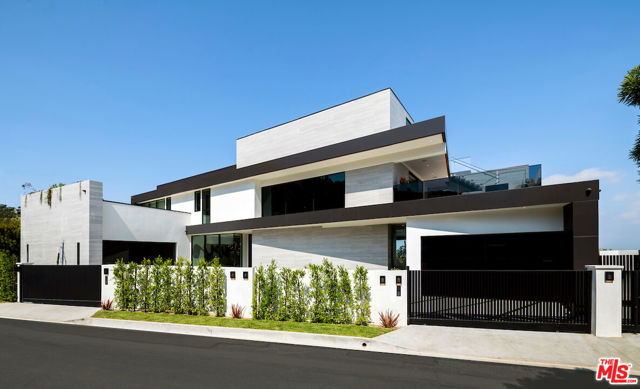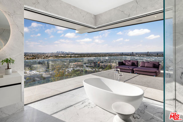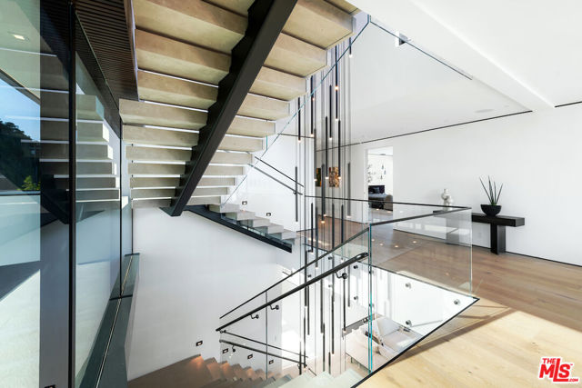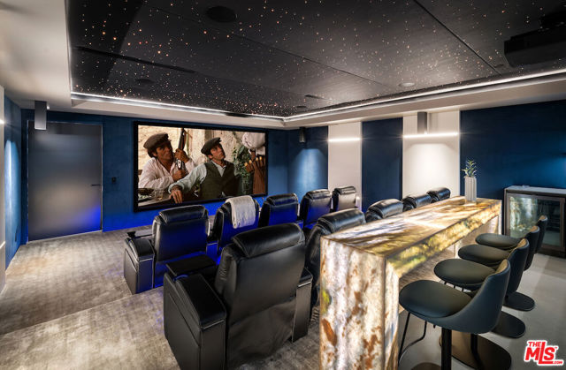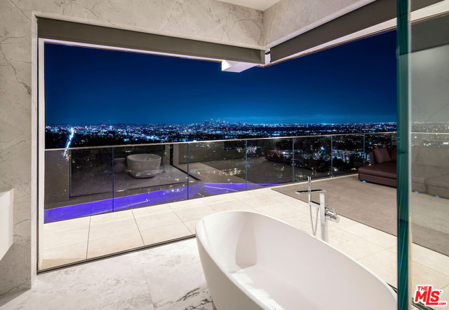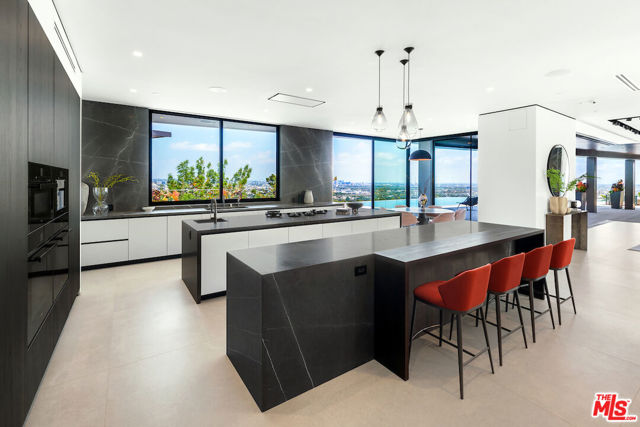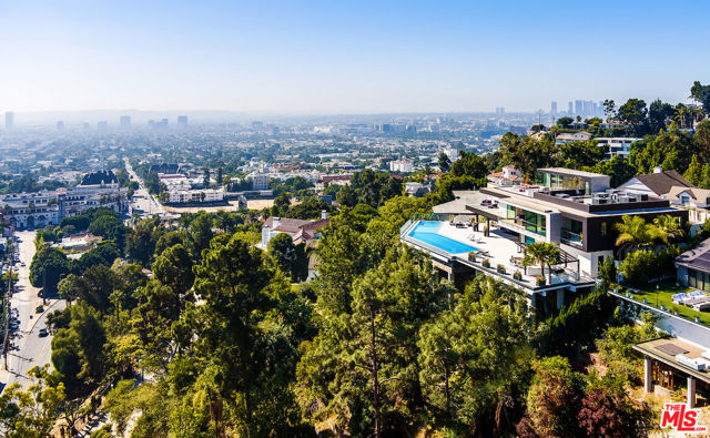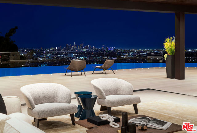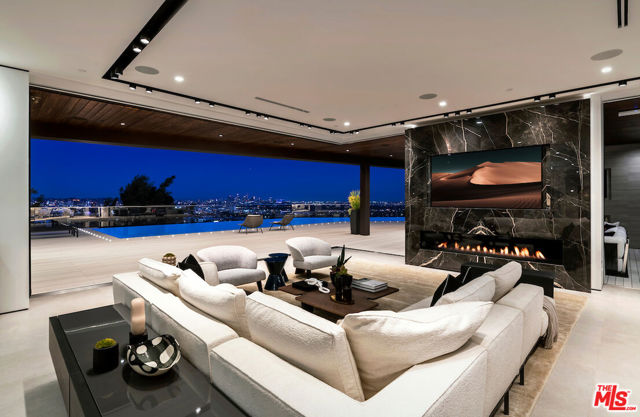 Situated in a prime lower hillside location above the renowned Chateau Marmont, this newly constructed residence offers the epitome of luxury Los Angeles living. Past a double gated motor court, the home's modern steel, stone, and glass facade opens to a truly luxurious interior created by award-winning Nathalie M Designs that is filled with disappearing walls of glass, architectural clean lines, European Oak Wire Brushed floors, 6,399 square feet of deck space, and thoughtful high-end finishes. A functional open layout includes the main living area, grounded by an impressive stone fireplace, and grand dining area, both intended to take in the uninterrupted skyline views. A contemporary dual island kitchen with a secondary dining area sits open to both the main living and dining areas, outfitted with custom two-tone cabinetry, beautiful shadowy stone waterfall surfaces, and seamless top-grade appliances. A designer butler's pantry, guest powder room, secondary ensuite bedroom, and car gallery round out the main level. Sliding glass walls pocket seamlessly from the main living area for uninterrupted access to the outdoor deck and picturesque zero-edge pool with spa, designed with intricate tiles and a relaxing shallow sundeck. Glass railings allow for every opportunity to take in the views, while a covered lounge area and bar-edged outdoor kitchen provide ample entertainment areas. The upper level of the home includes the dazzling primary suite, crafted with a stunning stone-facade fireplace, purposeful wet bar, substantial custom closet, a stone-wrapped spa grade bathroom, and of course, glass pocket walls to access the private patio and take in the incredible views. A plush lounge area, outdoor patio, and three secondary bedrooms all featuring ensuite designer bathrooms and some including private outdoor spaces, complete the top floor of the residence. Accessed via floating staircase from the second level outdoor patio, or interior elevator which is accessible to all floors and rooftop, the pinnacle of the property features an expansive rooftop deck, outfitted with a full outdoor kitchen, gas firepit, and glass railings for an epic vantage point. At the lower level of the home, a secondary living area contrasts sleek white walls with a magnificent book matched stone fireplace and entertainment area, ultimately leading to two additional secondary bedrooms with designer ensuite bathrooms, a plush galaxy-ceiling theater, designated laundry room, and resort-level spa, complete with oversized soaking tub, glass enclosed shower, and stone steam room. Additional aspects of the home include a second garage, intricate lighting to accent key architectural features, a state-of-the-art surround sound system, top of the line smart home technology, and an impressive fully equipped home security system.