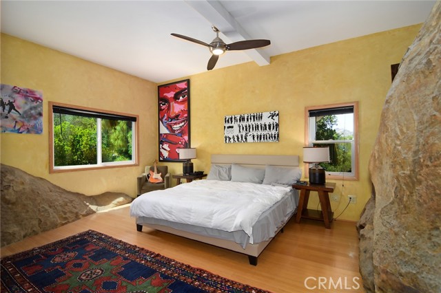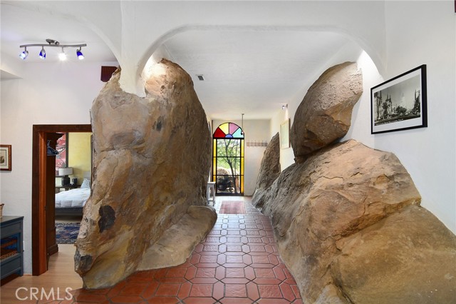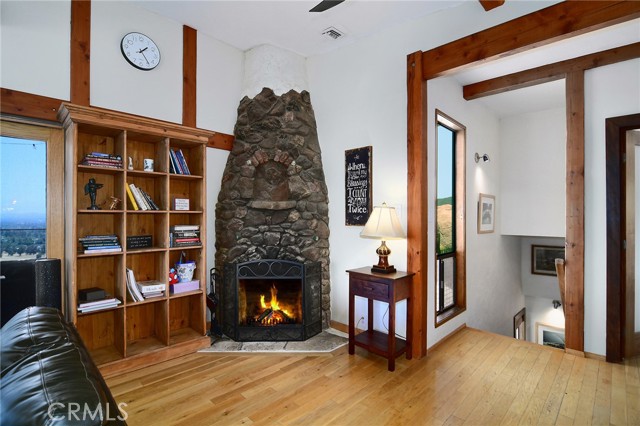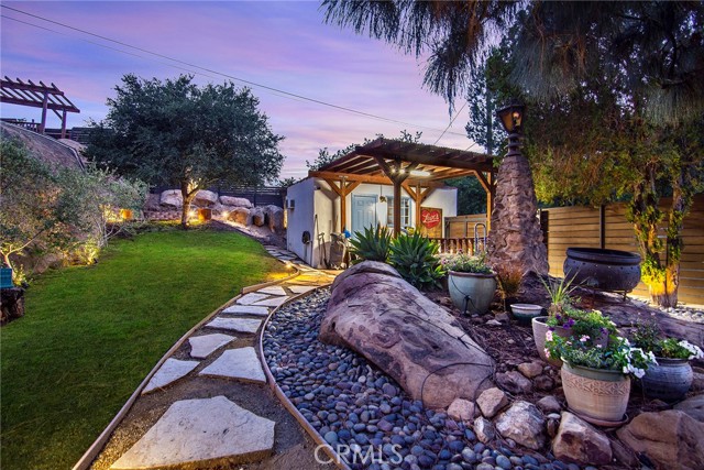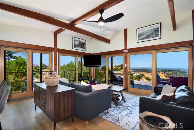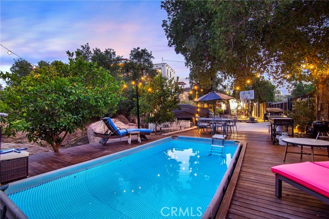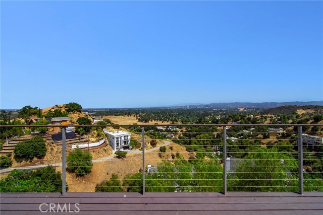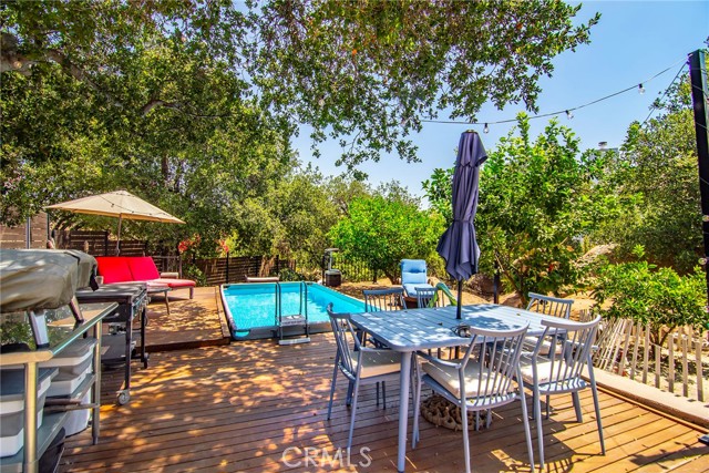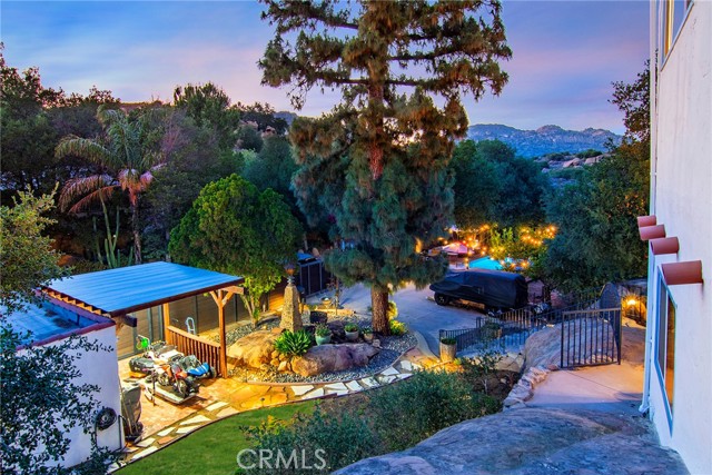 Hollywood Hills charm meets tranquil canyon living in West Hills. This one-of-a-kind Spanish adobe home is perched atop a sandstone ridge, offering unobstructed 360-degree views of the entire San Fernando Valley. Inside, you’ll find 3 bedrooms and 3 full baths across an open-concept floor plan featuring vaulted ceilings with exposed wood beams, creating a warm and airy ambiance. Enjoy seamless indoor-outdoor living with expansive sliding glass doors that open to a wraparound deck, sun deck, and a stylishly integrated above-ground pool with custom wood decking—perfect for relaxing, entertaining, or cooling off beneath the trees. The charming yard and sitting areas offer peaceful spaces to unwind while soaking in canyon and valley views. Modern upgrades include solar panels, a 200-amp electrical panel, landscape lighting, and a dedicated electrical panel by the pool. The property is fully fenced with dense Mangaris wood, and includes two sheds for extra storage, a one-car detached garage with carport, and ample parking. Smart home features include five Ring security cameras, a remote-controlled thermostat, and a WiFi-enabled deadbolt at the front gate, all easily managed from anywhere. Set at the end of a quiet, no-through street, this home offers ultimate privacy, European character, and direct access to incredible hiking trails. Other highlights include a mesh Wi-Fi system indoors and out, majestic oak trees, and the convenience of a main sewer connection (no septic). This rare architectural retreat seamlessly blends character, nature, and modern amenities.