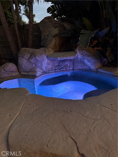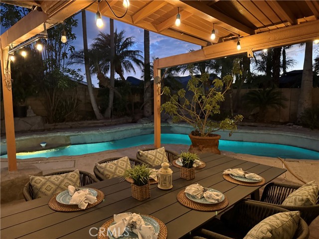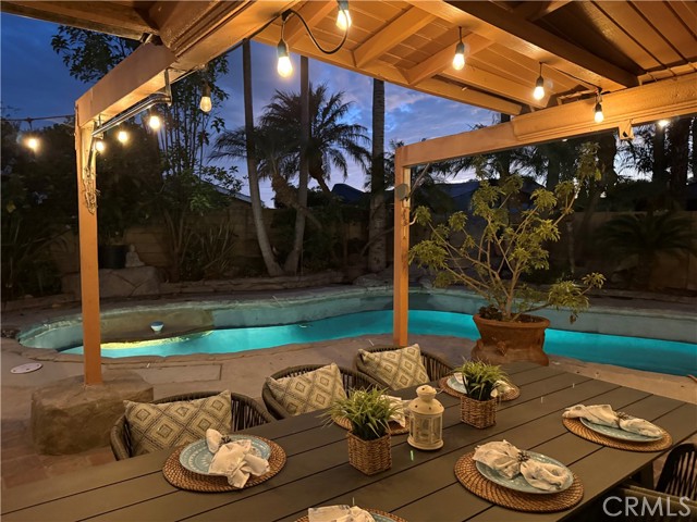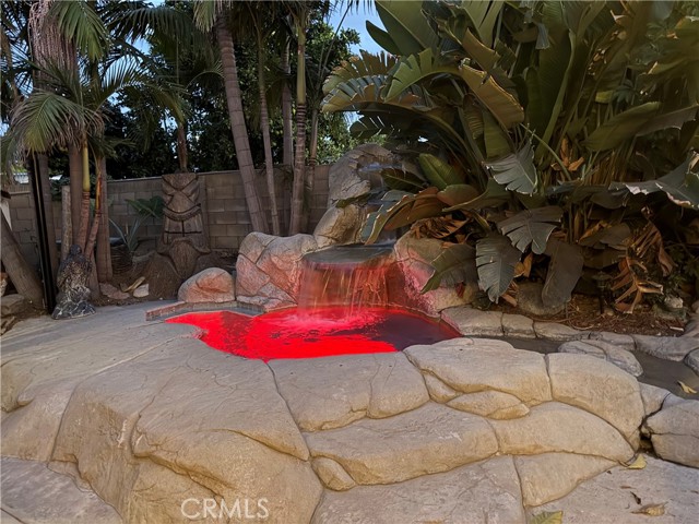 Absolutely unique and highly upgraded Spanish-style single story home on an interior cul-de-sac street just 4 miles from the beach and walking distance to neighborhood park with tennis, featuring 3 bedrooms, 2 baths, 1,509 square feet, finished garage, and an incredible 40-foot covered RV parking area with gated access—ideal for RV, boat, OR build an ADU - Home Comes with CITY APPROVED BLUEPRINTS for ADU. This home is an entertainer’s dream, inside and out, showcasing a stunning tropical oasis backyard with sparkling pool and spa set into natural boulders, waterfalls, river feature connecting spa to pool, lava fire pit, extensive outdoor lighting, two covered patios, a wrap-around wet bar, built-in Lynx BBQ center with river rock surround, stamped concrete and paver decking, and lush mature landscaping with palm trees and block wall fencing. Step inside this remarkable home through a solid wood & beveled glass entry door that opens to a tiled foyer and an elegant formal living room with cathedral open-beam ceiling, custom fireplace, décor niches, and French doors leading to the backyard. The spacious family room boasts hardwood plank flooring and custom oak built-ins with glass display cabinets, wine storage, wine cooler, and buffet counter, flowing seamlessly to the remodeled kitchen with granite countertops, stainless steel appliances, tile backsplash, breakfast bar, pantry, and a frameless bay window overlooking the resort-style yard. The luxurious primary suite offers French doors to the spa, a large walk-in closet with custom organizers, and a spa-like bath with skylight, huge steam shower with seating, vanity area, and heated toilet. The guest bath features glass block accents and an oversized jetted soaking tub, and skylight. Additional amenities include dual pane windows, plantation shutters, arched passages, recessed lighting, central A/C, and a finished garage with epoxy flooring, built-in storage cabinets, pull-down ladder to attic storage, and washer/dryer hookups. A one-of-a-kind property blending comfort, function, and resort living in one of the area’s most desirable neighborhoods with award-winning schools.