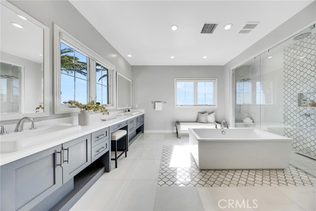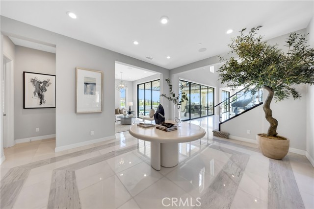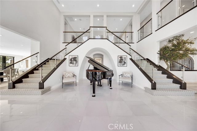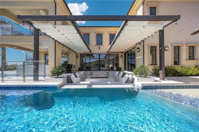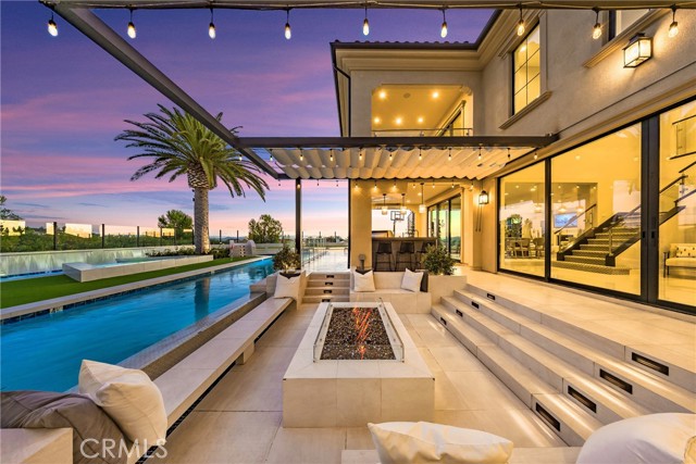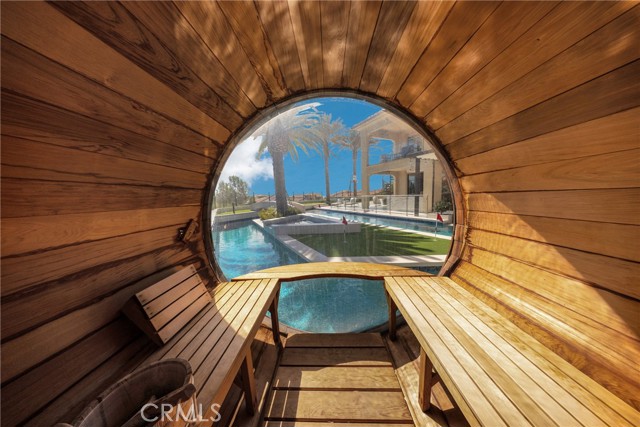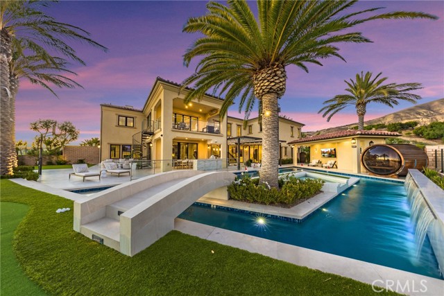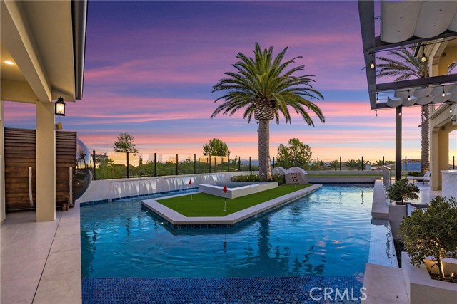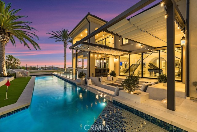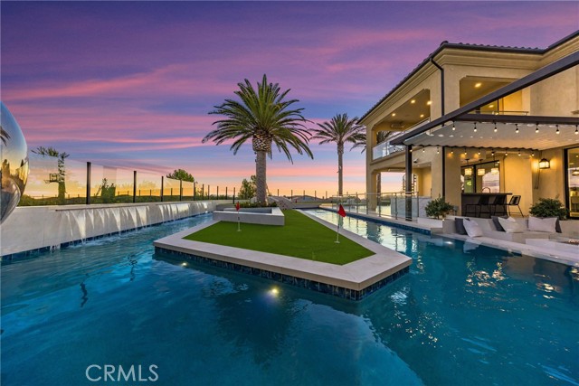 A Private Resort Oasis. Step into a world of curated extravagance, every detail elevates your living experience. The resort-style outdoor haven is a swimmer’s paradise, featuring a lazy river powered by a state-of-the-art Pentair IntelliCenter and commercial River Flow System. Dive into the Olympic-length lap pool, unwind in the glass-tiled jacuzzi, or lounge on the beach-inspired pool bajas beside a mesmerizing infinity waterflow cascading alongside a modern sunken firepit. A curb-frontage lined waterwall and pilaster fountains create a grand, flowing entrance, while lush landscaping, including six Medjool palms and a majestic Canary palm, frames a 30-foot water feature that fountains into the river. For leisure and sport, the estate boasts an in-ground basketball hoop, a putting/chipping green, and a four-hole golf course island accessible via a charming mini-bridge over the lazy river. Indulge in ultimate relaxation within the 7’ Dundalk panoramic cedar barrel dry/wet sauna, complemented by two outdoor showers and a convenient pool house restroom for guests. Fully equipped Alfresco outdoor kitchen, featuring a Sear Zone grill, 24-inch wok burner, and built-in refrigerator, invites al fresco dining under the glow of heated patios, perfect for year-round gatherings with panoramic ocean views. Opulent Interiors Redefining Grandeur. Inside, this architectural gem exudes timeless elegance. Dual gourmet kitchens are a chef’s dream, with the main kitchen showcasing premium Wolf appliances and the prep kitchen adorned with an airy, cloud-inspired quartz backsplash. White marble and natural hardwood floors create a sophisticated ambiance, enhanced by a sleek glass stairwell with contemporary railings.Spa-inspired master bath, fully clad in marble and equipped with 100% Kohler water systems. Five floor-to-ceiling sliding glass doors flood the home with natural light, framing spectacular eastern sunrise vistas and serene ocean views. This ultra-rare private resort estate is a testament to modern luxury, blending cutting-edge amenities with timeless elegance. From tranquil evenings by the infinity waterflow to vibrant gatherings under the canopy, every moment in this home is an experience in unparalleled sophistication. Perfectly positioned just minutes from Irvine’s finest international dining and luxury shopping, and enveloped by top-ranked 10/10 schools, this residence offers a seamless blend of coastal charm, academic excellence, and world-class refinement.