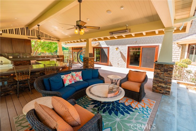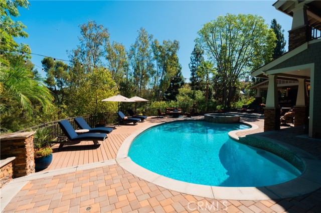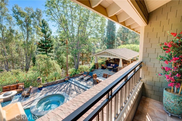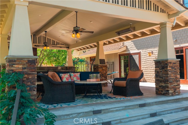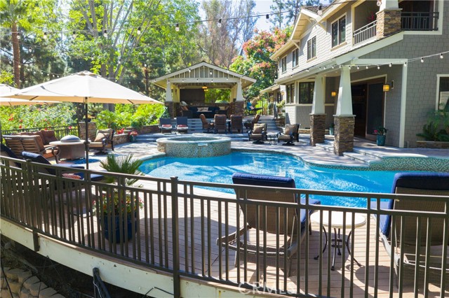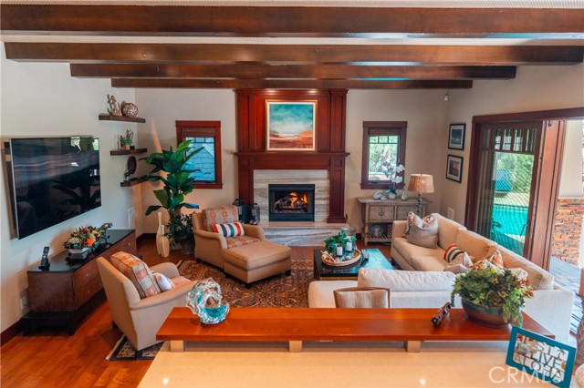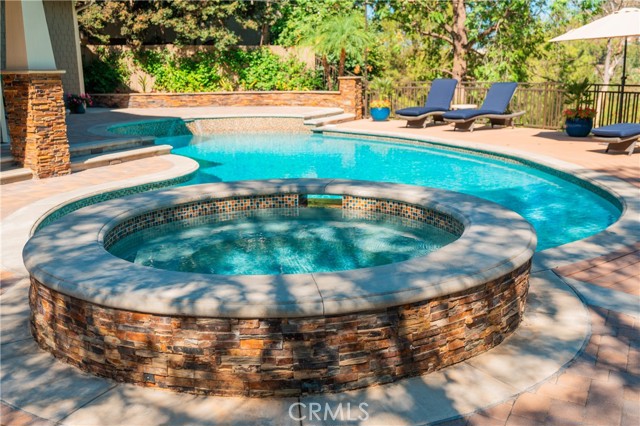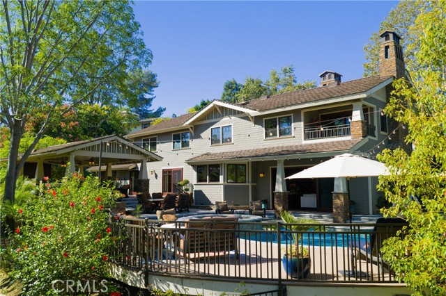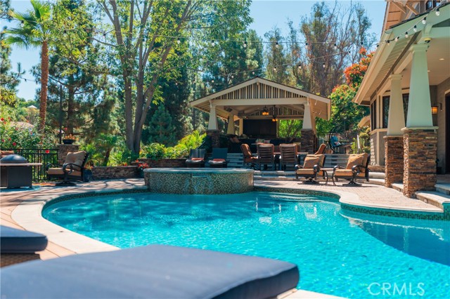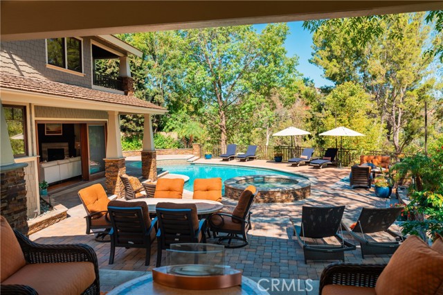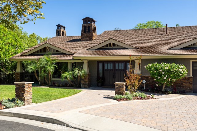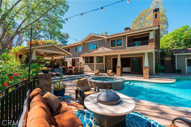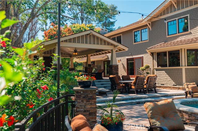 Rebuilt from the studs up to perfection, this exquisite Modern Craftsman in North Tustin embodies the sophistication and serenity of a five-star resort. Every detail—from the rich shingle siding and ledger-stone exterior to the refined interior finishes—reflects master craftsmanship and timeless design. A long paver driveway and beautifully lit landscape create an impressive first impression. Inside, warm maple hardwood floors flow throughout expansive living spaces designed for comfort, beauty, and effortless entertaining. The open-concept kitchen and family room serve as the heart of the home, featuring Caesarstone countertops, Dacor 6-burner range and oven, dual Fisher-Paykel DishDrawers, KitchenAid 48” refrigerator, Dacor microwave, U-Line beverage refrigerator, and adjacent walk-in pantry. The inviting family room showcases a gas fireplace with ocean-silver marble hearth, bar with Scotsman ice maker, and disappearing three-panel sliding doors that open completely to the backyard—creating the ultimate indoor-outdoor flow. The resort-inspired backyard rivals any luxury retreat. Enjoy a PebbleTec saltwater pool and spa, new Jandy Wi-Fi control system, and an outdoor kitchen pavilion equipped with a Twin Eagles 36” grill with sear zone and rotisserie, side burners, sink, U-Line ice maker and beverage refrigerator, and bar seating for eight. Dramatic landscape lighting illuminates mature trees and stone accents, setting the perfect mood for evening gatherings or peaceful relaxation while taking in tranquil hillside views. The primary suite is a private sanctuary featuring a fireplace sitting area, patio access, custom built-ins, and a spa-style bathroom with dual sinks, soaking tub, multi-head shower, and a custom walk-in closet. Two additional large bedrooms, a bonus TV/family room, dedicated office with marble-top desk and garden access, and a workout room provide versatility for today’s lifestyle. Additional amenities include dual Rheem Prestige A/C systems, whole-house water treatment, tankless water heater, Sonos music system, alarm system, and a two-car garage with loft storage. Every element of this home evokes a refined sense of resort living—peaceful, luxurious, and masterfully built. Experience the best of North Tustin in a residence where every day feels like an elegant retreat.