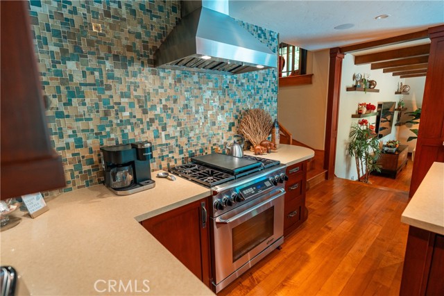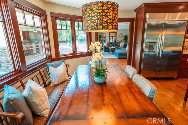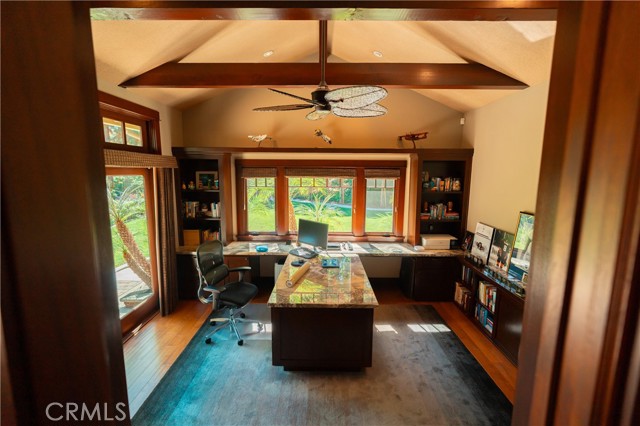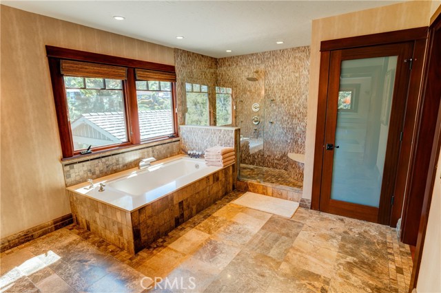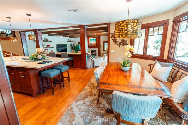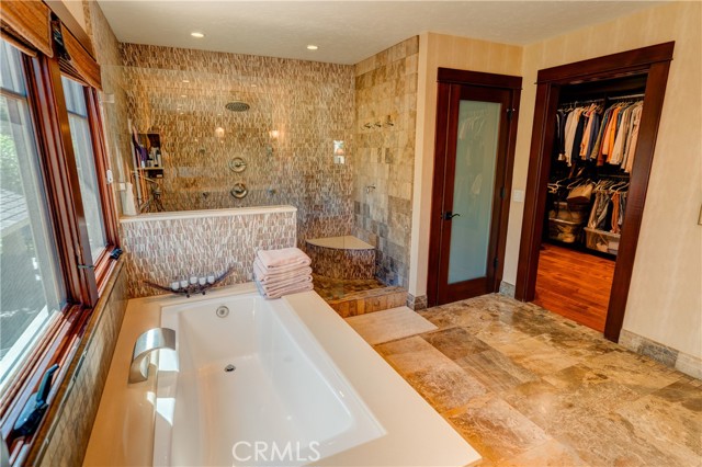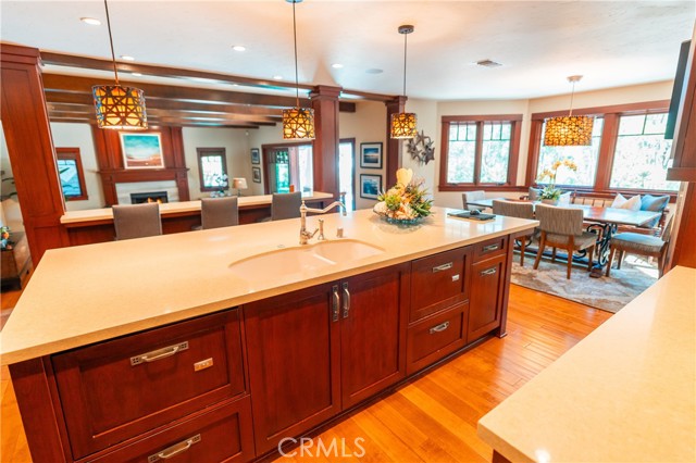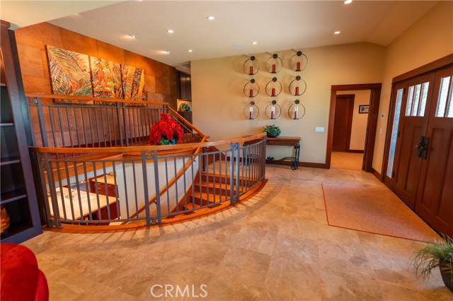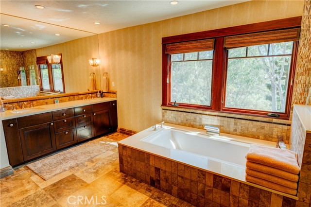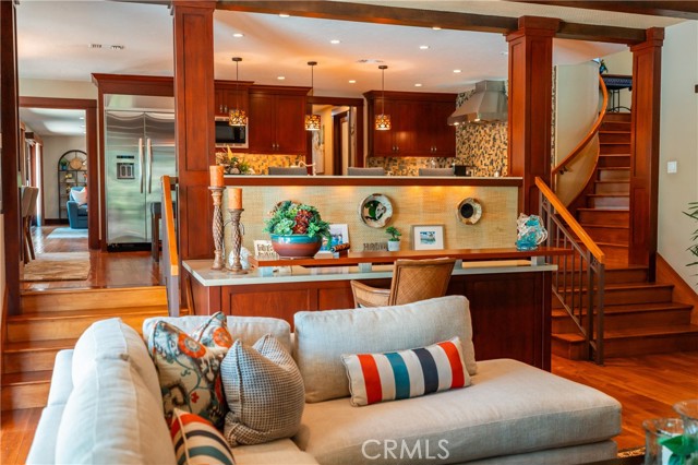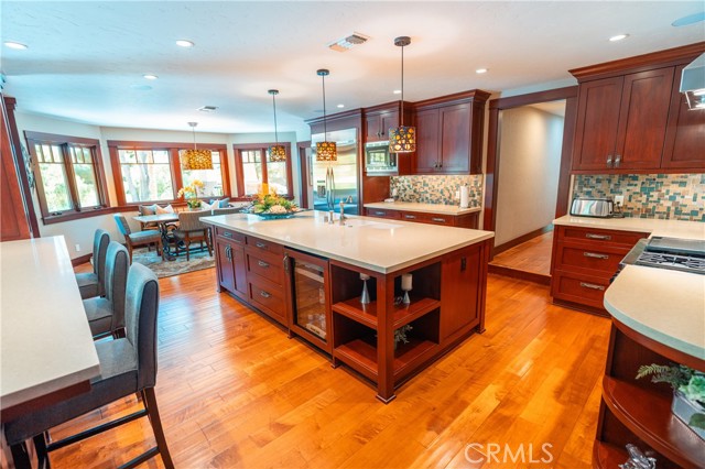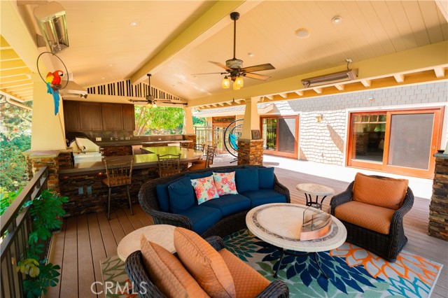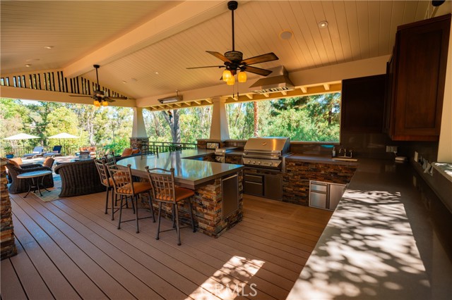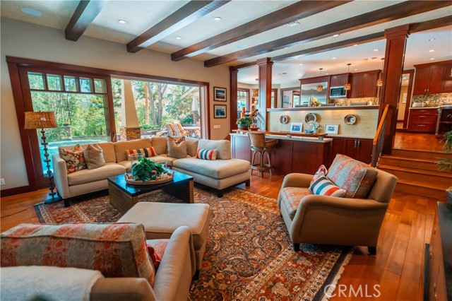 Rebuilt from the studs up to perfection, this exquisite Modern Craftsman in North Tustin embodies the sophistication and serenity of a five-star resort. Every detail—from the rich shingle siding and ledger-stone exterior to the refined interior finishes—reflects master craftsmanship and timeless design. A long paver driveway and beautifully lit landscape create an impressive first impression. Inside, warm maple hardwood floors flow throughout expansive living spaces designed for comfort, beauty, and effortless entertaining. The open-concept kitchen and family room serve as the heart of the home, featuring Caesarstone countertops, Dacor 6-burner range and oven, dual Fisher-Paykel DishDrawers, KitchenAid 48” refrigerator, Dacor microwave, U-Line beverage refrigerator, and adjacent walk-in pantry. The inviting family room showcases a gas fireplace with ocean-silver marble hearth, bar with Scotsman ice maker, and disappearing three-panel sliding doors that open completely to the backyard—creating the ultimate indoor-outdoor flow. The resort-inspired backyard rivals any luxury retreat. Enjoy a PebbleTec saltwater pool and spa, new Jandy Wi-Fi control system, and an outdoor kitchen pavilion equipped with a Twin Eagles 36” grill with sear zone and rotisserie, side burners, sink, U-Line ice maker and beverage refrigerator, and bar seating for eight. Dramatic landscape lighting illuminates mature trees and stone accents, setting the perfect mood for evening gatherings or peaceful relaxation while taking in tranquil hillside views. The primary suite is a private sanctuary featuring a fireplace sitting area, patio access, custom built-ins, and a spa-style bathroom with dual sinks, soaking tub, multi-head shower, and a custom walk-in closet. Two additional large bedrooms, a bonus TV/family room, dedicated office with marble-top desk and garden access, and a workout room provide versatility for today’s lifestyle. Additional amenities include dual Rheem Prestige A/C systems, whole-house water treatment, tankless water heater, Sonos music system, alarm system, and a two-car garage with loft storage. Every element of this home evokes a refined sense of resort living—peaceful, luxurious, and masterfully built. Experience the best of North Tustin in a residence where every day feels like an elegant retreat.
