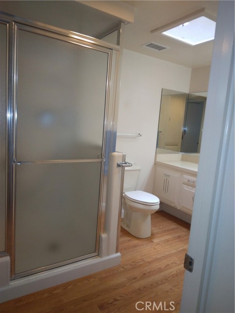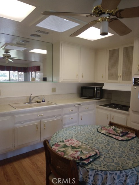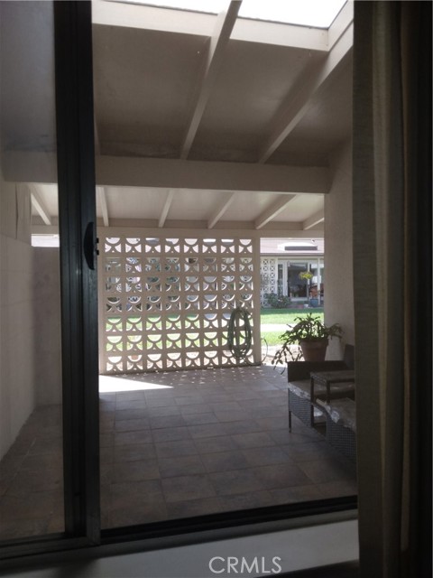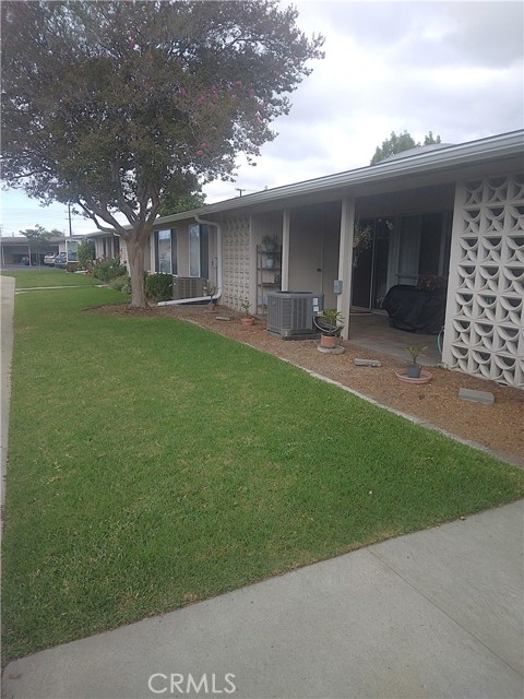 Take in the summer in this south facing 2 bedroom 1 bath unit which is situated between the main and north gates. There is central air and has laminate flooring throughout, as well as laminate kitchen and bath counters. The cornice above the living room window blinds adds a finished look. The L shaped patio is light and bright with a skylight and is tiled, has a storage closet and privacy hedge. There is street parking, carports, laundry and greenbelt near by.