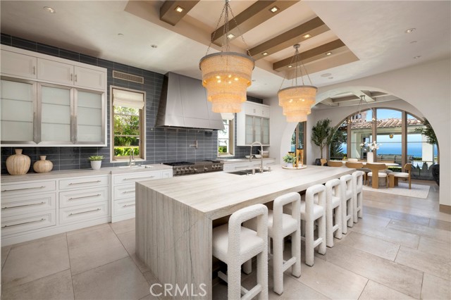 Spectacular sweeping coastal vistas from San Clemente Island to the Palos Verdes Peninsula are featured throughout this impeccable Crystal Cove custom residence, creating a constantly evolving backdrop that elevates every space within the home. Blending Northern Italian architecture with a refined transitional interior style, this estate spans approximately 12,500 square feet of inviting indoor living space on a generous and flat parcel of nearly one half acre, with an additional 1,300 sf of covered outdoor living space. Thoughtfully designed for both grand-scale entertaining and intimate everyday living, in addition to an oversized great room adjacent to the open-concept chef's kitchen and sequestered "dirty kitchen", the residence offers a formal living room, dining room, office/library, six luxurious bedroom suites, seven full baths, two powder rooms, a full-service bar and lounge with temperature-controlled wine cellar and dramatic glass wall display, private theater, game room, two laundry rooms, open-air atrium, subterranean garage for 8 vehicles, and an elevator servicing all three levels. Stepping outside, the experience rivals that of a five-star resort, with a custom 360-degree infinity-edge pool and spa just steps away from a cabana with fireplace, a large grassy yard, and a bluff-side fire pit -- all set against the endless Pacific.