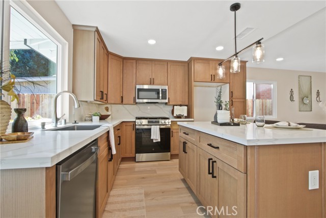 Welcome to 2717 Dayna Street, a stunning 4 bedroom 2 bathroom home that has been fully remodeled from top to bottom and sits in one of the most desirable neighborhoods on the border of Tustin and Orange. Step inside to find an open concept floor plan with vaulted ceilings, warm natural light, and beautiful new flooring throughout. The spacious kitchen features brand new cabinetry, quartz countertops, stainless steel appliances, and an oversized island perfect for entertaining. Both bathrooms have been completely redesigned with modern finishes and designer tile. The primary suite offers a serene retreat with a private ensuite bathroom showcasing a walk-in shower and elegant fixtures. Enjoy the seamless indoor outdoor flow through sliding doors that open to a large backyard, perfect for gatherings or relaxation. With easy freeway access and a prime location near Old Town Orange, shopping, dining, and award-winning schools, this move-in ready home combines comfort, style, and convenience. 6000 sq ft lot with a two car garage completes this ideal Southern California residence.