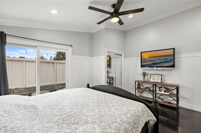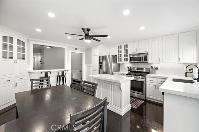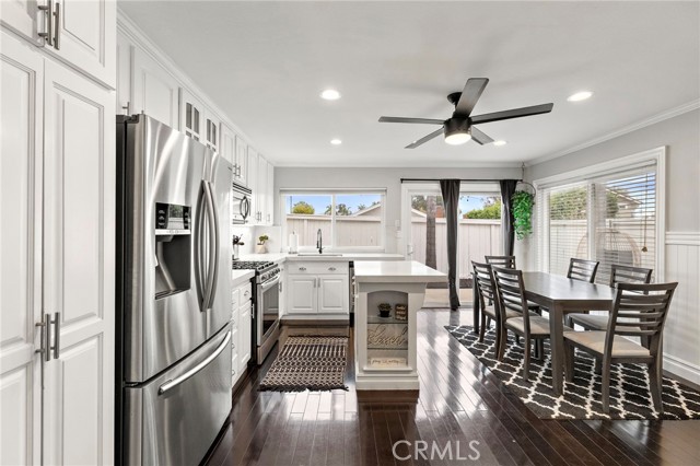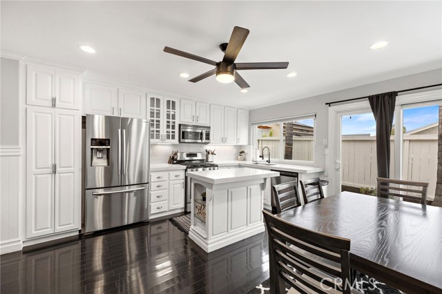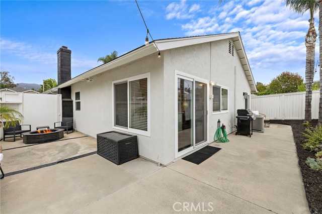 Ideally located on a peaceful side street cul-de-sac in the heart of Robinson Ranch surrounded by beautiful mountains, this updated single-level stunner is sure to impress! Upon arrival, high-pride-of-ownership is apparent with fresh improvements including newer exterior paint, light fixtures, and stylish landscaping. A white picket fence frames in the low-maintenance and useful front turf yard - a great outdoor space! An entry Dutch door welcomes you inside the large living room with a cozy gas fireplace, ascending ceiling plate with overhead fan and wired surround sound. Recently painted inside, the light and bright interior contrasts the dark hardwood flooring throughout. Just off the living room, the updated kitchen offers stainless appliances (newer range), new quartz counter tops, a new sink and faucet, a centered island, formal dining, clever bar-top seating, wainscoting, and ample Eastern-seaboard-style cabinetry for abundant storage. Large picture windows let natural light into the space and glass slider doors access the rear and side patios with an in-line gas fire pit. Very private outside and rare to come by! The family room and open kitchen create an inviting space for relaxing and entertaining. Beyond the living areas, three generous bedrooms (one currently a nursery, one used as an office with bay window and vaulted ceilings) and two nicely-remodeled bathrooms all provide comfortable, turn-key living. The primary offers his & hers mirrored closets, wainscoting, and spa-like bathroom with new vanity, dual sinks, fixtures, counter top, shower enclosure, tile, and mirror. The full guest bathroom has also been highly upgraded in similar fashion and offers a tub. Other newer improvements and values: recessed lighting throughout, light fixtures, ceiling fans, interior/exterior paint, crown molding, a finished garage with MyQ smart garage door system, additional storage cabinets, epoxied floors, washer/dryer, water heater, privacy side gate, and routinely maintained HVAC system. Just a short walk to Blue Ribbon Robinson Ranch Elementary, amazing neighborhood parks, community pool and amenities, and close to shops, dining, and entertainment, this home offers turn-key convenience and a fun lifestyle beyond.