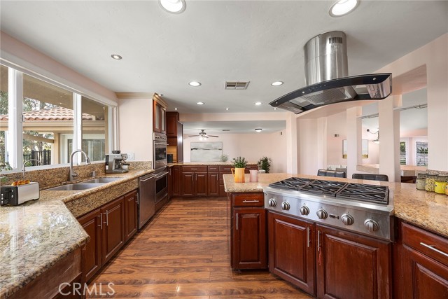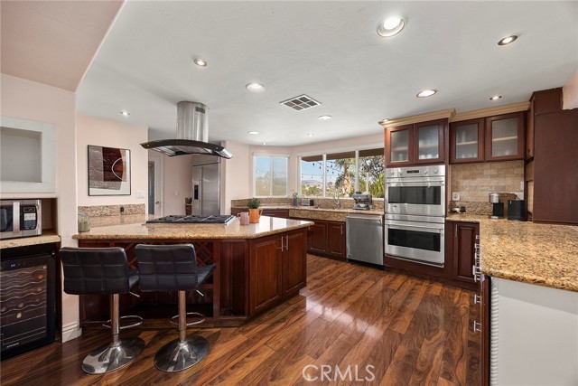 MULTI GENERATIONAL LIVING with 4,600 SF main residence and a separate 2900 sqft of guest house and apartment!!! Commanding a premier hilltop setting with panoramic views that stretch across rolling hills, majestic mountains, and the shimmering lights of the city below, this custom Mediterranean estate resides on almost an acre and has the room and seclusion you are looking for. A grand two-story entry opens to a symphony of space and light, where walls of glass finished with rich plantation shutters, invite nature’s beauty indoors. The interiors are a masterful balance of warmth and sophistication, featuring stone and wood flooring, dramatic volume ceilings, a versatile floorplan that suits everyone’s needs with a seamless flow between living and entertaining spaces. The formal living and dining rooms exude timeless elegance, while the separate family room offers an inviting fireplace to gather ‘round. The gourmet kitchen is centered and completely open to the living space with an abundance of areas for meal prep and appointed with granite counters, professional-grade stainless appliances, and a large walk-in pantry. The main residence features two primary suites (main floor and 2nd floor), each with a private retreat with spa-inspired baths and custom detailing. Four additional bedrooms provide generous accommodations for family or guests; each with uniquely designed finishes and an abundance of natural light. Stepping outdoors to your own private oasis, you will discover a sparkling pool and spa, a warming fire pit for chilly evenings, an outdoor BBQ center and a covered dining area all with the amazing views that await. Complementing the main residence is a separate 3 bedroom, 2 bath guest home with its own garage. It showcases a spacious kitchen with professional stainless appliances, a private bar area, large bedroom and baths,and its own fenced off patio capturing the estate’s breathtaking views. In addition is also an 800 SF one bedroom, one bath well designed apartment. Perfectly positioned at what feels like the top of the world, this estate offers unparalleled privacy, dramatic vistas, and an atmosphere of peace and grandeur—an extraordinary sanctuary for those who seek space, nature and the outdoors. Top rated Anaheim Hills schools and close proximity to shopping, restaurants, hiking and biking makes this a great opportunity to call home!