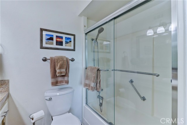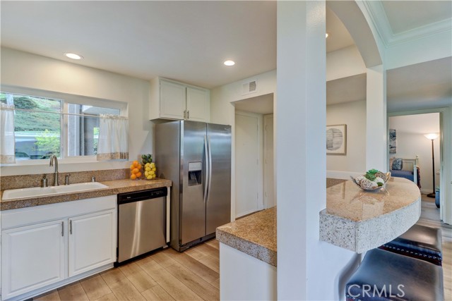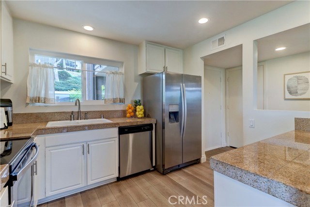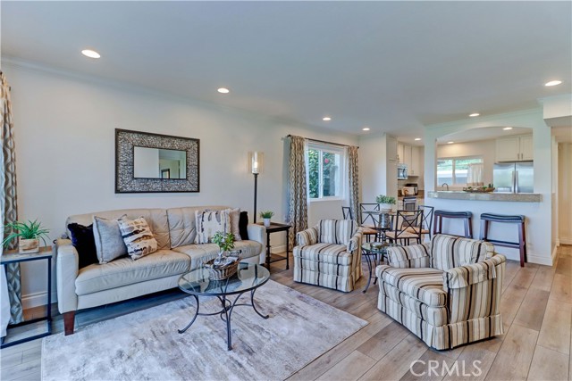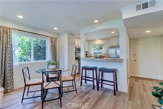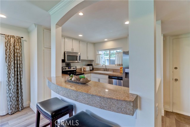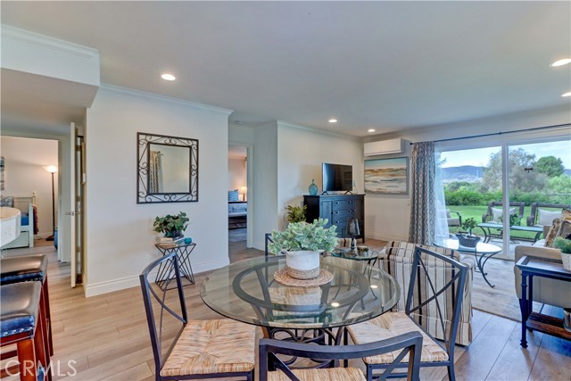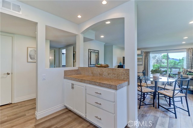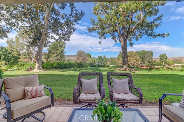 AMAZING VIEW! Ground level updated, end unit condo with bluff-top mountain view + peek-a-boo view of city lights and orange balloon! Check out the Matterport walk-through tour that includes interior and exterior areas. This condo can be purchased furnished for a truly move-in ready home! Located on a private cul-de-sac with just one building, very close to Clubhouse 6, and carport right in front. Airy and bright floorplan featuring dual pane windows/slider, mini split central zoned HVAC, vinyl plank flooring and smooth ceilings. Walk right in a be wowed by the natural beauty through every window! Updated and opened kitchen features granite tile countertops, recessed lights, stainless appliances and lovely window over the kitchen for morning sun. Great room area enjoys recessed lights, crown molding, mini-split, extra window plus sliding doors leading out to the mostly covered patio - gorgeous views and nice sized greenbelt area for your pets or grandkids to play. Primary bedroom is on the view side and brightened with mirrored closet doors, large window and finished off with crown molding. This room has its own mini-split for comfortable sleeping temperature and en suite bathroom housing glass enclosed tub/shower, nice sized granite topped vanity and updated fixtures. Guest bathroom features a walk-in shower with glass door, similar granite-topped vanity and updated bathroom fixtures. Guest bedroom is separated by the 2 bathrooms, has southeast facing window and mirrored closet doors. You'll love this inviting and beautifully upgraded home! Laguna Woods Village residents enjoy a 27-hole championship golf course, a 9-hole executive par 3 course, pickleball and tennis courts, lawn bowling, gyms, clubhouses, swimming pools, horse stables, gardening centers, artist studios, computer workrooms and classes + over 200 clubs and organizations. EXPERIENCE THIS HOME IN THE WALK-THRU VIRTUAL TOUR - CLICK ON THE WHITE CIRCLES TO WALK-THRU, 360 ICON TO GO OUTSIDE AND WALKING PERSON ICON TO COME BACK IN!