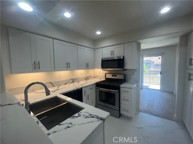 This beautiful home offers 3 bedrooms and 2.5 stylish bathrooms, each featuring gorgeous quartz countertops that bring a touch of elegance to daily living. The open and inviting living area centers around a cozy fireplace, perfect for relaxing evenings or intimate gatherings with family and friends. Just off the living space, step outside to your private balcony (One upstairs in the primary and one downstairs), an ideal spot for soaking up the sun, sipping your morning coffee, or enjoying the fresh air. Vaulted ceilings throughout with large windows in the living room and the bedrooms for plenty of natural light. The well-appointed kitchen provides ample room for cooking and entertaining, complete with modern, stainless steel appliances that make meal prep a breeze. Upgraded under-cabinet lighting installed. The home also includes a convenient 2 car garage, perfect for secure parking or extra storage. Brand new high-efficiency water heater, central air HVAC and updated LED lighting throughout. Located in a vibrant neighborhood, residents enjoy exclusive access to a tennis court, gym, and sparkling pool. A true resort-style experience right at your doorstep. For everyday convenience, the property sits just minutes away from two nearby shopping centers, making errands, dining, and entertainment effortless. Nearby businesses such as: Ralphs, Vons, Target, Tj Maxx, and more
