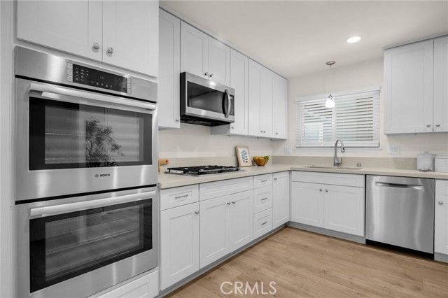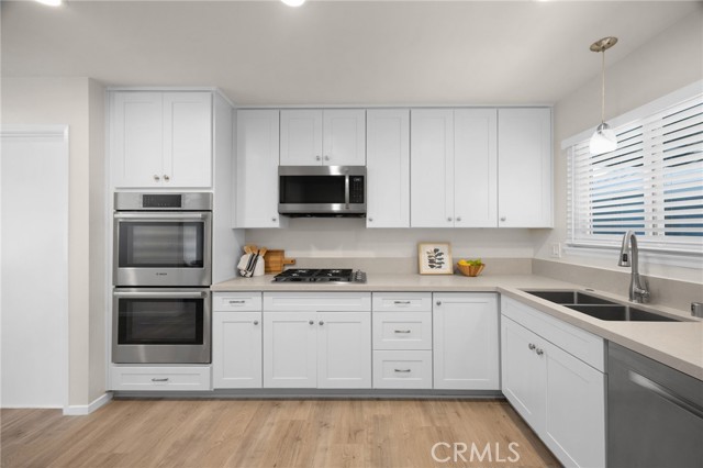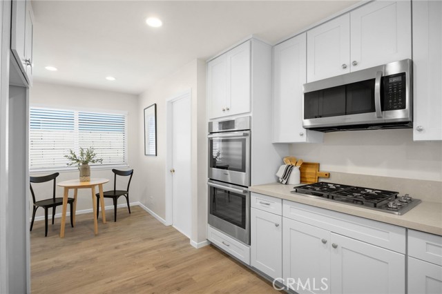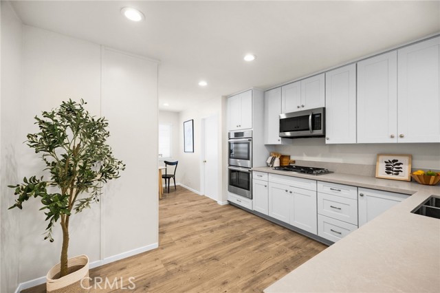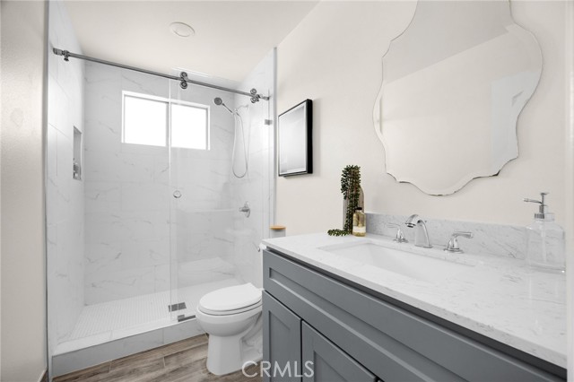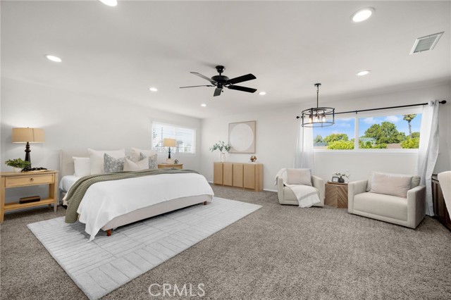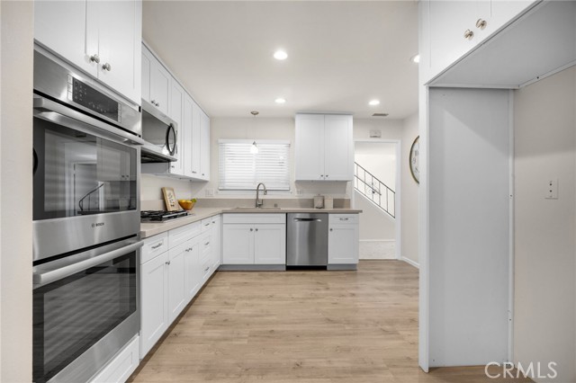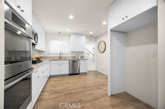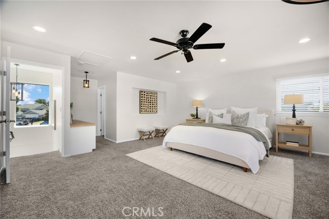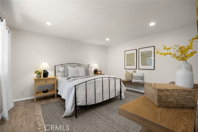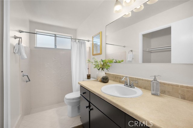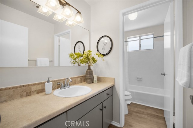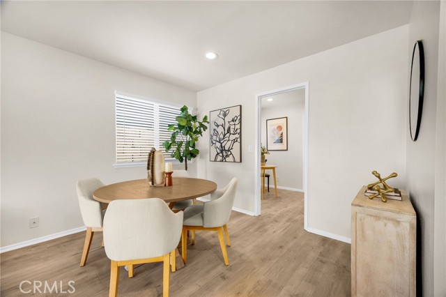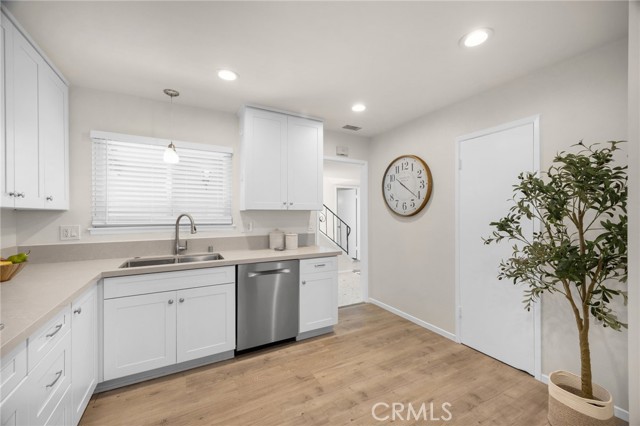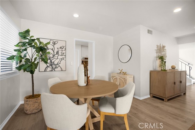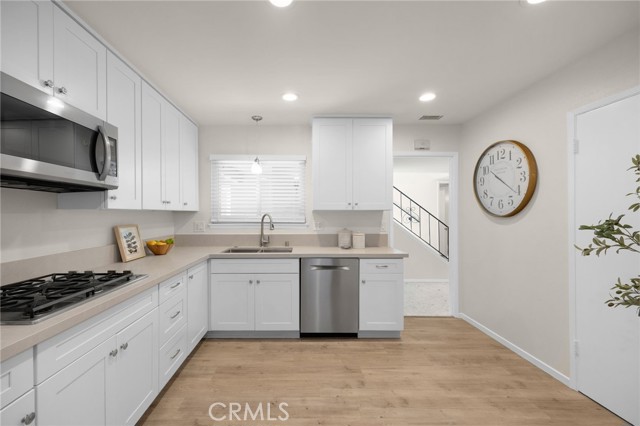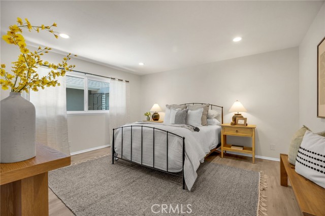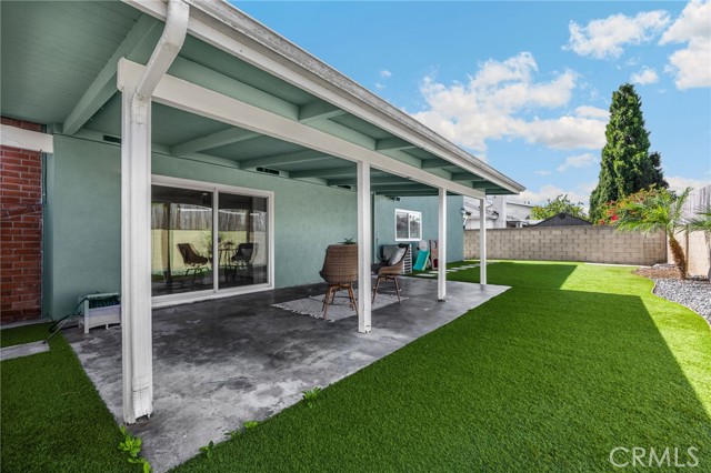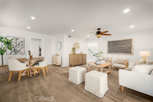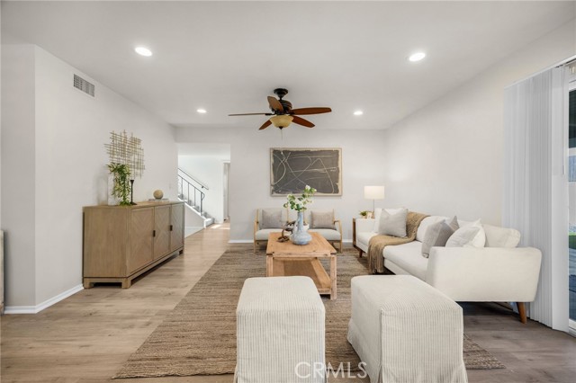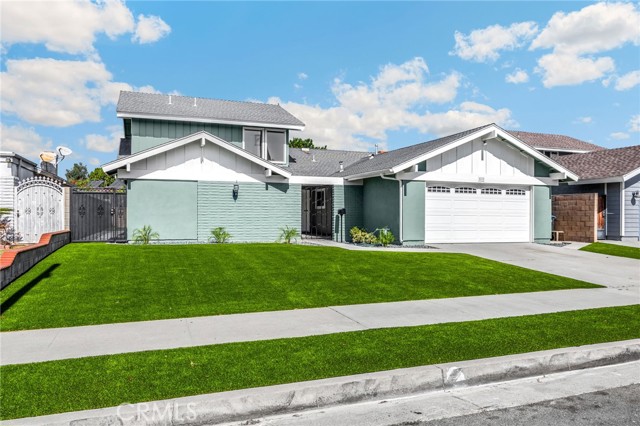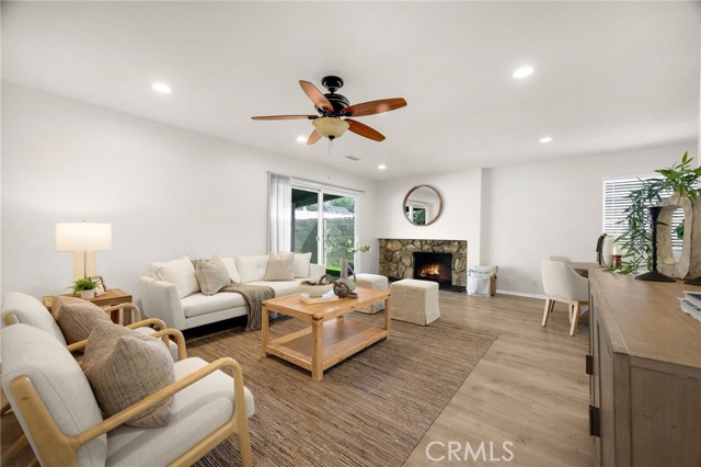 Welcoming Two-Story Home with Private Courtyard & 2 Suites. This inviting home offers great curb appeal with a gated front courtyard and newly installed turf. Fresh interior paint, thoughtful updates, and a clean, move-in-ready presentation make it standout. Interior Highlights include: Entry features a retro touch with marble tile flooring and gold swirl wall mirrors, leading into luxury vinyl plank flooring throughout the first level. Functional floorplan with bedrooms on one side and living/kitchen spaces on the other. First floor includes a primary suite with private bath, two additional bedrooms, and a hall bathroom. Upstairs offers a versatile mini studio or second primary suite with remodeled bathroom—ideal for guests, multi-generational living, or a private retreat. Updated kitchen with quartz countertops, white cabinetry, stainless steel appliances, and casual dining area. Living room features a fireplace, ceiling fan, and sliding glass door to the backyard. Outdoor & Additional Features: Inviting backyard with covered patio and newly installed turf. Two-car garage with updated lighting, laundry area, and direct access to kitchen and side yard. Location: Nestled in a quiet Stanton neighborhood and surrounded by Midway City, Westminster, Anaheim, and Garden Grove, this home is close to shopping, entertainment, and dining. Easy access to the 22 and 405 freeways, and just miles from the beach via Beach Blvd.