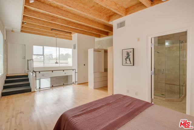 Quiet, rear-corner live-work loft designed by Jay Vanos Architects now available in the flourishing "Media District." This complex is one of Hollywood's few fully commercially-zoned (LAC2) condominiums. This is an amenity-rich urban area: just blocks from Tartine bakery and directly opposite Petit Trois off Highland and Pizzeria Mozza on Melrose. Built in 2005, the Highland Lofts are a live/work community for creative-class professionals, artists, and all who appreciate industrial architecture. All the lofts have private entrances, true open plans, soaring ceilings and large windows. This southwest corner unit in the back is peaceful and sunny. One of the largest units in the complex, the loft has an ample bedroom-level terrace featuring open views west towards Century City -- i.e NOT on Highland Avenue, but the quieter interior side. Two full en suite baths and a sliding translucent glass wall on the main floor below the terrace level, one flight above the entry, allows for a second bedroom or private office. The 2-car garage within the lower level was designed to be flex space and is currently used entirely as a bespoke design workshop. Private entry into the unit is from a path planted with mature bamboo and secured by a tall custom metalwork fence. Vehicles access the private garage from a gate and common driveway partially below grade. Enjoy remarkably low monthly HOA dues for a unit of this size and quality. Owners pay gas+ electric; remaining DWP costs paid by HOA. Secure entry via a gate with a new intercom. ** Also for lease. **