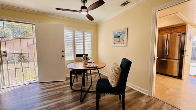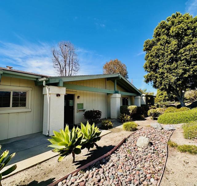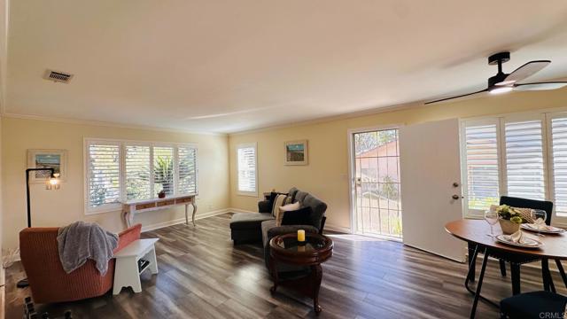 2.6%***VA ASSUMABLE LOAN***2.6% interest rate Motivated Seller Oceana lll ages 55+ Updated, turnkey home, end unit, top of tract, greenbelt views from living room, plantation shutters throughout, dual pane windows, fresh paint, crown molding, 5 in baseboards, LVP flooring, laundry area in garage and includes washer, gas dryer. Newer water heater, forced air heat and central air conditioning. The primary bedroom looks out to nice sized, private, gated, covered patio. The updated primary bathroom dual vanity, granite counters, lots of drawers for his/her, granite countertops, brushed nickel fixtures, travertine flooring, walk in shower. Second bedroom overlooks greenbelt. The second bathroom has travertine floors, pedestal sink, brushed nickel fixtures, combination tub and shower. Remodeled kitchen, updated cabinets and granite countertops, travertine flooring, stainless steel appliances, included with sale, gas stove, above range microwave, dishwasher and refrigerator. Oceana lll, adult 55+ community in North San Diego County. Situated just 4 miles from the ocean. Residents can enjoy the breezy Oceanside lifestyle and Southern California climate. Community Pool & Spa & Clubhouse. Water Trash Sewer included in monthly HOA ***