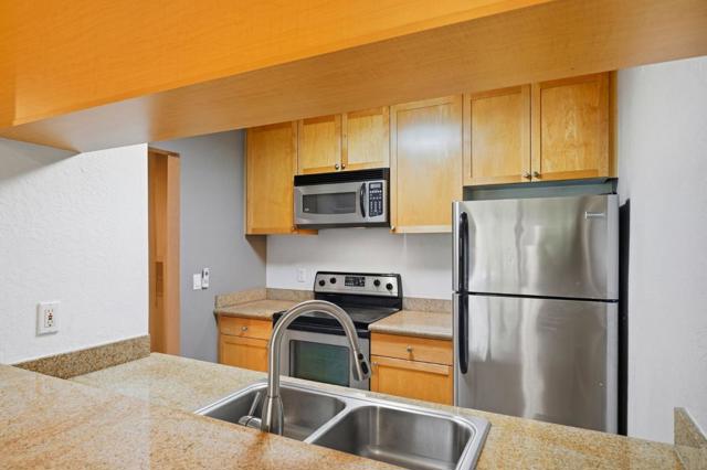 Unit has one of the best locations in the community. It's on the top floor so there's no unit above, it's at the end so there's no unit on one side. Lined with beautiful trees providing privacy and serene views from the bedroom and the balcony/living room. Large living room that can partially be used as the dining room. Granite countertops and stainless steel appliances. Den can be used as an office, dining room, or an unenclosed second room. NEW - LVP flooring, plush 60oz carpet and 8lb carpet pad, bathtub/bathtub wall refinishing treatment, bathroom light, medicine cabinet, CO detector. Recent new items - roof (2020), sub electrical panel (2023), wall AC heating unit (2020), balcony door screen (2021). High quality customized closets. Hallway closet doors are back on. In some pictures the closet doors are not on, they were temporarily taken off to install the thick new carpet. Some of the pictures are virtually staged. Assigned carport. Community pool, hot tub, BBQ, gym room, clubhouse, elevator. HOA includes water/sewer, garbage. Trader Joes, restaurants/stores, vineyards located close by. Move in ready at a fabulous price. This well maintained condo has the comfort feeling of home and will be the perfect fit for you.
