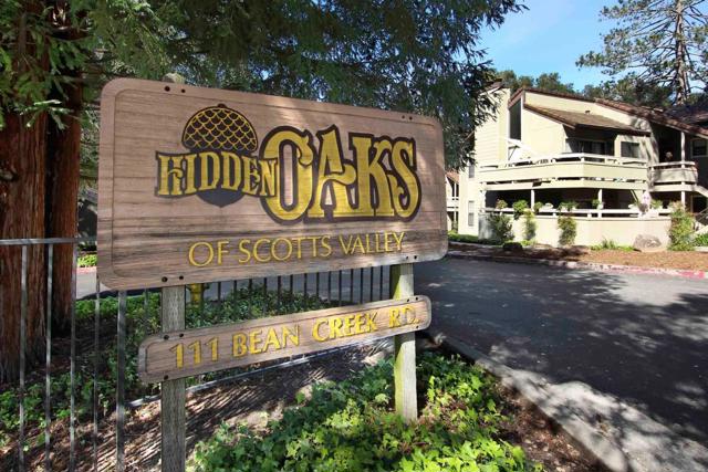 Surrounded by landscaping and trees this Stylish Single Level, End/Corner home is in the best, quiet, private location in Hidden Oaks. Easy to access and close to the garage. Garden views and lots of light from dual pane windows on four sides. Freshly painted, new carpet, updated kitchen and main bath. Unique light fixtures. Floor plan is ideal with a guest bedroom & bath or a home office & main bedroom and bath suite. Living room fireplace. Easy maintenance patio for Bar-B-Qs and a breath of fresh air! Indoor laundry. Walk-in closet. Two pools and hot tubs make this community very enjoyable. Walk to Kings Village Shopping Center. Coffee shops, restaurants, groceries and movies at the Cinelux. Perfect for commuters, great as a weekender. Good for an income rental. Opportunity time in Scotts Valley!!