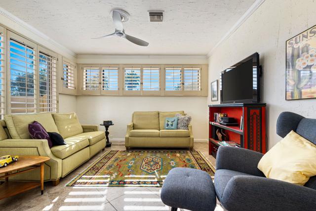 Welcome to 128 Desert West Drive, located inside the gates of Mission Hills Country Club in Rancho Mirage--a serene desert retreat offering privacy, style, and picturesque lake views. A private courtyard entry creates an elegant first impression, with both front-door access and a sliding glass door leading to the guest bedroom--ideal for hosting guests or flexible living. Inside, tall ceilings enhance the home's light and airy feel. The updated kitchen features quartz countertops, stainless steel appliances, warm-toned cabinetry, and a spacious center island, offering generous storage and a functional layout for everyday living and entertaining. A sunlit den adjacent to the kitchen provides versatility and can serve as a dining area, office, or additional living space. The great room is highlighted by a dramatic slanted ceiling with exposed wood beams and a cozy fireplace, creating a refined yet inviting atmosphere. Tile flooring flows throughout the home for a clean, cohesive look. A bonus room with large windows offers endless possibilities as a library, sitting room, or creative retreat. The primary bathroom includes a shower-over-tub, while the guest bathroom offers a walk-in shower. An indoor laundry closet is conveniently located in the hallway. The guest bedroom enjoys direct access to the front courtyard through a glass slider. The rear patio provides a peaceful setting to enjoy lake views, perfect for relaxing or entertaining. The property also includes a detached two-car garage plus a golf cart garage, currently used for additional storage.