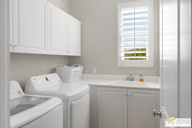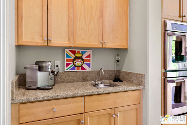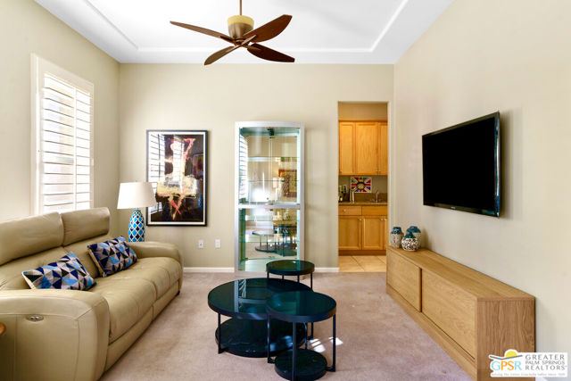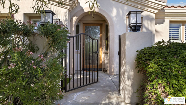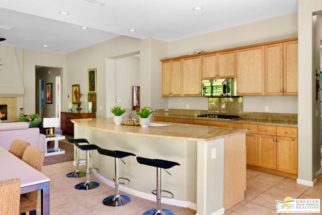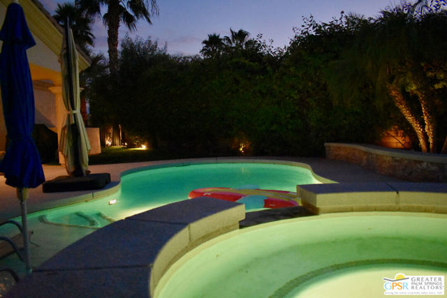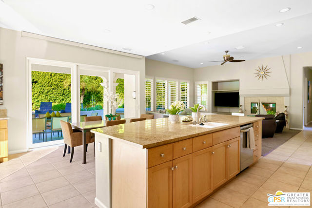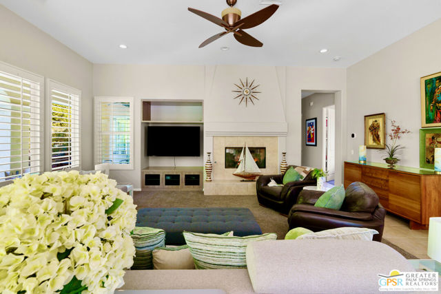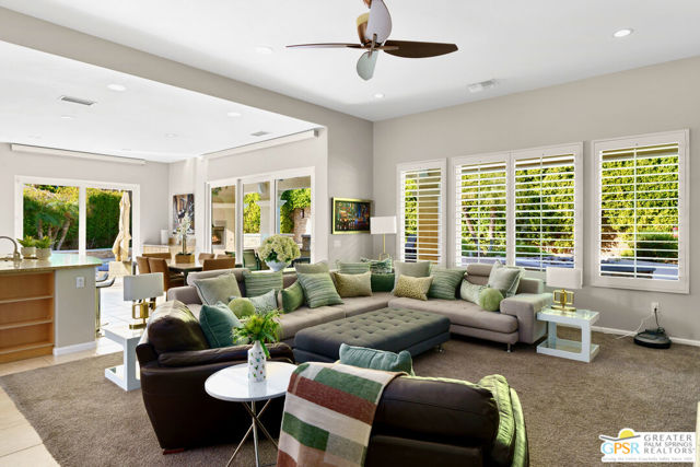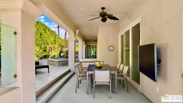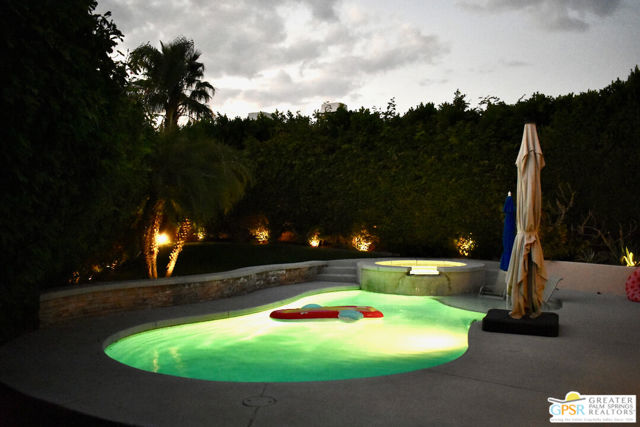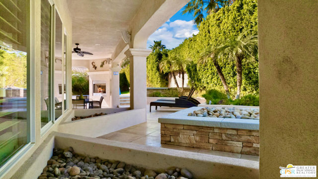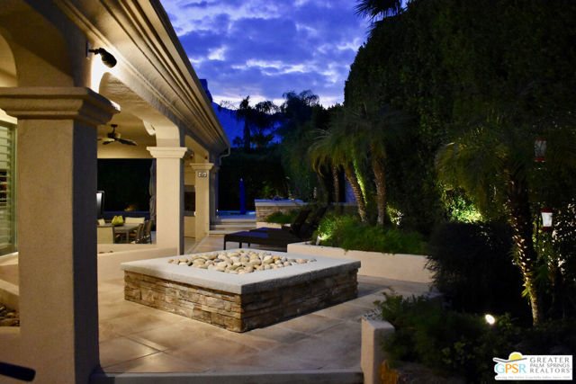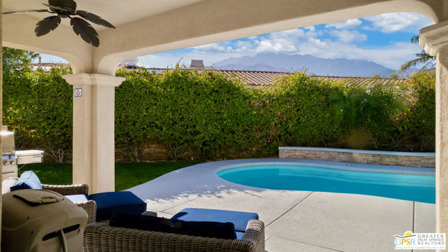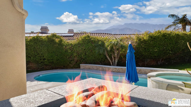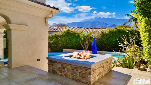 Welcome home - where elegance meets tranquility in this graciously proportioned residence nestled on a peaceful cul-de-sac. With westerly mountain views and a professionally designed backyard oasis, this property offers a lifestyle of luxury and comfort. Experience the heart of the home where the living, kitchen, and dining areas blend seamlessly. This spacious open layout is perfect for entertaining, featuring a large kitchen island that serves as a gathering point for family and friends. Cozy up by the elegant living room fireplace as it creates the perfect ambiance for those cool desert evenings. Step out from the great room onto a wrap-around covered patio, ideal for hosting or enjoying quiet evenings under the stars. The outdoor fireplace and raised sitting areas, complete with a firepit, create an inviting atmosphere for year-round entertaining and relaxation. Dive into your very own pool and spa, nestled within a beautifully landscaped and very private backyard. Pet lovers will appreciate the thoughtfully designed doggie doors leading to two fenced outdoor spaces, providing your furry friends with the freedom to roam. Indulge in the expansive master suite, complete with a spa-like bath with dual vanities, soaking tub, and walk-in shower. Enjoy the convenience of patio access where you can step out to your outdoor shower. The beautifully crafted custom walk-in closet ensures that your wardrobe is impeccably organized and easily accessible. Two additional bedrooms and baths round out the interior along with a TV room/Den. Enjoy the ultimate convenience with a short walk to local groceries, gym, restaurants, and coffee. Whether you are entertaining guests or enjoying quiet family evenings, this home is designed for both relaxation and sophistication.