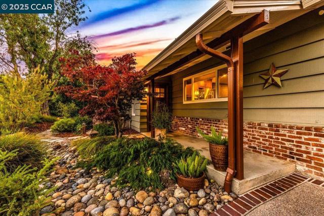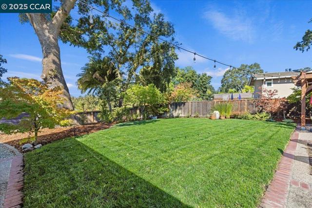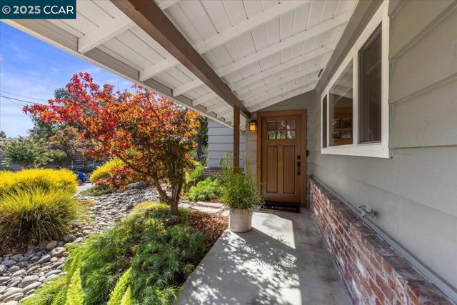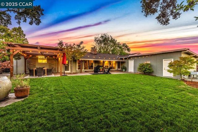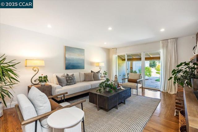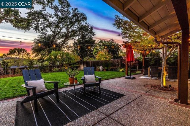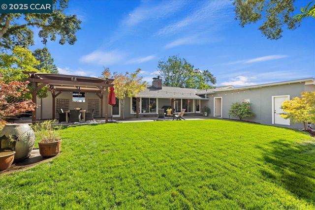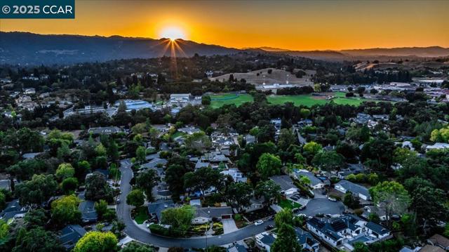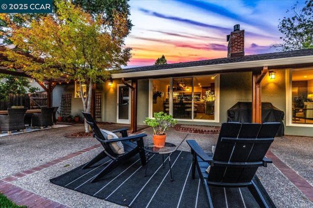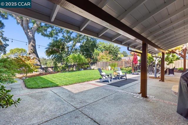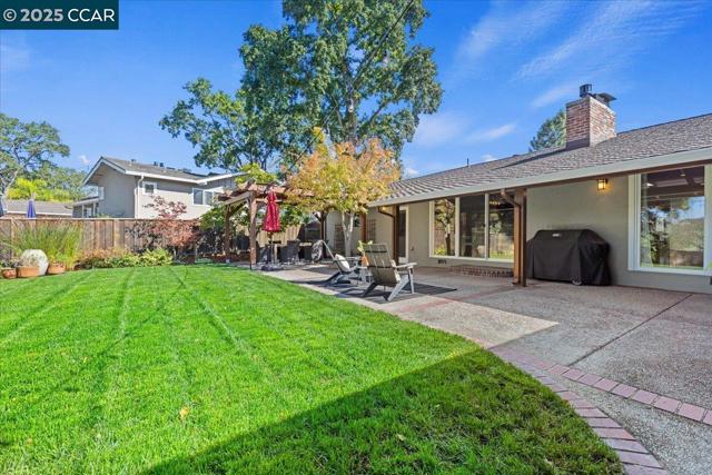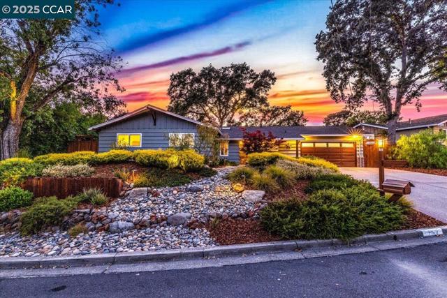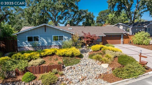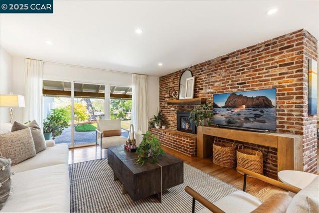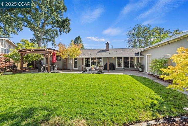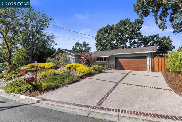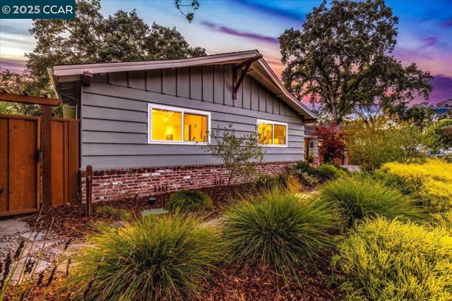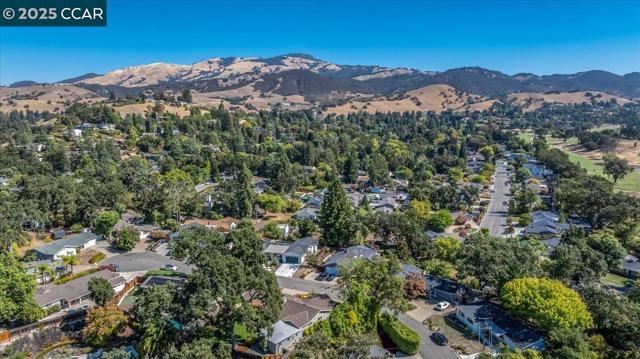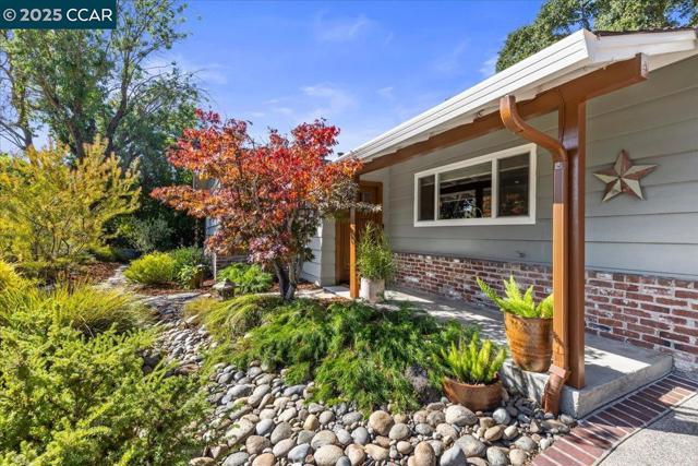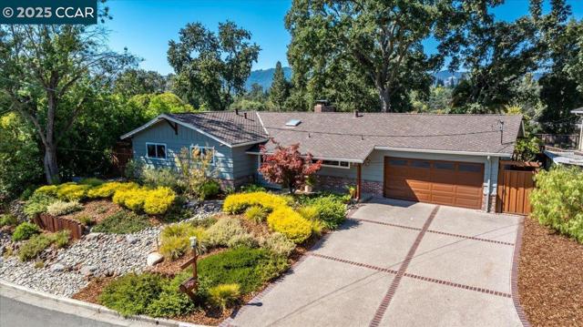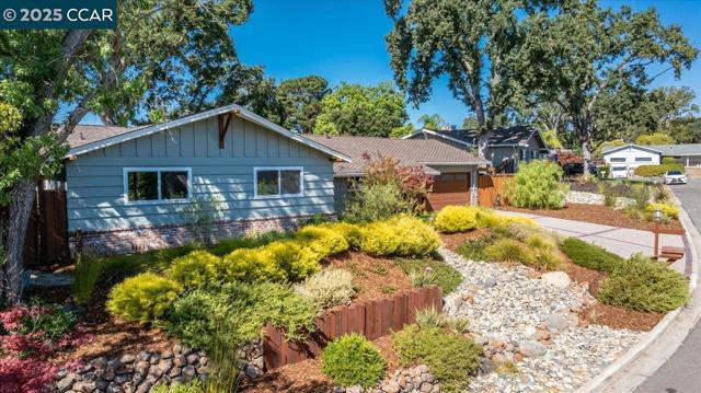 Ideally situated near the top of a court with a view of Mt. Diablo to the West and gorgeous sunsets and ridge view to the East, this home offers the ultimate casual California lifestyle. Perfectly designed for both indoor and outdoor living and entertaining. The updated kitchen with beautiful wood cabinets, quartz countertops, stainless-steel appliances, pantry and a breakfast bar overlooks the great room and leads out to the patio with covered pergola. Cozy up in the spacious living room that features a brick raised hearth gas fireplace insert and a wall-to-wall sliding glass door that allows flow out to the landscaped backyard with persimmon, apple and lemon trees. A coveted Heritage Oak stands tall. An additional huge bonus room, not included in the square footage, makes space for an office, play/crafts room, or artist studio. Adjacent is a huge storage room. Gleaming hardwood floors throughout living room and bedrooms. Dual pane windows. Two-car garage. 12-years of award winning schools are within 1/2 mile. Move-in ready! Make this your forever home. Views: Ridge
