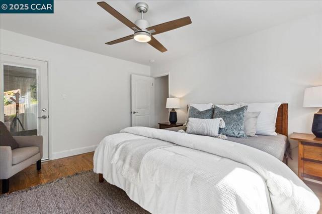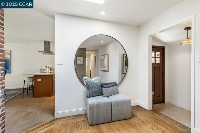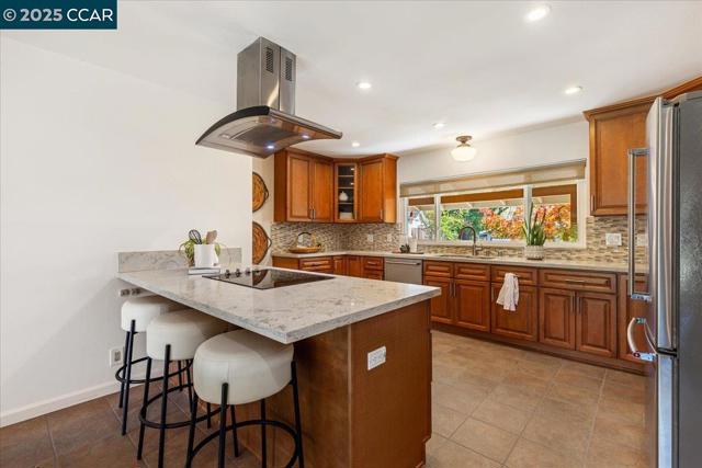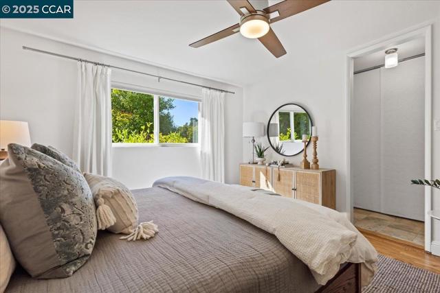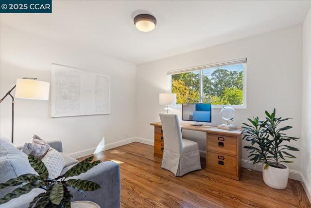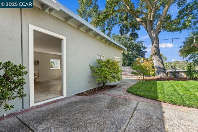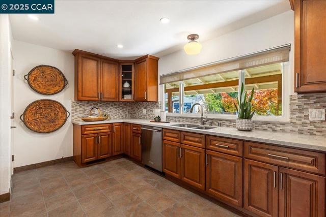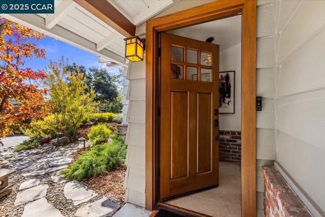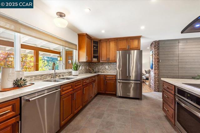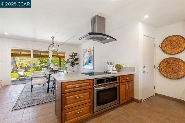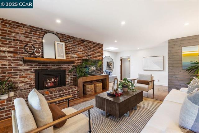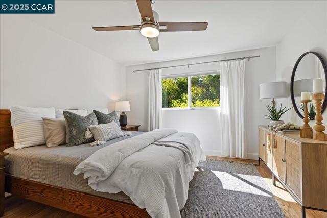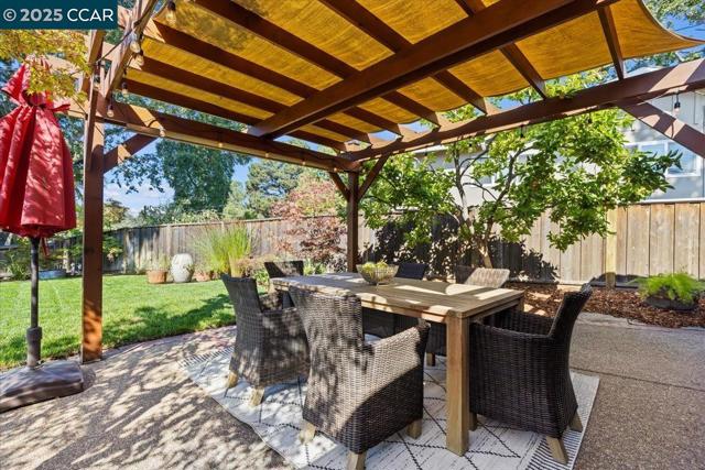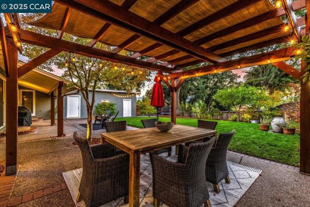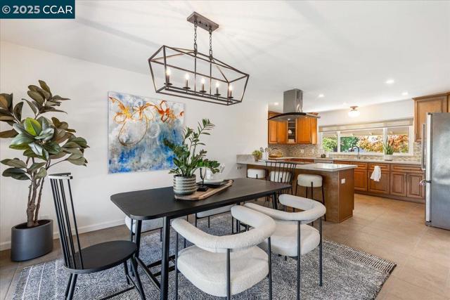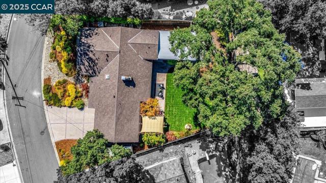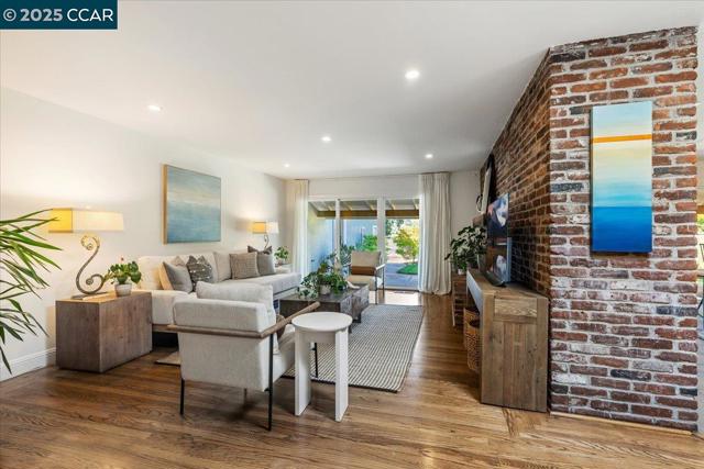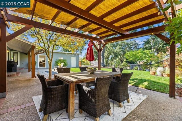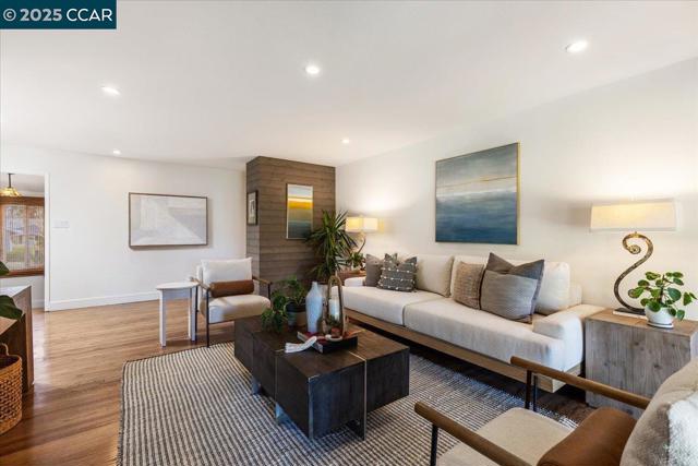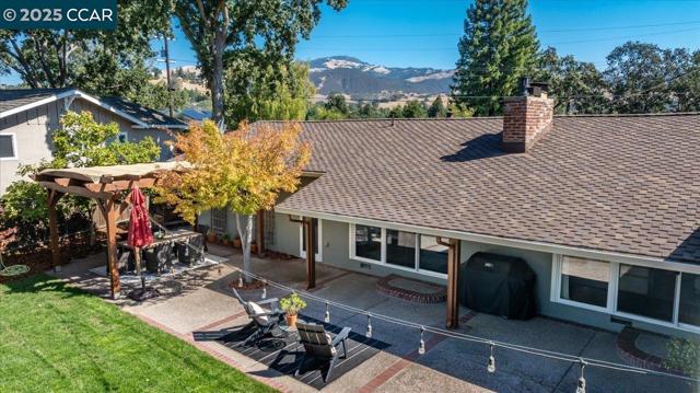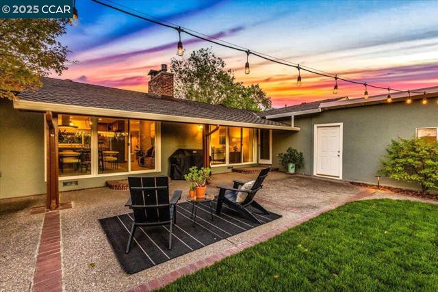 Ideally situated near the top of a court with a view of Mt. Diablo to the West and gorgeous sunsets and ridge view to the East, this home offers the ultimate casual California lifestyle. Perfectly designed for both indoor and outdoor living and entertaining. The updated kitchen with beautiful wood cabinets, quartz countertops, stainless-steel appliances, pantry and a breakfast bar overlooks the great room and leads out to the patio with covered pergola. Cozy up in the spacious living room that features a brick raised hearth gas fireplace insert and a wall-to-wall sliding glass door that allows flow out to the landscaped backyard with persimmon, apple and lemon trees. A coveted Heritage Oak stands tall. An additional huge bonus room, not included in the square footage, makes space for an office, play/crafts room, or artist studio. Adjacent is a huge storage room. Gleaming hardwood floors throughout living room and bedrooms. Dual pane windows. Two-car garage. 12-years of award winning schools are within 1/2 mile. Move-in ready! Make this your forever home. Views: Ridge