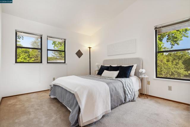 Location, Location, Location! This unit boasts one of the best locations in the entire community. Backing up to the creek & trail, the unit is surrounded by birdsong, trees & sky offering serenity & privacy that is unmatched. This charming upper-level condo is nestled in the popular Villas Community in Walnut Creek offering a bright & open floor plan & comes w/ new laminate flooring, freshly painted interior, updated bathroom, wood burning, fireplace, in unit washer & dryer & a private shady patio. As you enter the home you will be delighted w/ the vaulted ceilings & how the entire space is filled w/ abundant natural light. The kitchen offers new lighting, a versatile breakfast bar w/ generous counter space & cabinets & includes built-in microwave, refrigerator, oven, stove & dishwasher making cooking & entertaining a delight. Open kitchen overlooks the bright & cheery dining room w/ modern chandelier & into the spacious living room w/ vaulted ceilings & tiled fireplace giving the room a warm & inviting feeling. Sliding glass doors lead out to the private patio radiating a tree house style setting of nature & birdsong. Bedroom is airy & bright w/ windows on 2 sides of this rare corner unit offering multiple views & plenty of space. The full bathroom includes new vanity & lights.