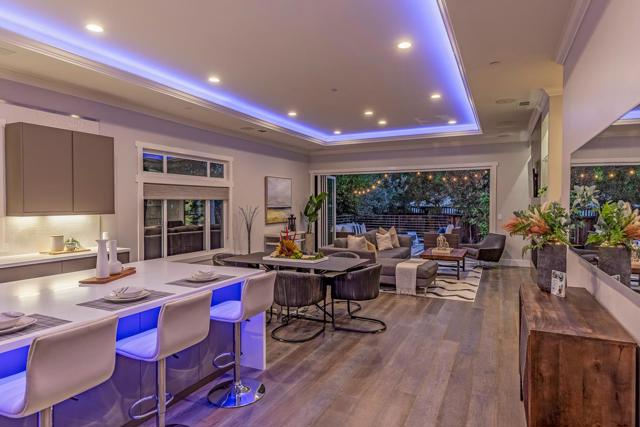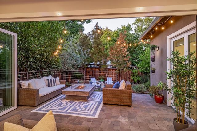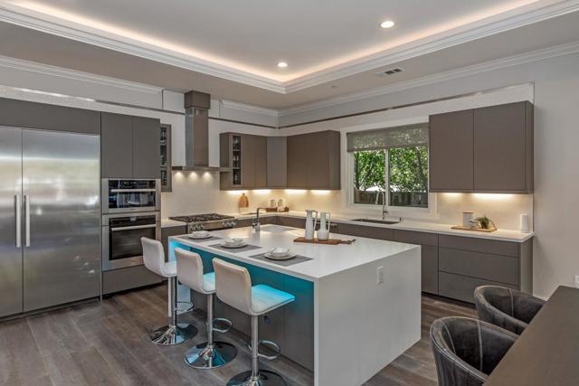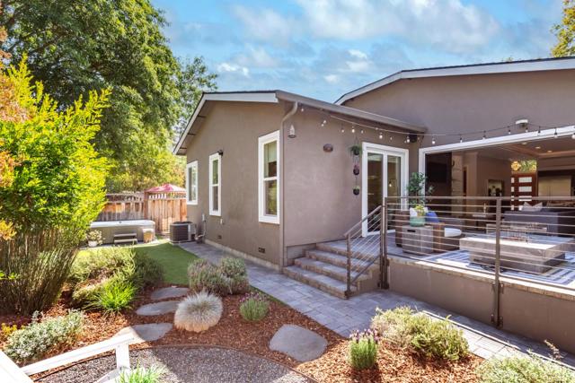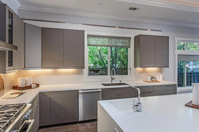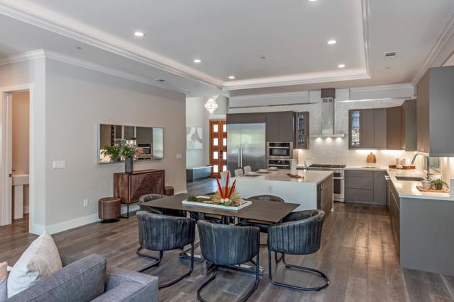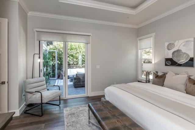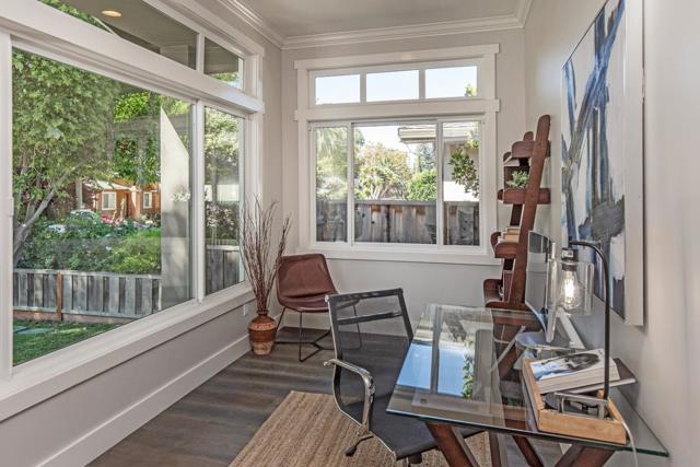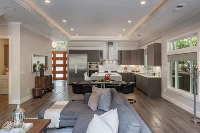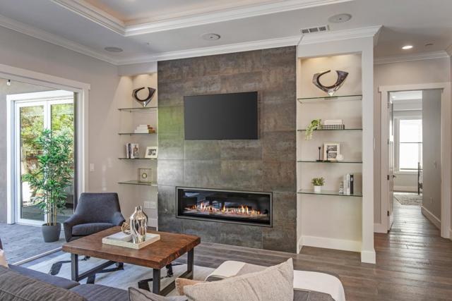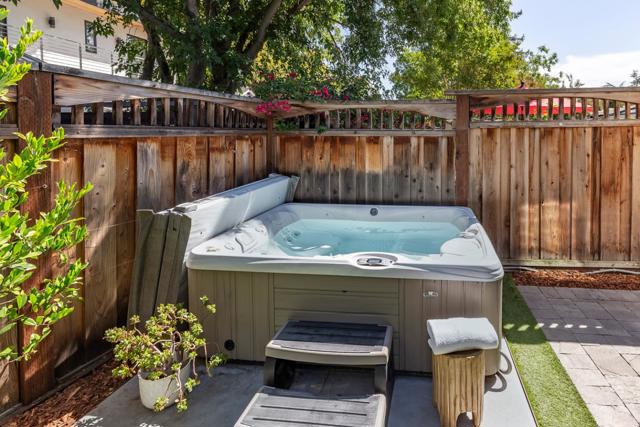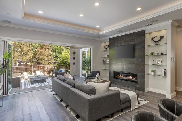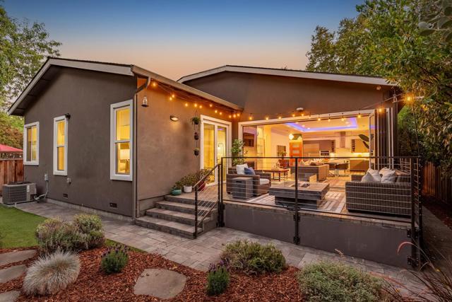 A stunning designer home where each Porcelanosa tile and finish has been carefully selected, open-concept living spaces sit beneath 10-foot ceilings, and Panoramic sliding doors create a seamless connection to the outdoors. In every room you will find cohesive cabinetry, gorgeous deep hued engineered wood floors, and custom features that combine to create a home that feels truly luxurious and thoughtfully curated all the way through. The fabulous great room has tall tray ceilings with remote-controlled uplighting and encompasses the kitchen, dining room and airy living room. The chefs kitchen stuns with an oversized waterfall island topped in specialty Krion countertops, abundant modern cabinetry, and a full Miele appliance suite. The living room enjoys a striking linear fireplace with a to-the-ceiling tile surround and a full wall of sliding doors to the outdoor entertaining space. A front-facing bedroom can be used as a quiet home office, two bedroom suites have gorgeous en suite baths, and the primary suite has wide sliding glass doors to the yard, a customized walk-in closet, and a modern spa bath. The private, low maintenance yard has a large patio, synthetic lawn, and a relaxing hot tub. Luxury living, perfectly placed minutes from Google and downtown Mountain View!