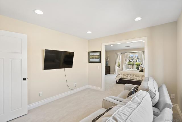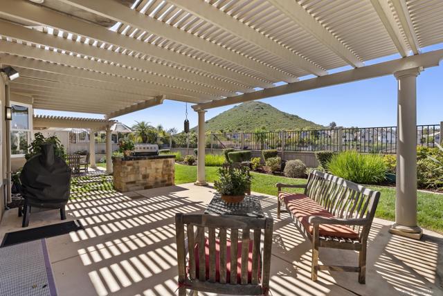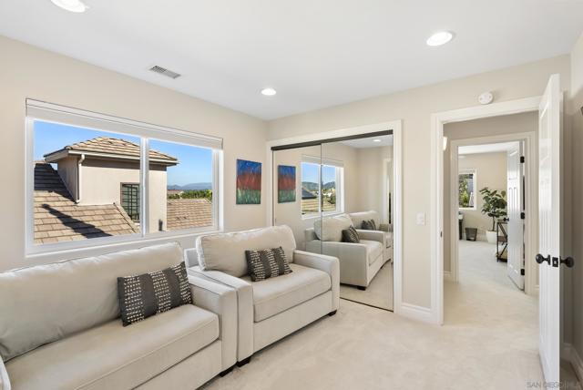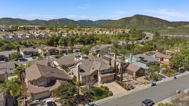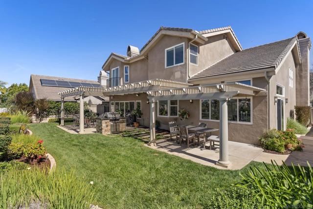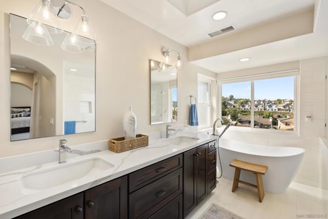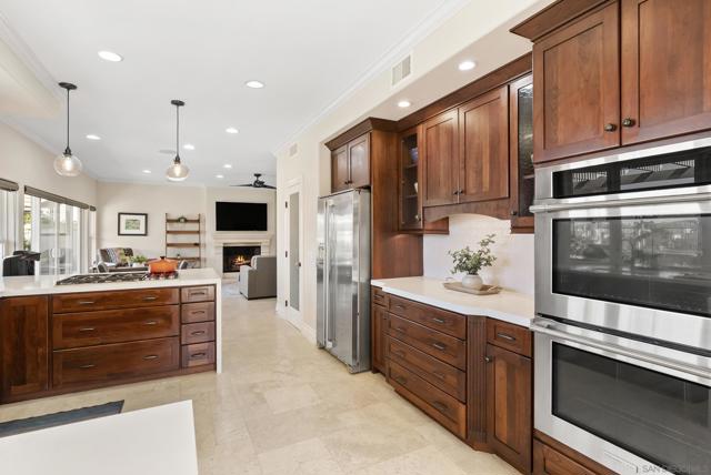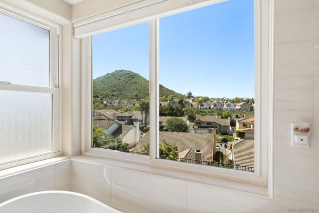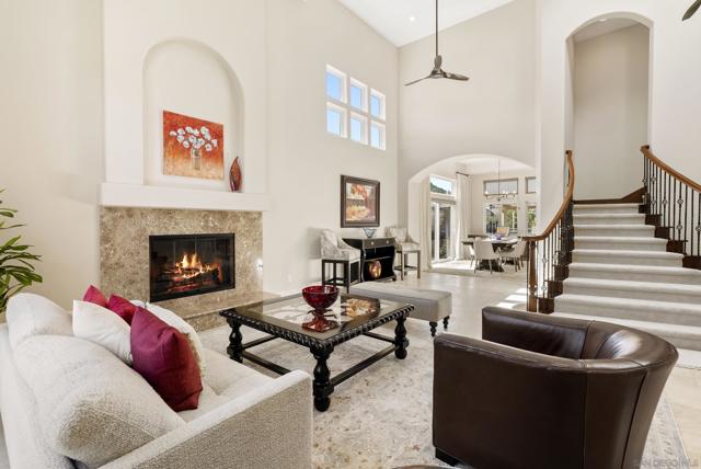 Discover this stunning home in the sought-after Montelena community of Rancho Bernardo, offering nearly 3,000 square feet of thoughtfully designed living space. Featuring 4 bedrooms and 2.5 baths, this residence blends timeless architectural details with bright, open interiors and breathtaking westerly sunset views. Step through the impressive solid wood front door into a dramatic entry highlighted by soaring ceilings and a sweeping staircase. Gorgeous travertine flooring spans the main level, while large windows and multiple skylights fill the home with natural light. The formal living room, warmed by a cozy fireplace, flows effortlessly into the formal dining room, which is highlighted by a tray ceiling—perfect for everything from intimate dinners to festive gatherings. The chef’s kitchen is a true showstopper, boasting quartz countertops, custom cabinetry, double ovens, a five-burner gas stove, a walk-in pantry, and a large bay window with deep counters framing beautiful sunset views. With bar seating and an open layout connecting to both the formal dining room and the inviting family room—complete with its own fireplace—this home is designed for effortless entertaining and everyday living. Upstairs, the spacious primary suite with phenomenal westerly views is a serene retreat featuring vaulted ceilings and multiple windows that fill the room with natural light. The spa-like ensuite bath includes dual vanities, a soaking tub, walk-in shower, and two closets—one walk-in. A secondary bedroom currently serves as a private sitting room adjacent to the primary suite. Two additional generously sized bedrooms and a full bathroom complete the upper level. The backyard patio offers breathtaking sunset views and is perfect for entertaining, featuring a large patio area, built-in BBQ, and plenty of space to relax under the evening sky. Elegant touches such as alabaster sconces, oil-rubbed bronze Baldwin hardware, arched doorways, and wide hallways add character and charm throughout. Residents enjoy membership to the RB Swim & Tennis Club with outstanding amenities including swimming pools, tennis, basketball, racquetball, and pickleball courts, fitness center, sauna, hot tub, playground, wood shop, game room, library, and more. Ideally located near Rancho Bernardo Inn, Bernardo Winery, and Lake Hodges, this home offers an exceptional lifestyle in one of North County’s most desirable communities.