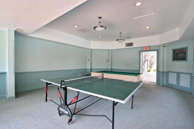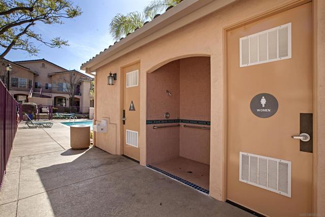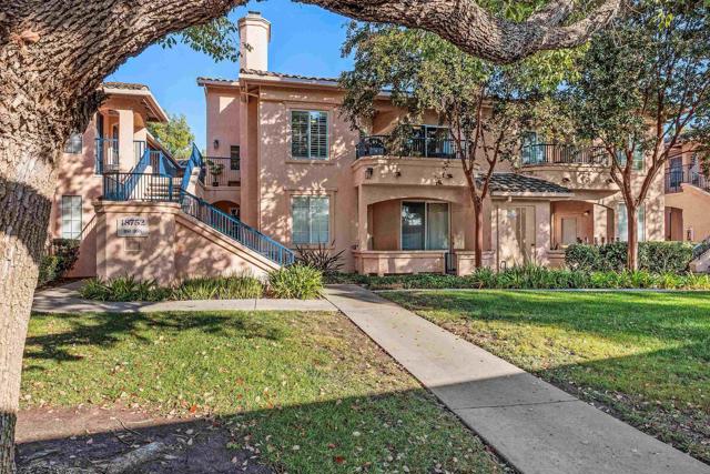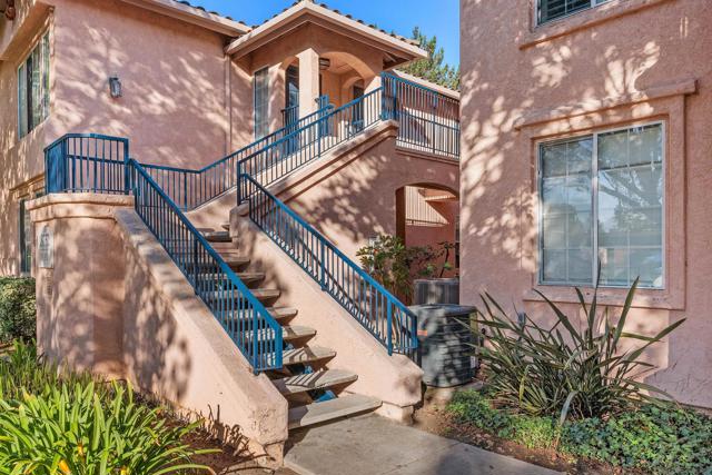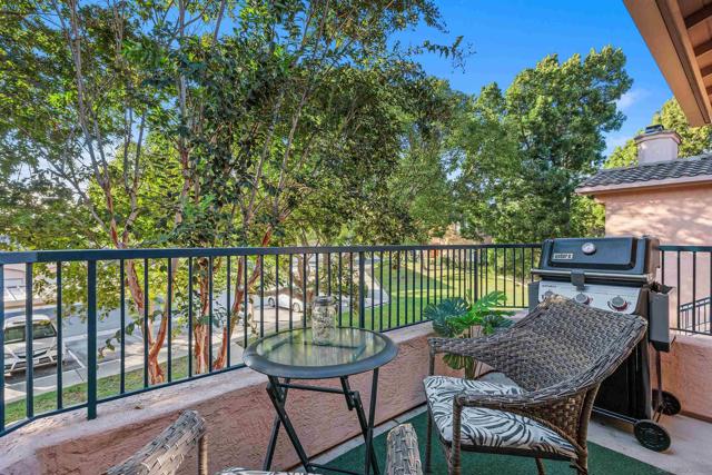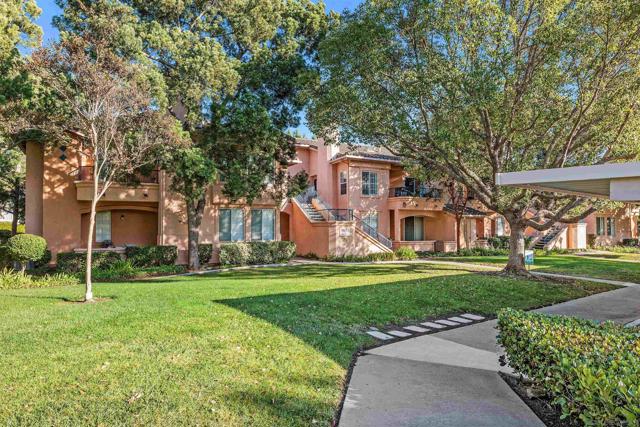 Approximately 716 square feet, this one-bedroom, one-bathroom top floor condominium features a spacious and charming layout with abundant natural light and inviting architectural details. The home boasts dark bamboo flooring throughout the living areas and primary suite, complemented by custom mosaic ceramic tile in the kitchen and tile in the bathroom. The bright and cheerful interior is enhanced by ample cabinetry, stainless steel appliances and a cozy fireplace, creating a warm and welcoming atmosphere. The primary suite offers a large walk-in closet with built-ins, providing excellent storage space. The bathroom is similarly spacious, with upgraded lighting and fixtures. In unit laundry for convenience. The home's exterior showcases lush landscaping, a spacious balcony with scenic views of the greenbelt and mature trees, offering a private and serene retreat. The community amenities are resort-style, featuring pools, spas, a fitness center, tennis courts, pickleball, a recreational room and a clubhouse near a picturesque pond. The gated community also provides assigned parking in front of the building, as well as plenty of guest parking, ensuring convenience for residents. Ideally located with easy freeway access and close to shopping, this condominium offers a comfortable and well-appointed living experience. Acclaimed Poway Unified Schools.