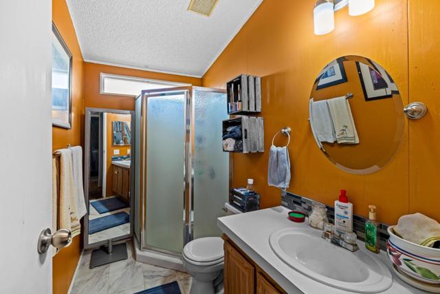 You need to see this one! This cheerful and updated double-wide home in an all-age park offers approximately 1,456 sq ft of comfortable living space with 3 bedrooms and 2 bathrooms including a freshly remodeled primary bath you'll love including new porcelain bathtub, sink, tiled vanity, toilet, tiled shower tub area, bathtub fixtures, sink fixtures, new tile flooring. The vibrant backsplash in the kitchen adds personality and warmth and with the same coordinating color in the breakfast nook makes for a cheerful area. Kitchen comes equipped with a newer stove, range hood, faucet, garbage disposal, and updated light fixtures in both the breakfast nook and dining area. Enjoy the ease of an indoor laundry room, another perk is the digital thermostat. Newer front porch with steps and a security screen door, covered carport, and an outdoor storage shed. Even better this home is perfectly located just across from guest parking and short distance to the community pool and post boxes. You will appreciate easy access to schools, shopping, and for the commuters highway access.. Everything about this home says comfort, convenience, and style. Don't miss your chance this is the one you've been waiting for!