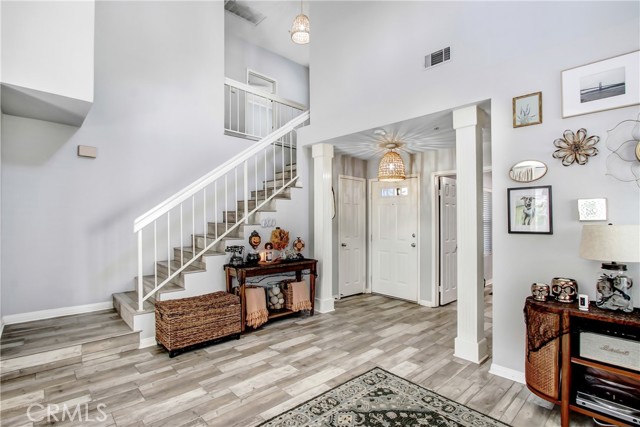 Available now! Unique opportunity to rent in the Master Planned East Highland Ranch, Enclave Community! This property boasts 3 bedrooms; two and a half bathrooms attached two car garage. Upon entering you are wowed away with the dramatic cathedral ceilings that open up to the formal dining and living room. There is a cozy built in bench in the family room to enjoy your morning coffee! The formal dining has French doors that open to a low Maintenace enclosed backyard. This property also offers a bedroom downstairs with a guest 1/2 bathroom. The kitchen is equipped with a gas stove, dishwasher and built in microwave. Dishwasher and built in microwave not warranted, maintained nor replaced during tenancy. Modern white kitchen cabinets, built in dish curio and custom pantry drawers. Breakfast counter wraps the kitchen Counter. The family room completes the 1st floor with a gas fireplace and stone fireplace surround. Additional French doors lead to the backyard. The stairs lead to the second level of the condo where you find the primary bedroom, walk in closet with ensuite bathroom. The primary host a balcony for fresh air and additional outdoor space. The 3rd bedroom is in the hallway and shared by the full-size hall bath. Laundry room located on 2nd floor with washer and dryer hookups. Updated laminate wood flooring and porcelain tile thought-out. Central Air and Heat. Ceiling fans in each of the bedrooms for extra cooling. One shared wall with your neighbor!