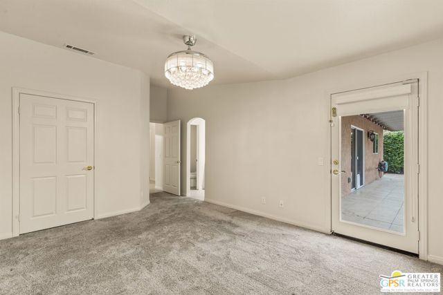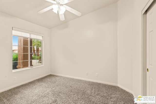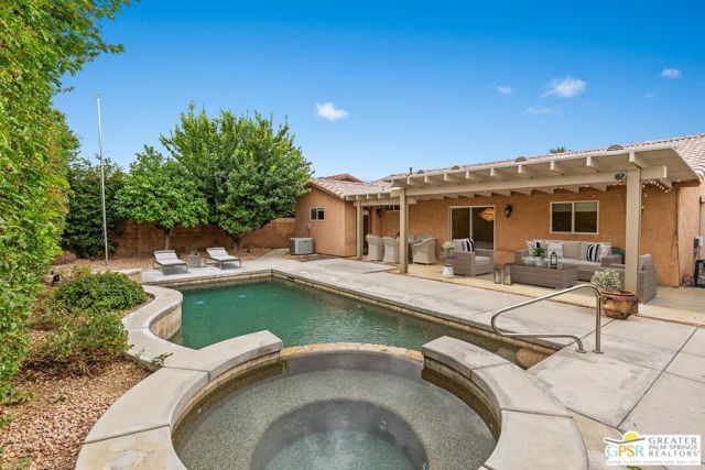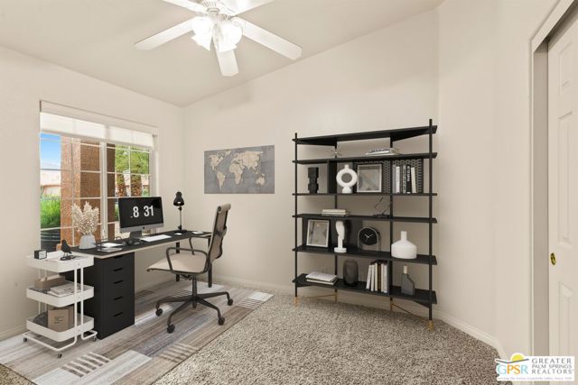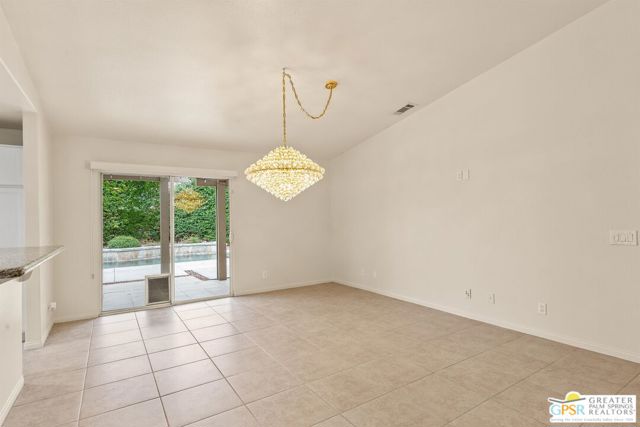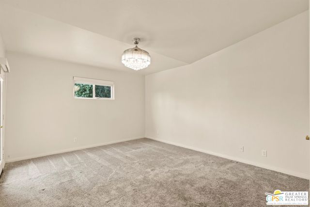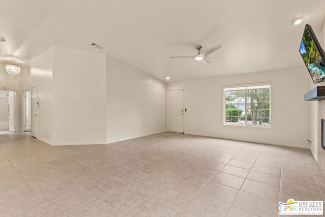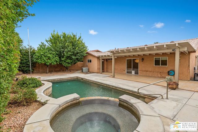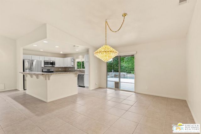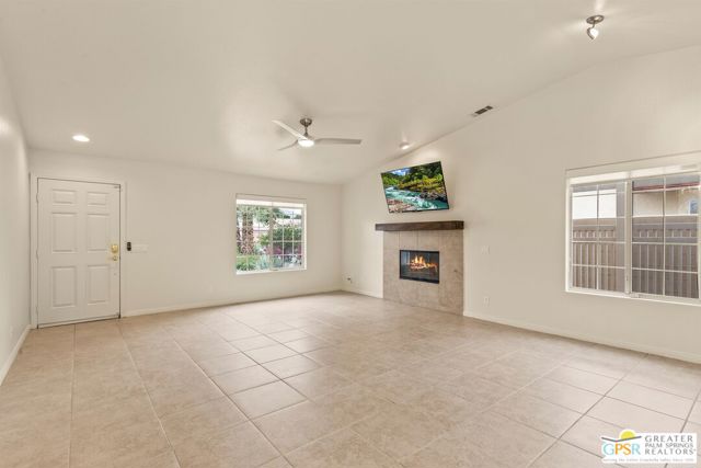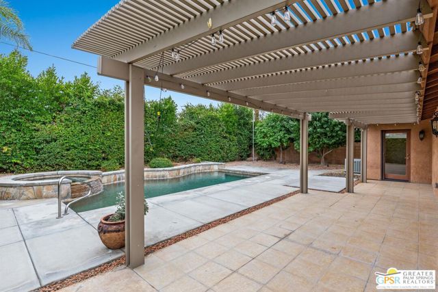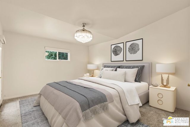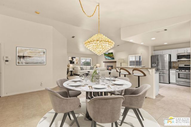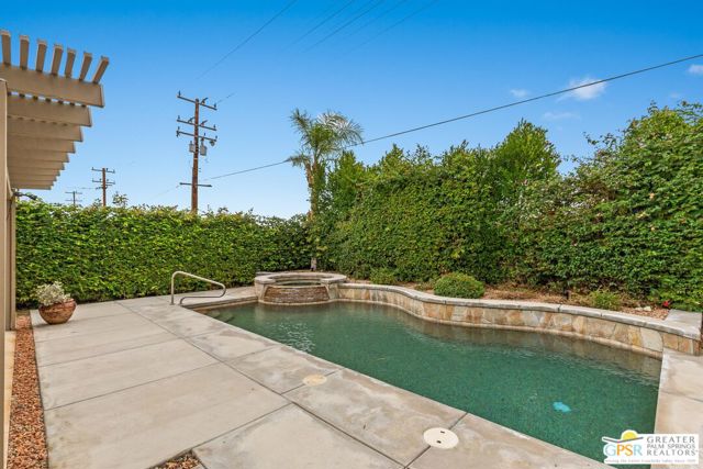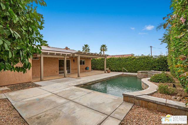 Refreshed! Revitalized! Ready for move in and your personal touch. Nestled in the South End of Palm Springs, this three-bedroom, two-bath, energy efficient home with 21 owned solar panels combines desert tranquility with convenience and economy. Located in a secluded neighborhood, yet less than 1.5 miles from shopping and restaurants, it offers a peaceful retreat that remains closely connected to the life of the city. Inside, an open floor plan filled with natural light creates a welcoming atmosphere. The living room, with its fireplace, flows into a kitchen featuring granite countertops, ample work space, and modern appliances. A versatile dining area, accented by a striking chandelier-style light fixture, can easily shift from casual meals to more formal gatherings. The larger-than-average for this size home 21-panel solar system reduces and eliminates electrical bills especially during the hot summer months. The primary bedroom, two additional bedrooms (one for guests and one for an office), ceiling fans throughout, a dedicated laundry area, and double car garage, add to the home's comfort and functionality. Out back, a private yard with a pebble tech pool and spa offer a personal resort experience just steps from the door. Mature landscaping and citrus trees form a calm, secluded oasis. A covered patio invites outdoor dining and entertaining. Recreation is close at hand: Tahquitz Creek Golf Course and its driving range, city pickleball courts, the CV Link walking and biking path, and numerous hiking trails are all nearby. Together, these features make this home an appealing choice for anyone seeking a comfortable, efficient and economical home that fully embraces the Palm Springs lifestyle. Furnishings shown are digitally generated and not in the home.