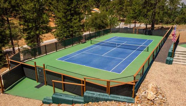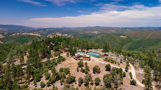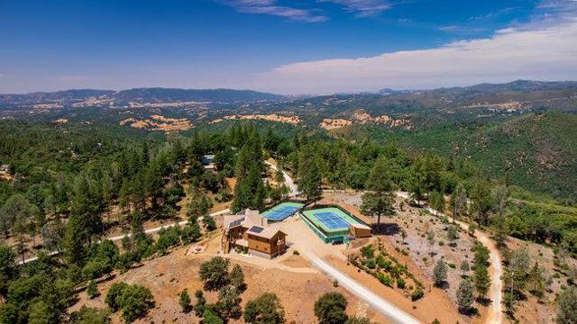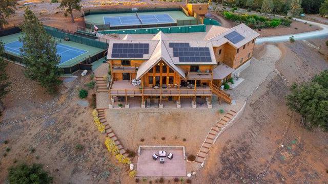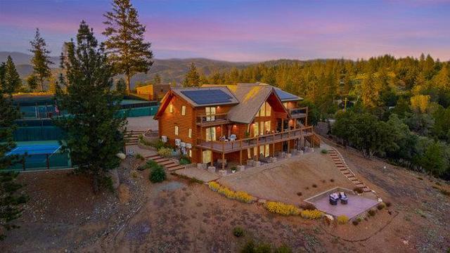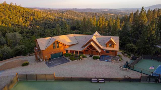 Extraordinary opportunity awaits buyers seeking a private estate, luxury vacation rental, duplex, or boutique inn conversion. This architectural masterpiece offers over 8,000 sq. ft. of breathtaking log construction on 5 scenic hilltop acres in Murphys, ideally situated between Lake Tahoe and Yosemite. Originally designed and built as an award-winning Bed & Breakfast by renowned Bay Area tennis professionals, this meticulously maintained property blends rustic elegance with modern infrastructure. The estate features: guest suites with ensuite baths, professional-grade commercial kitchen, dramatic 23-foot Great Room with a 10' stone fireplace & wet bar, Loft/Library, game room, Office/Den, oversized laundry room, massage room, private apartment w/separate entrance and second kitchen. Outdoor highlights include: Two regulation-size tennis courts, Dual EV chargers, Tesla Powerwalls, Generac backup generator, Two central A/C units plus eight mini-splits, Quadruple water filtration system, on-site well servicing gardens and filtered water supply, drought-tolerant professional landscaping. Enjoy sweeping 360° panoramic views from this commanding hilltop setting. A rare opportunity to own the real estate not the business and reimagine this exceptional property to suit your vision.