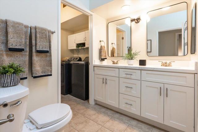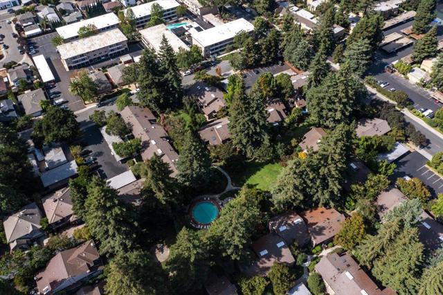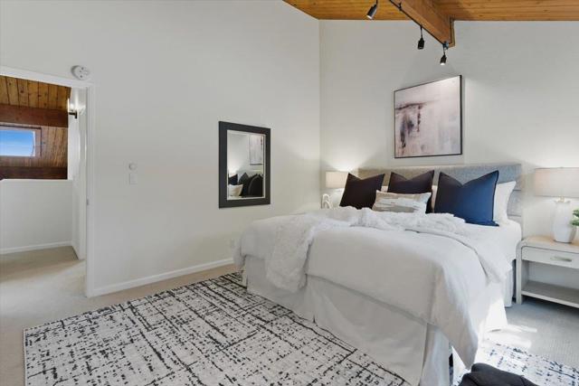 This beautifully updated 3 bedroom, 2 bath Cypress Point Villas townhome combines a tranquil setting with unbeatable convenience. Just steps from Downtown Mountain View, Caltrain, Light Rail, and Stevens Creek Trail, with easy access to Hwy 85, 237, 101, and Central Expressway. A spacious open floor plan is highlighted by wood vaulted ceilings in the living room and upstairs bedrooms, large windows, and sliders that open to the wraparound deck, creating the ideal indoor-outdoor space for entertaining or relaxing by the nearby pool. The modern kitchen features shaker cabinets, Fischer Paykel and Bosch appliances, ample counter space, a breakfast bar, and a large storage area under the staircase. A bedroom and full bath downstairs provide the perfect space for guests or a home office. Upstairs are two spacious bedrooms, a bathroom with tub and shower, laundry, and a private deck overlooking the green space. The primary bath includes a new double-sink vanity with quartz countertop and undermount sinks. Additional features include custom, stylish, and functional Hunter Douglas Smart shades with blackout in all bedrooms, central AC, new carpet and paint, covered parking conveniently adjacent to the front door, and a private storage area. Move-in ready and ready to make your home!