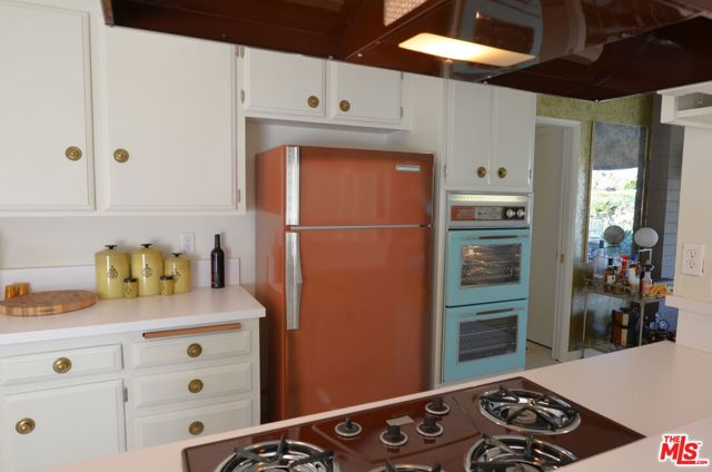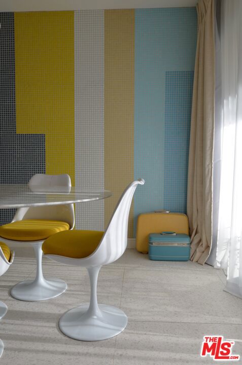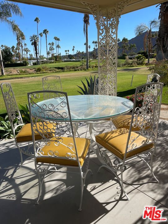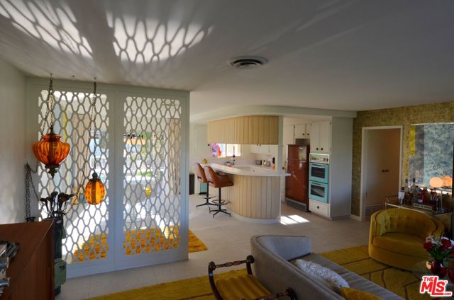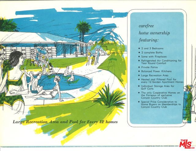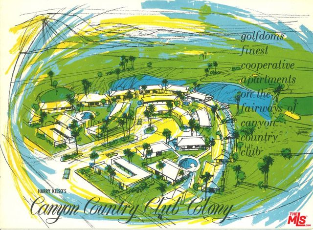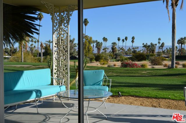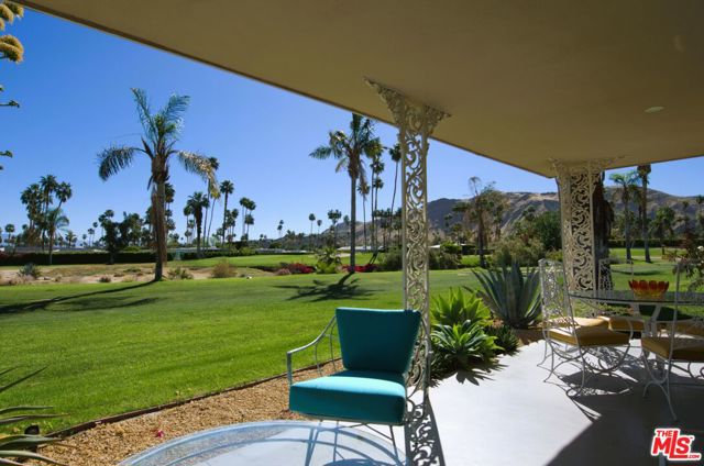 (Back on the Market 10/1) Live the authentic Modern life in this stylish and spacious condo in Palm Springs' finest neighborhood. Featured prominently in the new book Canyon County Club: History and Design of Palm Springs' Garden of Eden, Canyon County Club Colony is a historic, well-preserved and well-maintained community of just 38 units on over 5 acres of land. Designed by Raymond Levanas, AIA, this condominium offers direct golf course views across the fairways of the historic Indian Canyons North golf course on one side, with pool and Mt. Jacinto views on the other. Glass sliders in all rooms provide access to five patios, creating a seamless indoor-outdoor living experience that feels more like a house than a condominium. Restored and renovated in 2021, this unit features new 30" terrazzo tile floors throughout, smooth plaster ceilings, and fresh paint inside and out. The kitchen offers restored vintage appliances, professionally painted original cabinetry, and new Formica counters. The third bedroom is currently utilized as a den/media room, complete with a custom walnut entertainment center. Custom wallpaper flourishes and vintage door and cabinet hardware throughout complete the vintage charm. System upgrades in 2021 include a new insulated foam roof, new electrical panel, new water heater, and a new HVAC system to ensure your modern comfort. Most furnishings available outside of escrow. Large exterior storage unit. Two dedicated parking spaces (side-by-side).