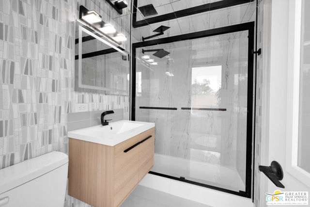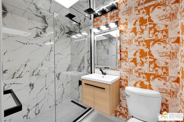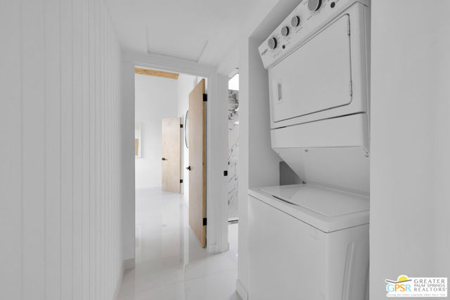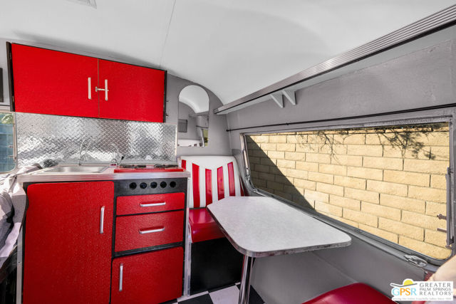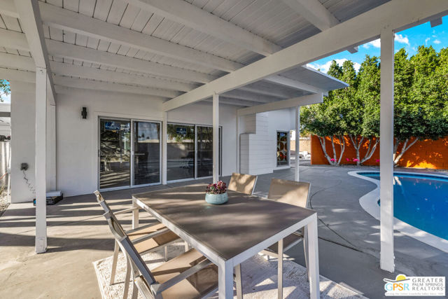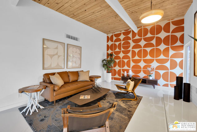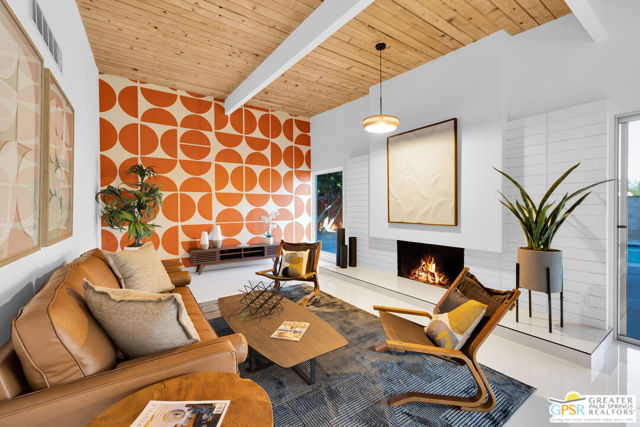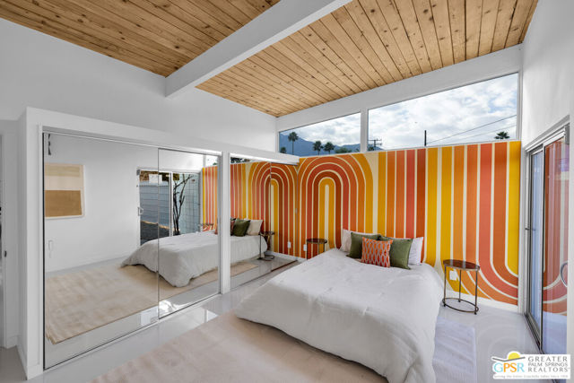 SMASHING!! Gorgeous Mid Century Modern, Alexander Butterfly, Palmer and Krisel, Visionary Architects popularised the Le Corbusier's V shaped roofline in the 1950's. The BUTTERFLY is the STAR of Palmer/Krisel's Mid Mod design in Palm Springs. This home has been completely refurbished, New Kitchen, New Bathrooms with fun Mirrored Ceilings, New Windows and Sliders with Dual Pane Glass throughout, New Tile, New Pool Plaster and Tile, New Roof, New AC, Lights, Decking, Paint Inside and Out. New Hot Tub, New Gazebo, Also has Original Fab Floating Fireplace, Putting Green, Bocce Ball Court, Firepit, Leased Solar 23 Panels, Exquisite Western Mountain Views and the Piece De Resistance; A 1960's CAMPER, Red and Silver, Sleeping for 2, Two Burner Stove (Gas), Sink, Dining Table with 2 Chairs, Come see and enjoy The Butterfly, The STAR MCM Design located on STARR Road.