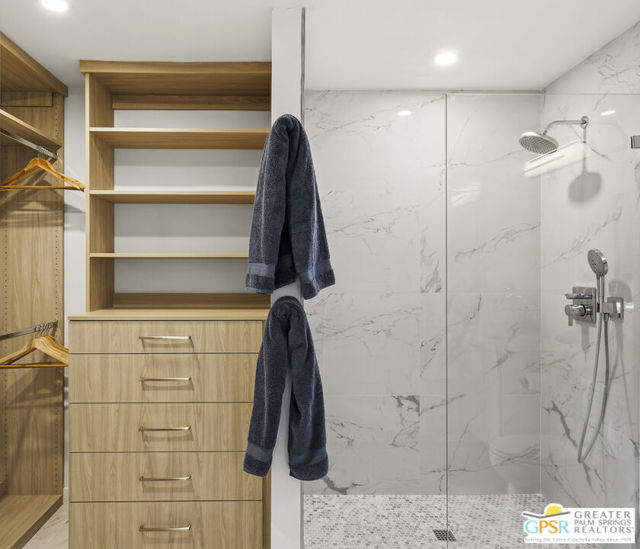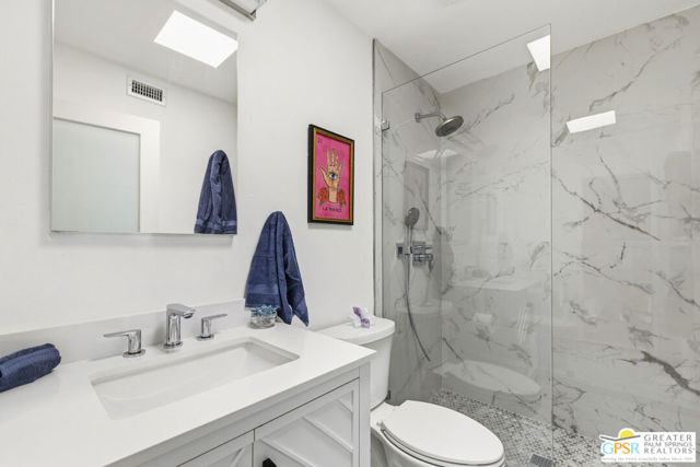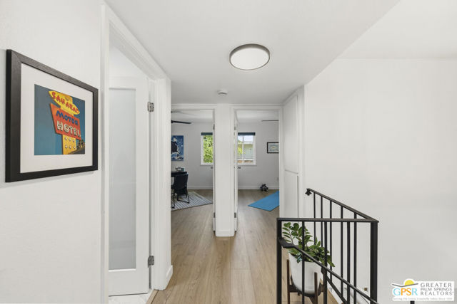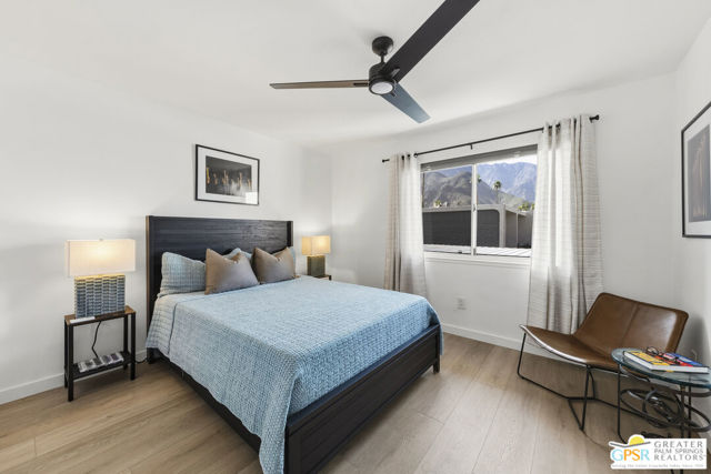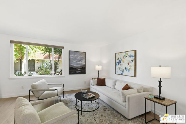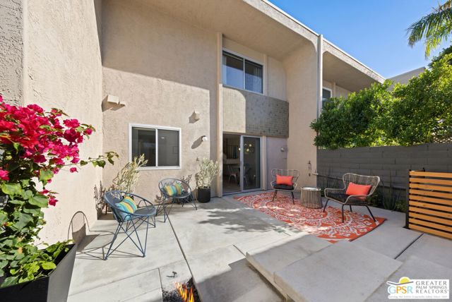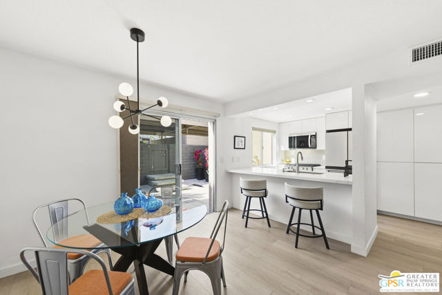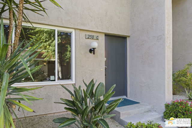 Welcome to 250 E Via Escuela #C in the gated Indian Canyon Gardens community. This is your opportunity to own a fully renovated, high end remodel with a show-stopping staircase with open risers that separates the living and dining areas. Newly installed luxury vinyl plank flooring throughout, freshly painted throughout, all new electric plugs, switches, dimmers and screwless switch plates. The kitchen has white, high gloss, flat panel cabinetry with a gorgeous backsplash, stunning quartz counters and brand new stainless appliances. Nearby is the laundry area with a top loading washer and matching dryer. The newly renovated powder room completes the first floor. Upstairs the primary bedroom has been remodeled, has mountain views and has newly added primary bath with large format porcelain tile and Hans Grohe fixtures. To complete the primary suite is a thoughtful closet organization system. There are 2 additional bedrooms and a renovated guest bath with the same high end finishes. Brand new 18 SEER HVAC system, brand new Navien Tankless hot Water heater, dual pane windows throughout, ceiling fans in each of the bedrooms, plus new window coverings make for a very energy efficient condo. This well appointed home includes the furniture and furnishings with some exclusions. Outside, your private west facing patio space is perfect for relaxing and entertaining. Benefit from two side by side carport parking spaces and adjoining storage both with direct access to your patio. Dive into one of two sparkling pools or unwind in the spas within this well maintained and landscaped community. With its prime location, sought-after amenities, and low HOA fees, this Palm Springs retreat is ready for you to call home!