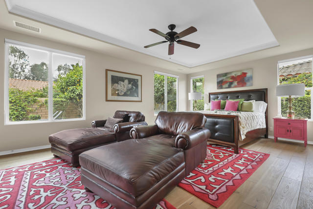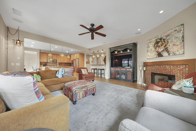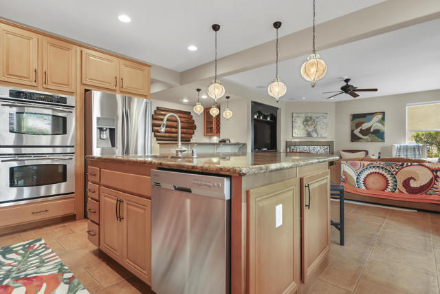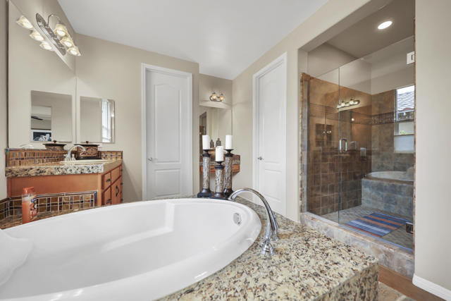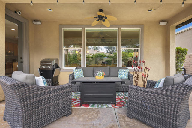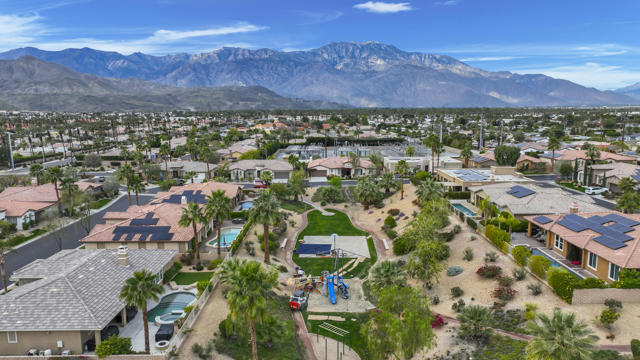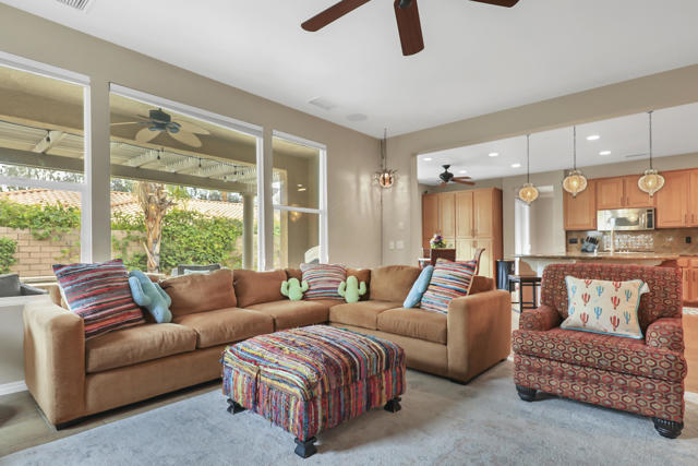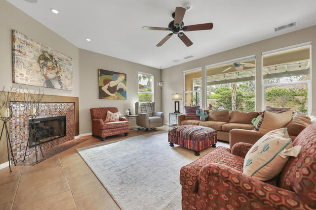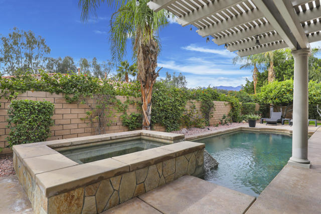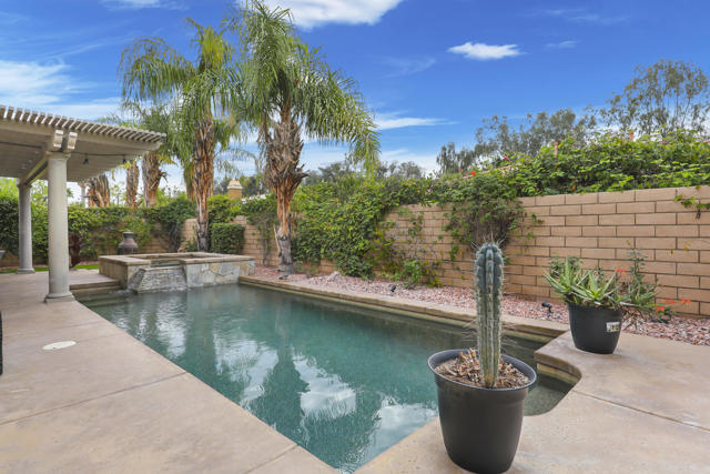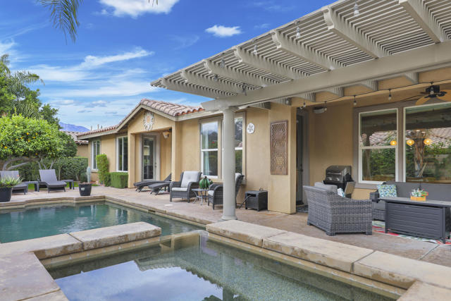 Lovingly maintained by its original owner, this well-appointed home blends comfort with purposeful design. A traditional floor plan provides well-defined living spaces for everyday living and entertaining, complemented by a spacious kitchen adjoining the main living area and a versatile flex space currently utilized as a formal dining room. The kitchen is outfitted with abundant cabinetry featuring pull-out shelving, stainless steel appliances, an oversized island, and a sunny breakfast nook. The living room is complimented by a glass-tiled fireplace and a fully equipped wet bar with a sink, wine rack, and custom cabinetry, seamlessly connecting the kitchen and living spaces. The primary suite is generously sized and features dual vanities, two walk-in closets, a soaking tub, and a large walk-in shower with bench seating. Two secondary bedrooms share a Jack-and-Jill bathroom, while the additional bedroom enjoys its own private en suite. Outdoor living is equally inviting, with mature landscaping creating a private retreat. The backyard includes a PebbleTec saltwater pool and spa, misting system, extended alumawood patio cover, plenty of seating areas, and mature lemon, orange, and lime trees ideal for both relaxation and entertaining. Additional highlights include updated dual HVAC systems, new hot water heater, new pool salt cell, surround sound throughout, Vivint security system with cameras, laundry room with utility sink, and an epoxied garage floor. Located within the gated community of Mission Shores, residents enjoy scenic lake and mountain views, complemented by close proximity to premier desert amenities. The HOA provides front yard landscaping, cable and WiFi, lake access, a community park with playground and basketball court, and well-maintained common areas. Ideal as a primary residence, second home, or desert getaway, this property offers both comfort and convenience.