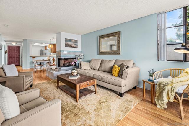 Coastal living in this rarely available ground-floor, end-unit 2-bedroom, 2-bath condo offering exceptional privacy with only one shared wall. Designed with a beach-inspired concept, this home features engineered wood flooring, tile throughout, beach-rock finishes, and large windows that flood the space with natural light. The spacious living room is highlighted by a fireplace with an oversized hearth, creating a warm, sophisticated ambiance ideal for entertaining or unwinding. Enjoy tastefully remodeled bathrooms, forced-air gas heating, and the convenience of in-unit laundry. Includes assigned covered garage parking plus easy street parking for guests. Located in a beautifully maintained community with a Community Room and BBQ area, and just moments from restaurants, bars, coffee shops, shopping, Shelter Island, and the San Diego Yacht Club. A standout opportunity for young professionals, first-time buyers, or anyone seeking the Point Loma lifestyle.