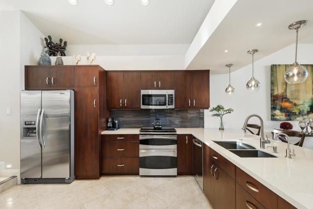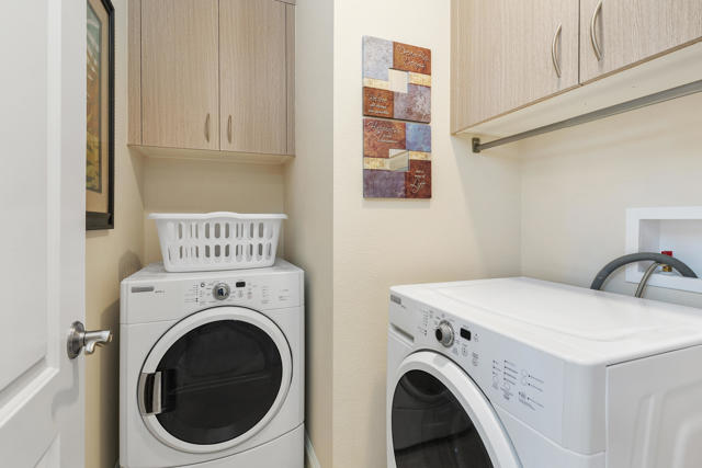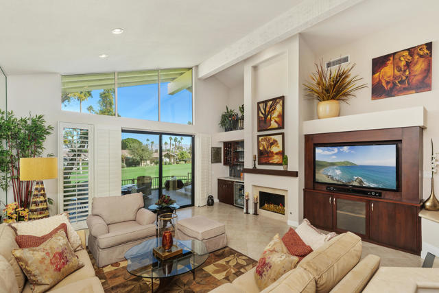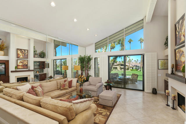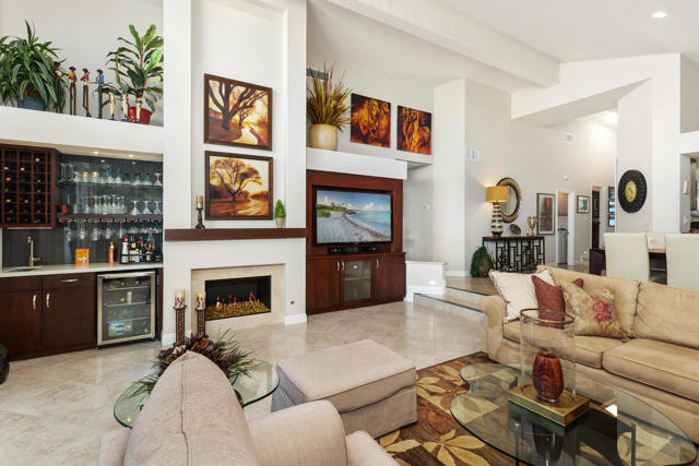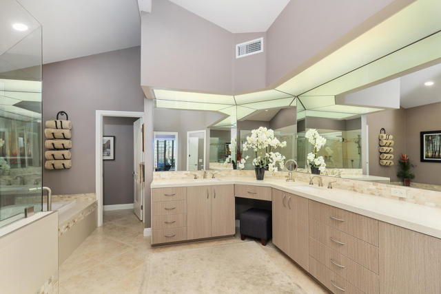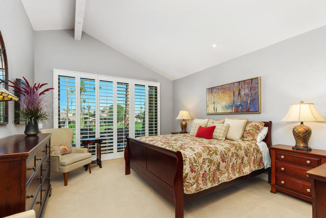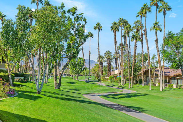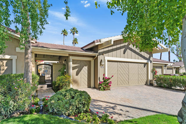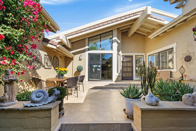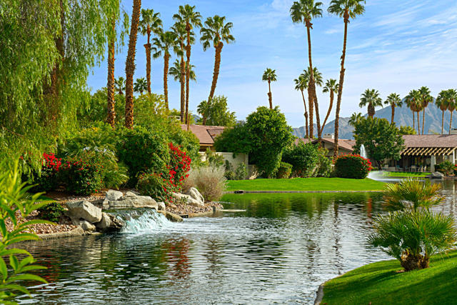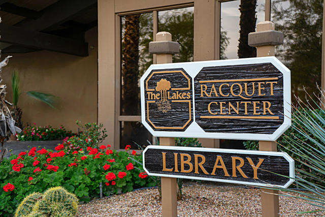 You won't want to miss this impeccably maintained, highly upgraded two-bedroom + Den, three-bathroom Dallas model. High vaulted ceilings with transom windows creates an open and airy atmosphere, with golf course views easily enjoyed from the main living areas. The open floorplan of almost 2,300 SqFt features two primary bedrooms, with a den that could be easily converted to a third bedroom. Floor to ceiling decor lighting creates a warm ambiance to highlight the custom millwork. Loads of seating with front and back patios. Expansive upper and lower conversation areas, showcase the mountain and distant water feature views from the golf course patio off the living room. While the sunny, tiled front courtyard is a private outdoor entertaining space, complete with built-in BBQ. There is direct access to the garage from the front courtyard and the house. The upgraded finishings extend into the oversized 2 car + golf cart garage with built in cabinets. This home comes TURNKEY FURNISHED with designer furnishings, allowing for a seamless move-in experience. Golf cart included!! The Lakes Country Club offers several dining options, 27 holes of golf, tennis, pickleball and 44 swimming pools located conveniently throughout the private guard-gated community.